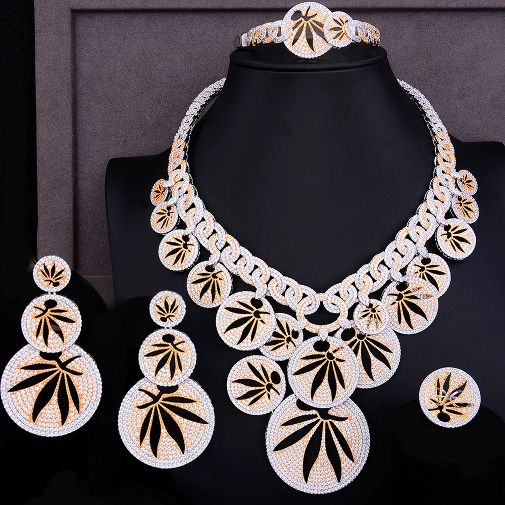 Gorgeous Brand New Luxury Exclusive Leaf Necklace Bangle Earrings Ring Jewelry Set for Bridal Wedding Women Noble Show Jewelry