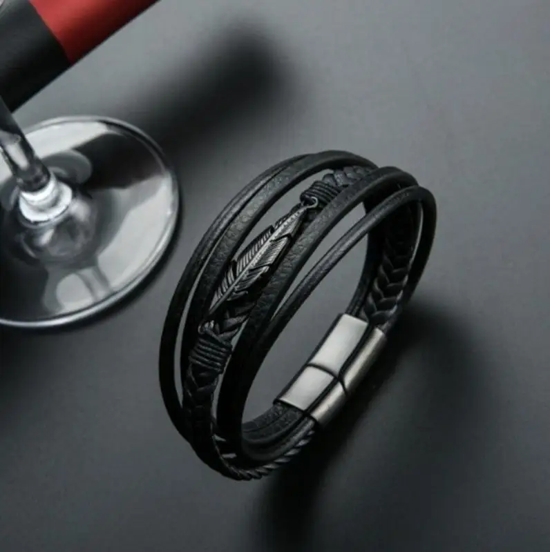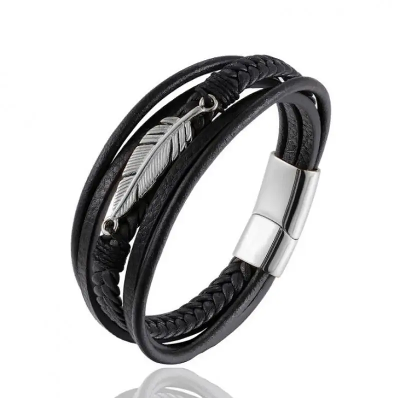 Leather Bracelet - Men Classic Stainless Steel Feather Magnetic Buckle Multilayer Leather Bracelet Casual Charm Jewelry