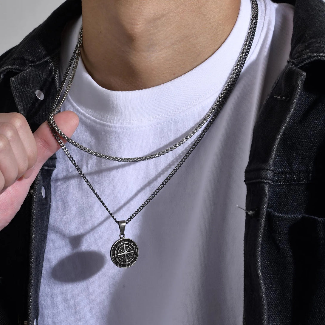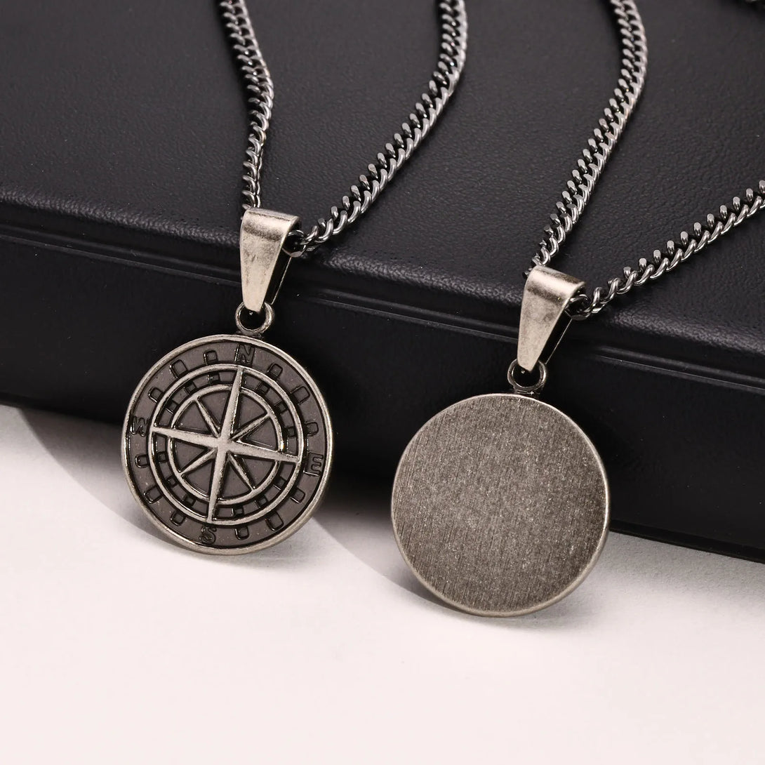 Men Retro Silver Color Seeker Compass Necklaces, Rock Punk Vintage Metal Stainless Steel Round Coin Pendant Collar Gift Jewelry