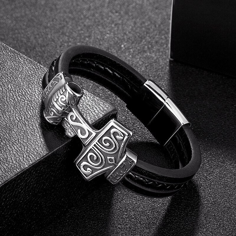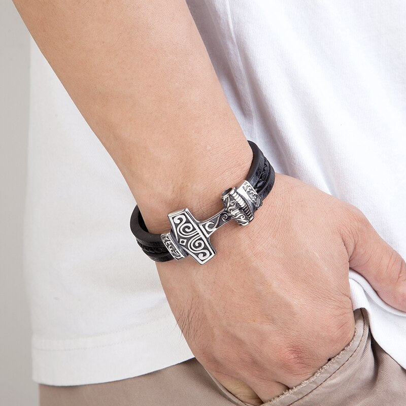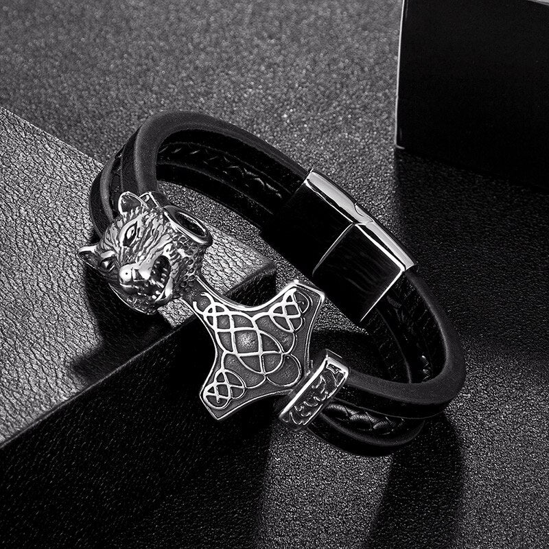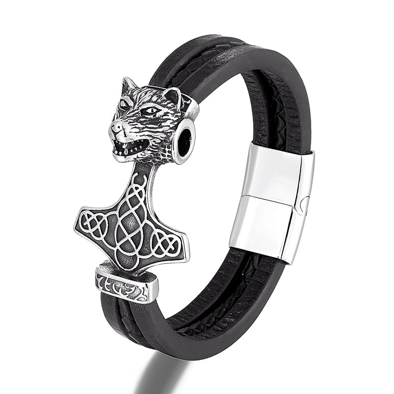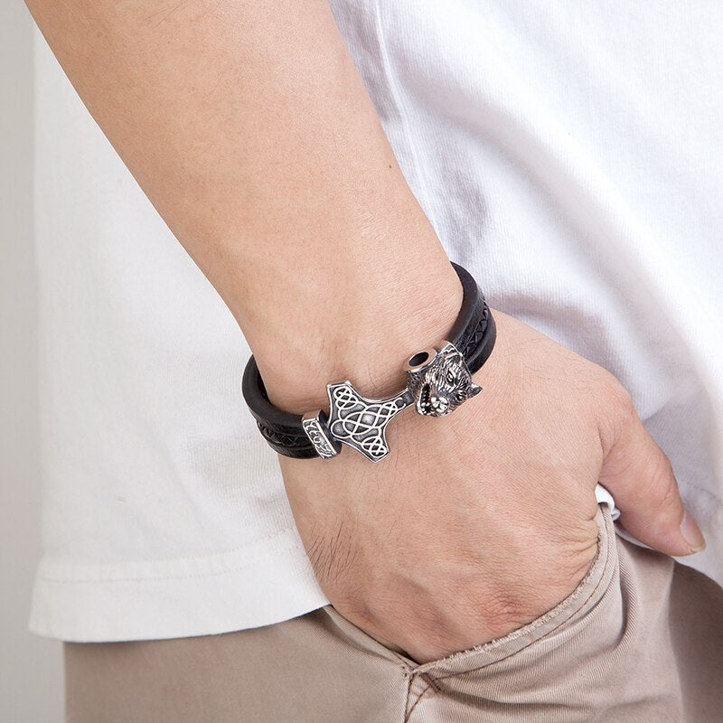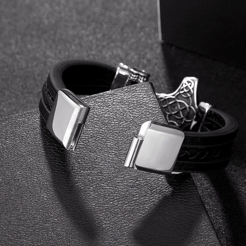 Men Stainless Steel Viking Bracelet Wolf Vintage Jewelry Retro Punk Rock Style Motorcycle Accessories Magnet Clasp Leather Gifts