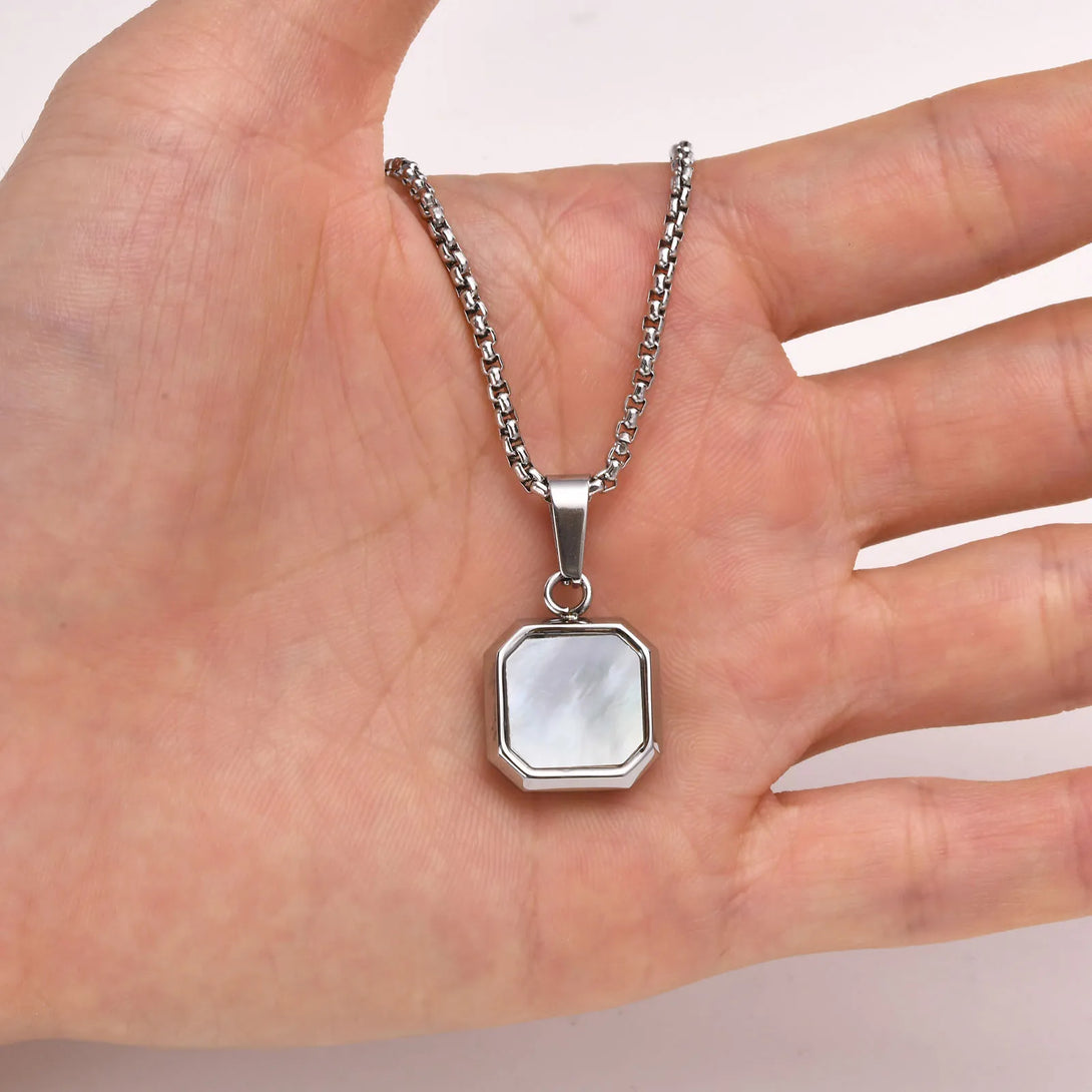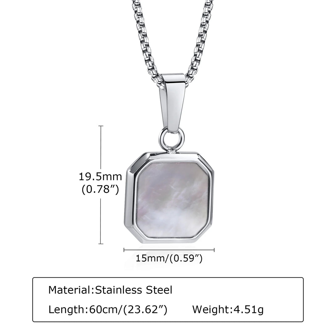 Men Stylish Geometric Square Stone Necklaces, 15mm Shell Pendant with Box Chain, Casual Male Boy Neck Collar Gifts Jewelry