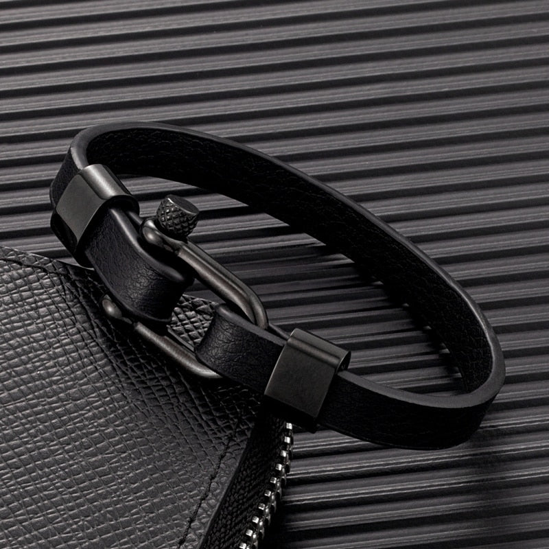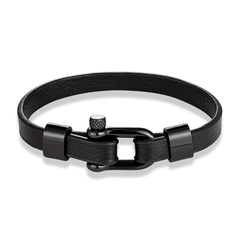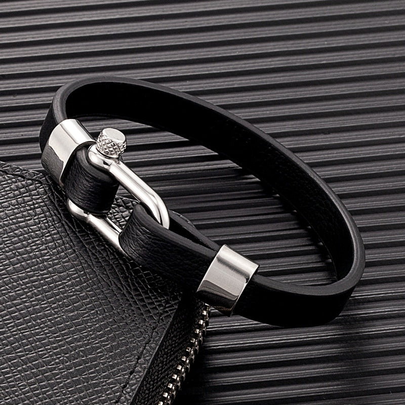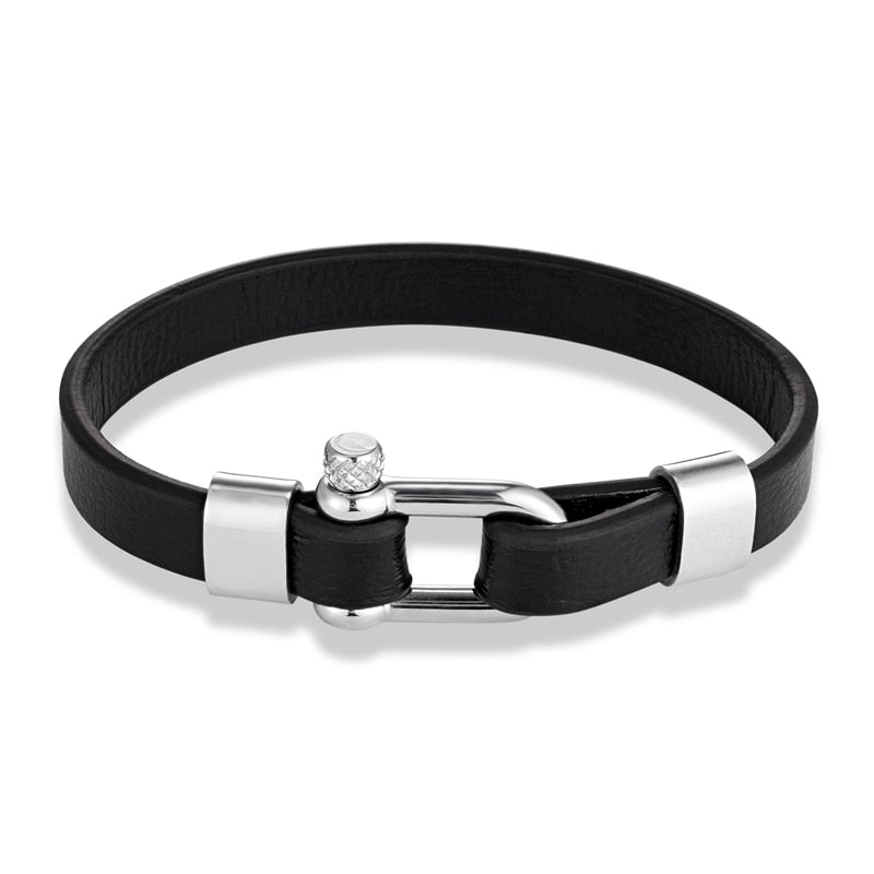 Leather Bracelet- Men Women Black/Gold Stainless Steel U shape Biker Leather Bracelet Screw Shackle Buckle Bangle Wristband Couple Jewelry