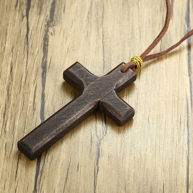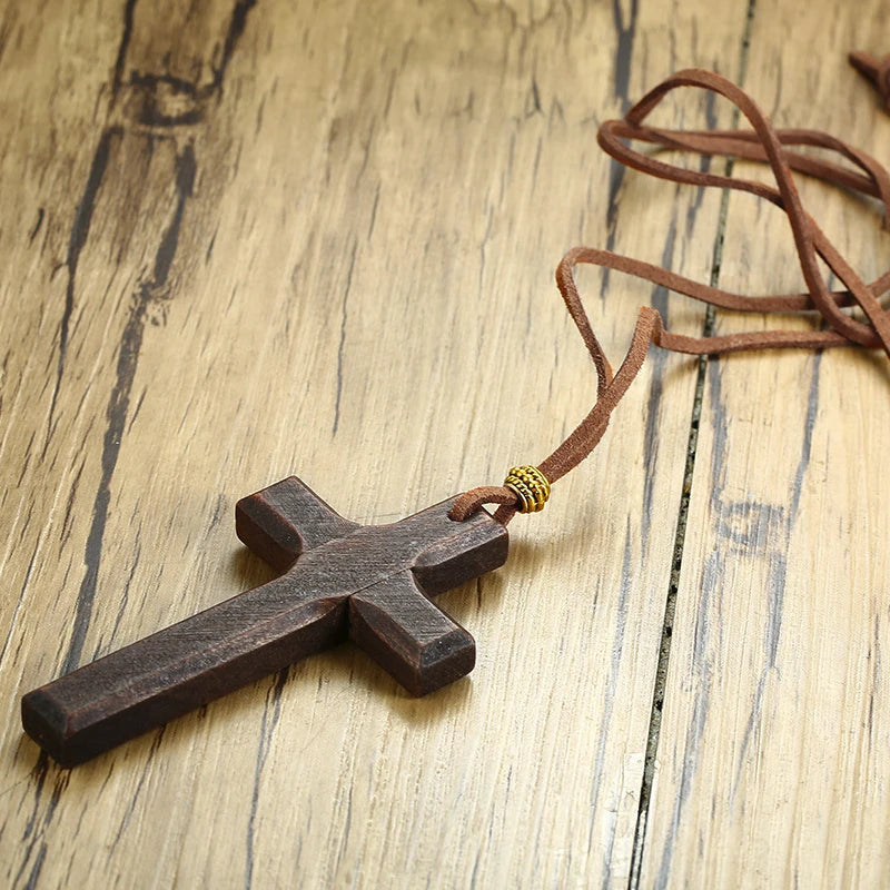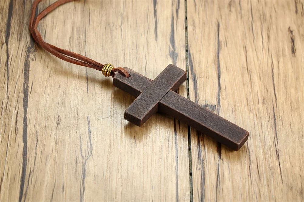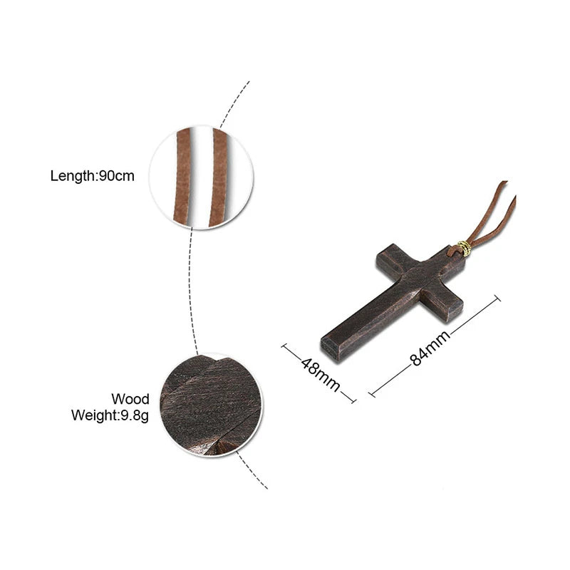 Men Wood Cross Crucifix Pendant on Cord Necklace