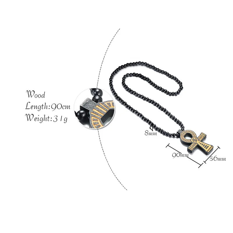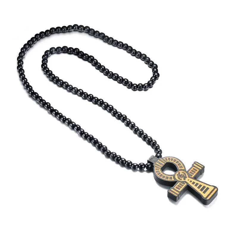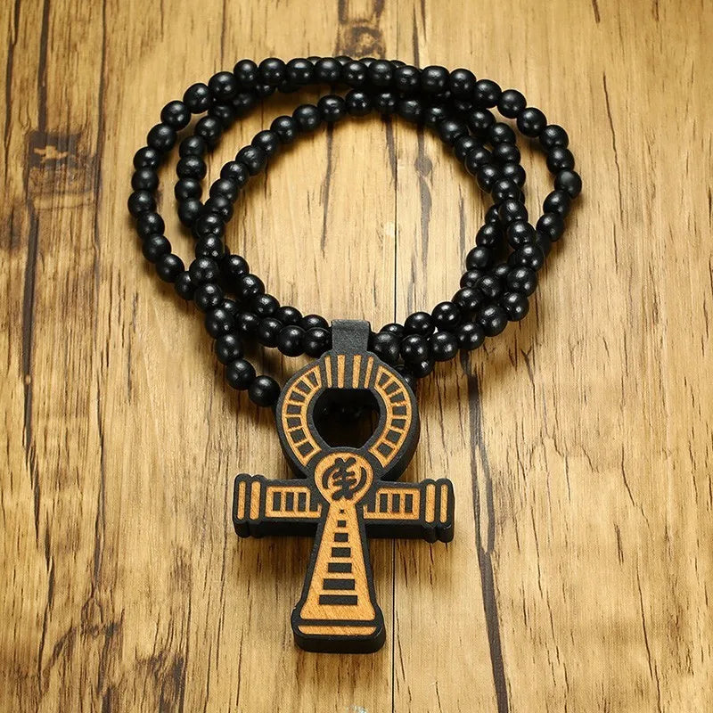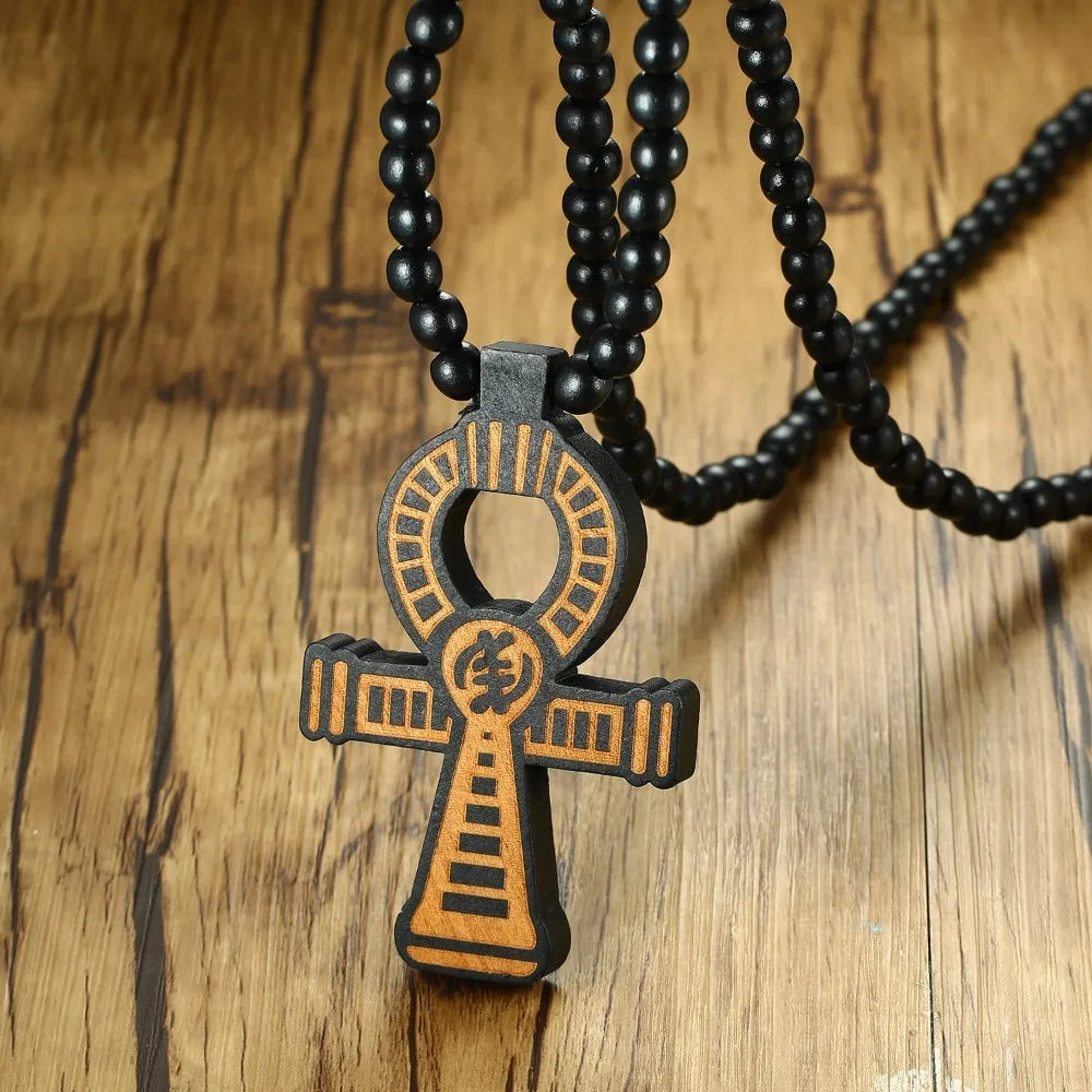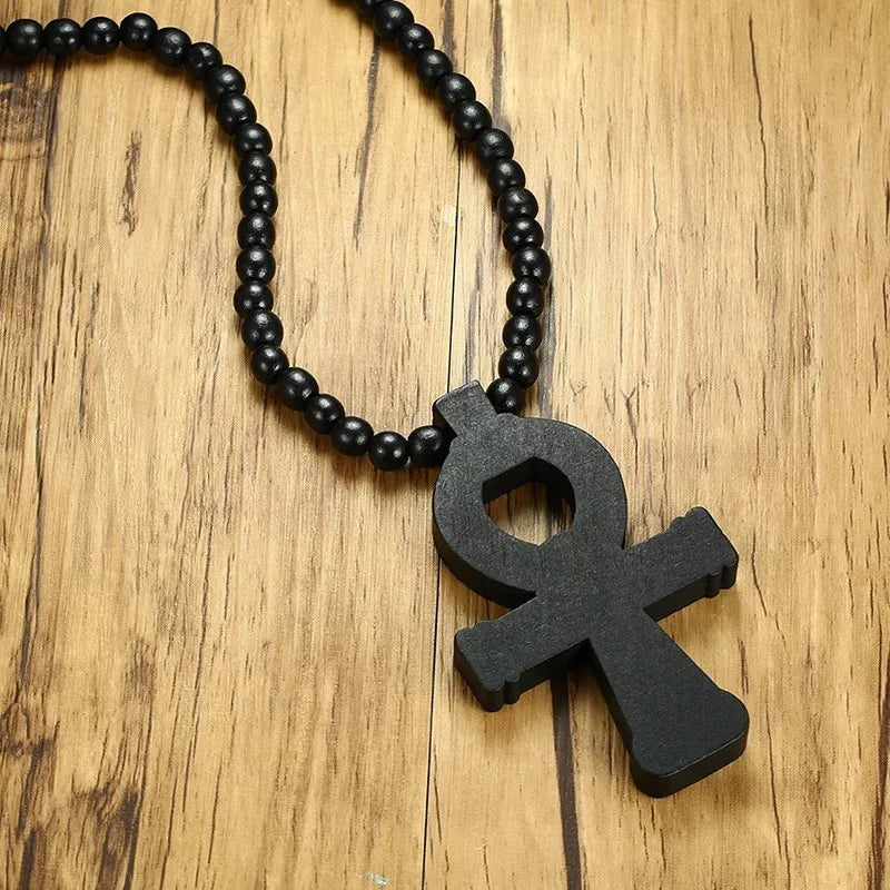 Men's Brown Wooden Ankh Cross Pendant with a 35 Inch Wood Beaded Necklace Male Hip Hop Egyptian Jewelry for Him Key of the Nile