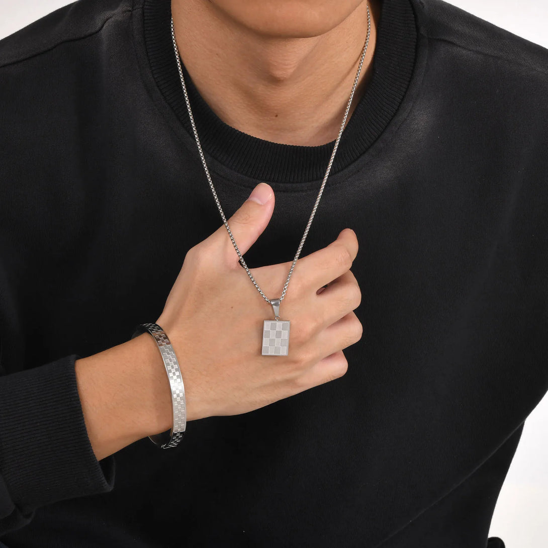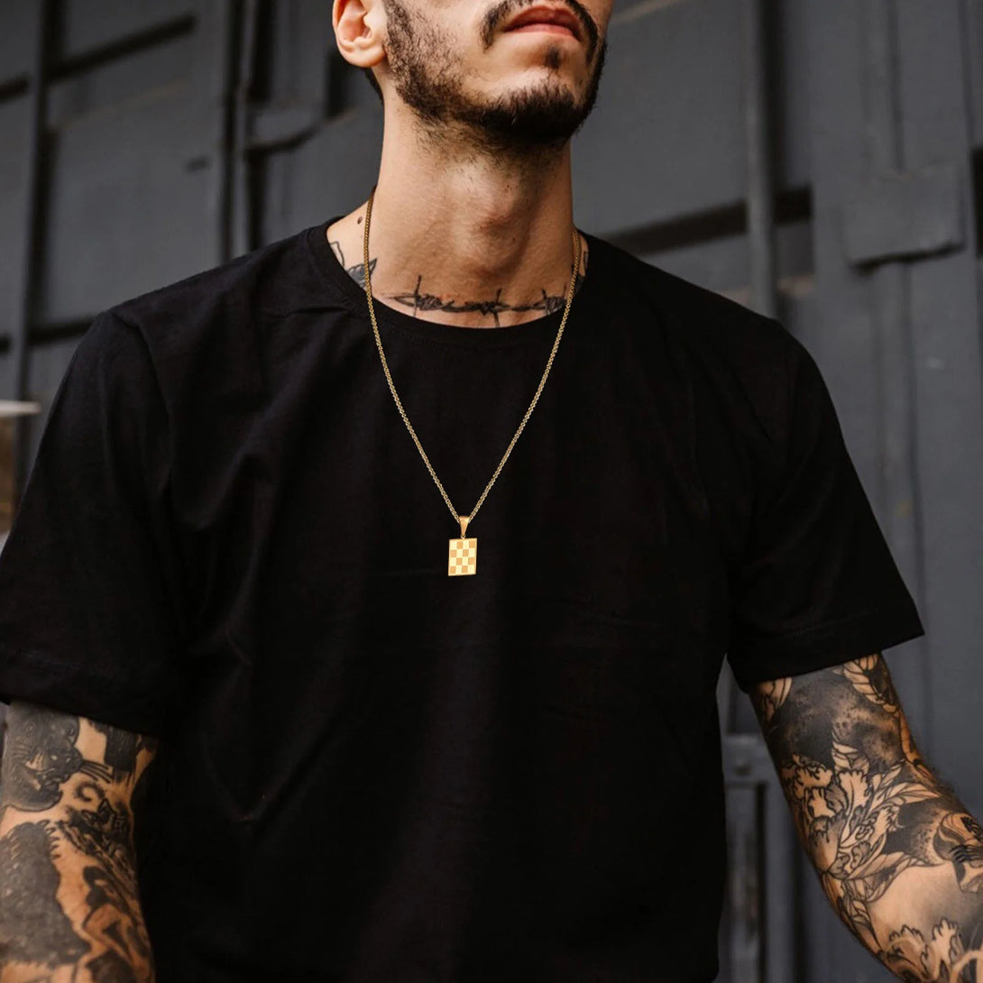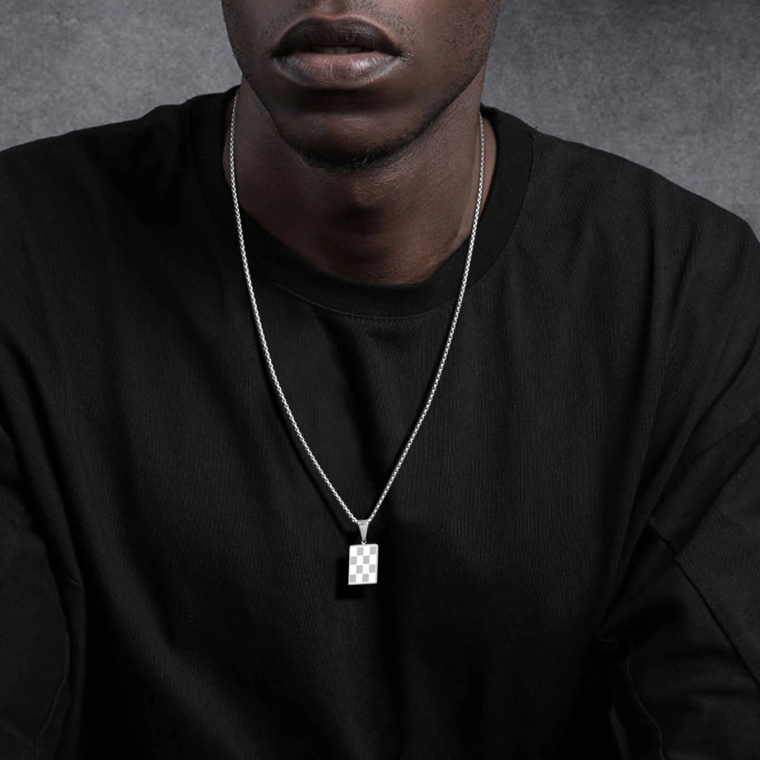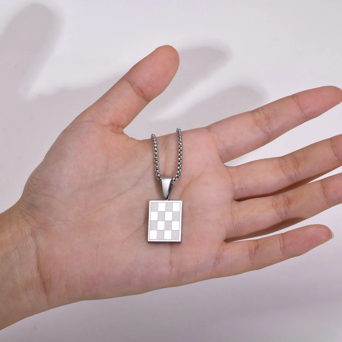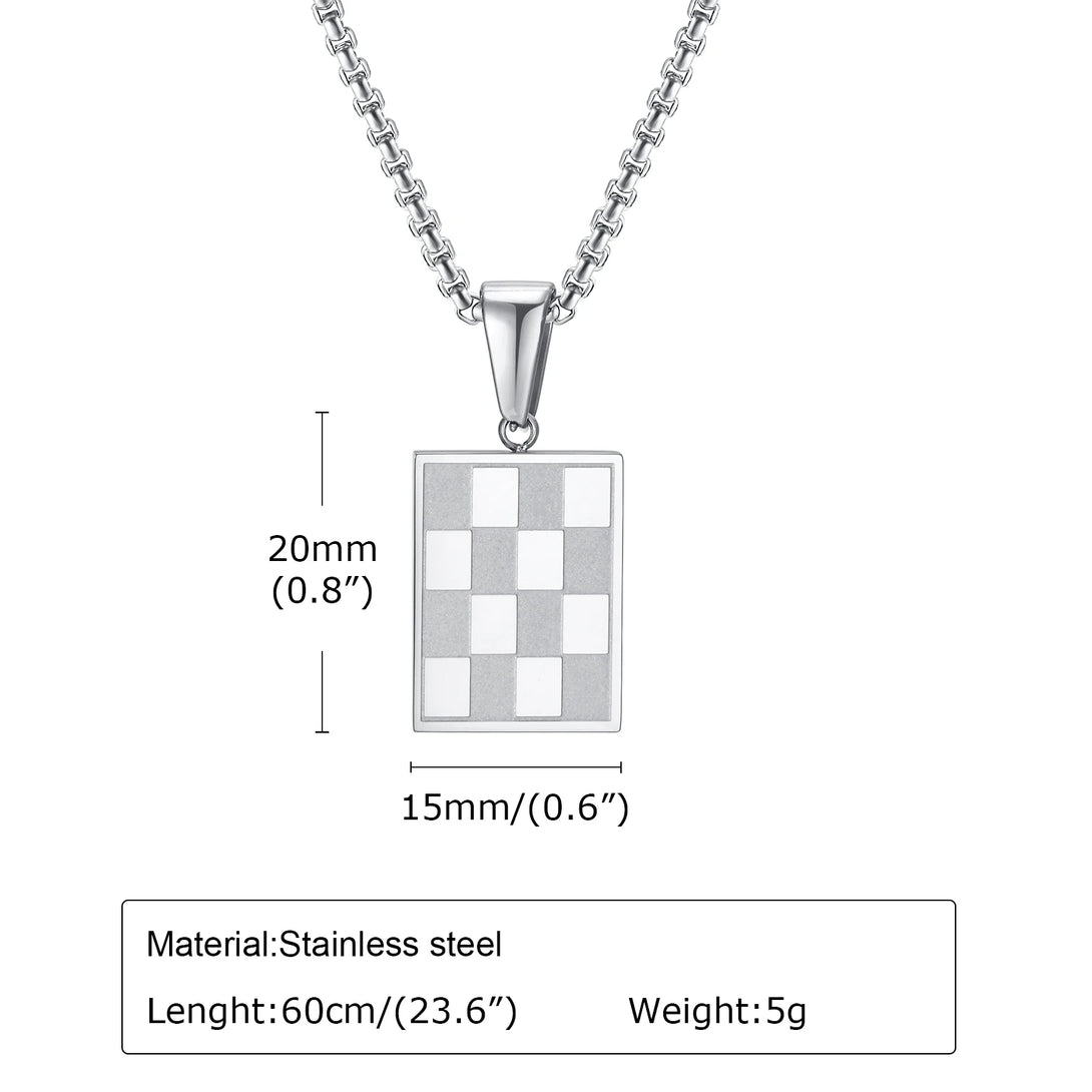 Men's Square Checkerboard Necklace,Waterproof Stainless Steel Checkered Geometric Pendant