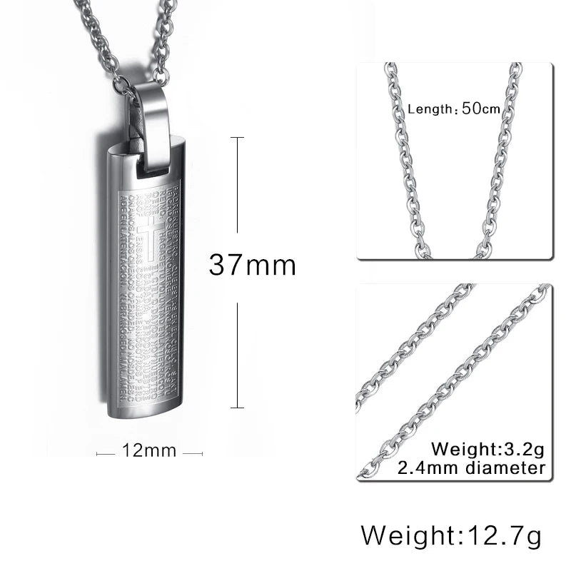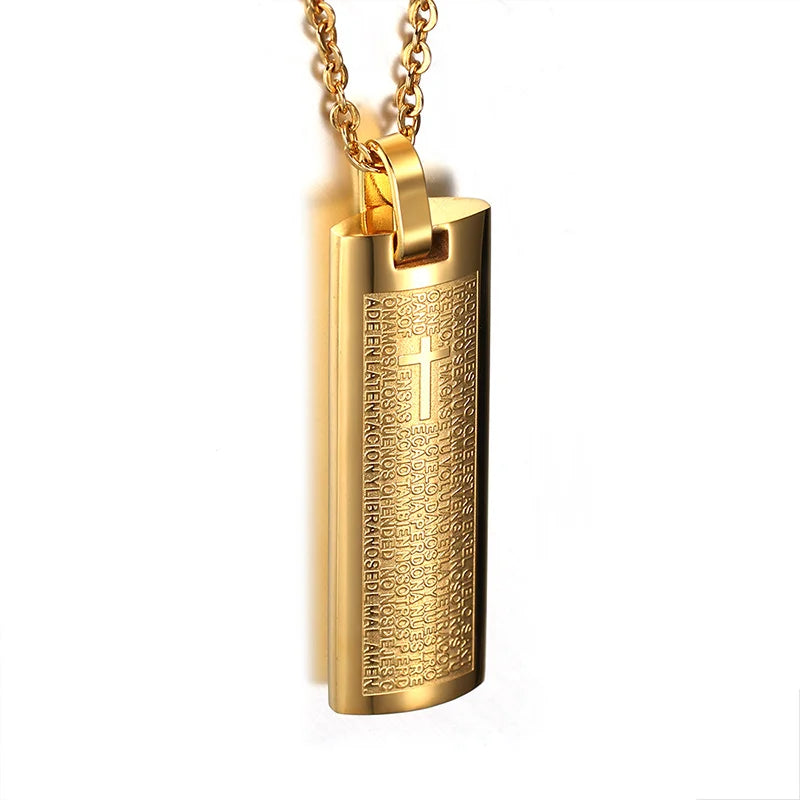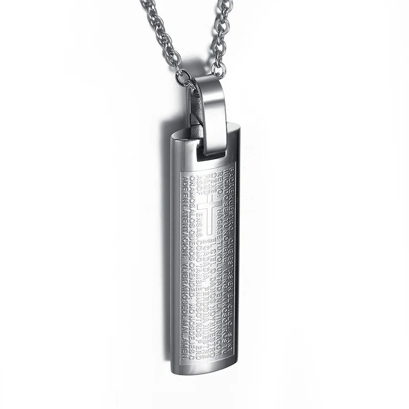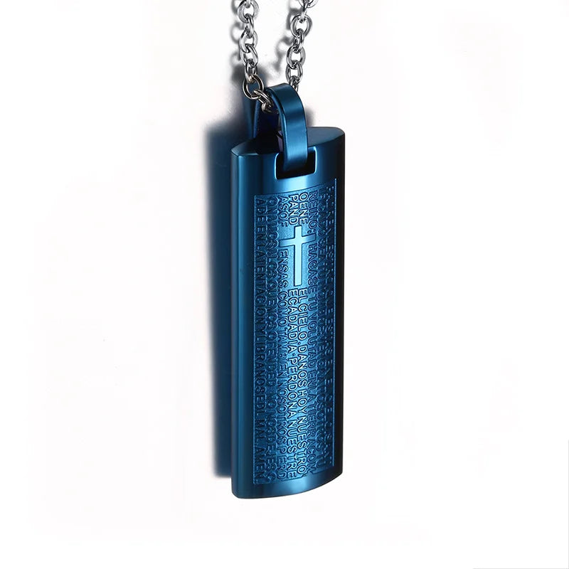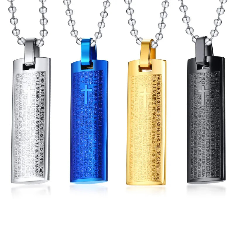 Men's Stainless Steel Pendant Necklace Spanish Bible Lords Prayer Cross Vintage Choker Black Gold-color Silver-color blue