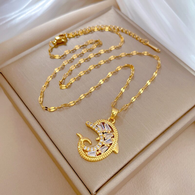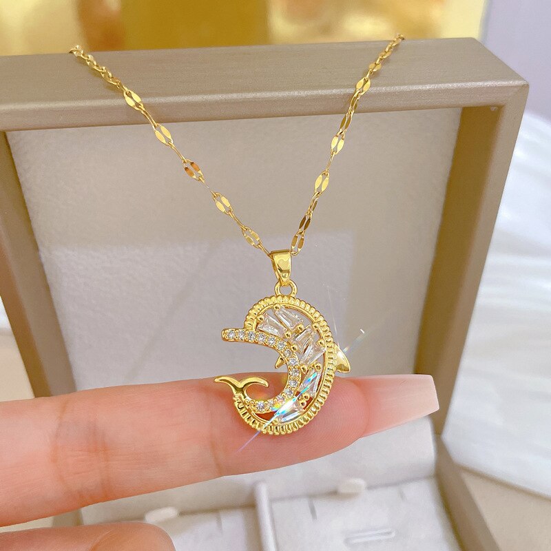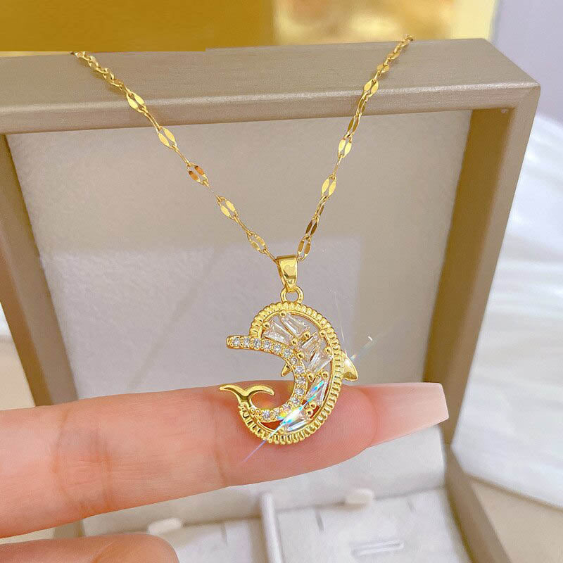 585 Gold Jewelry-316L Stainless Steel Minimalist Dolphin Cubic Zirconia Heart Pendant Necklace Trendy Titanium Steel Jewelry Women No Rust