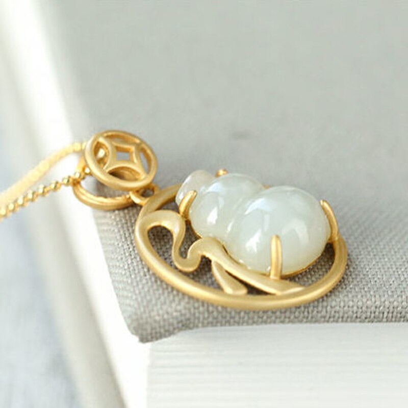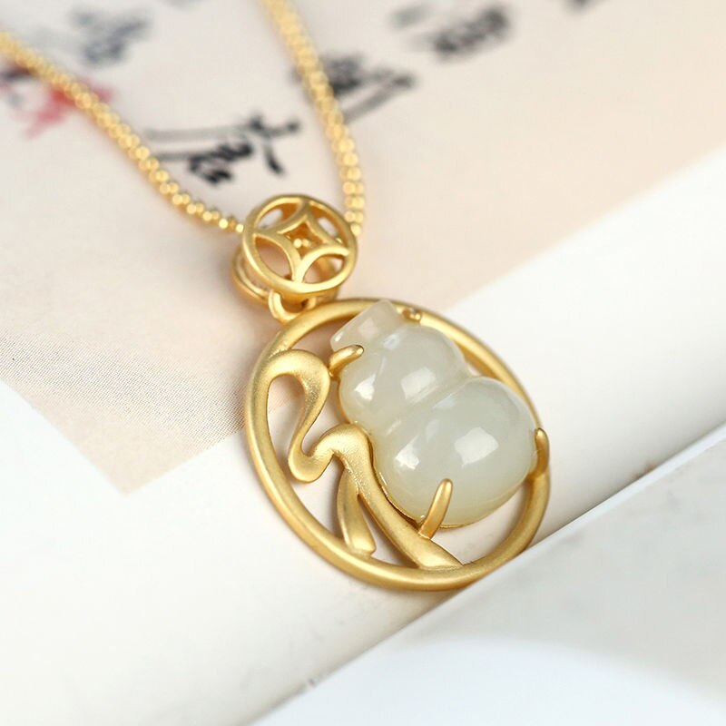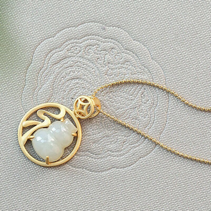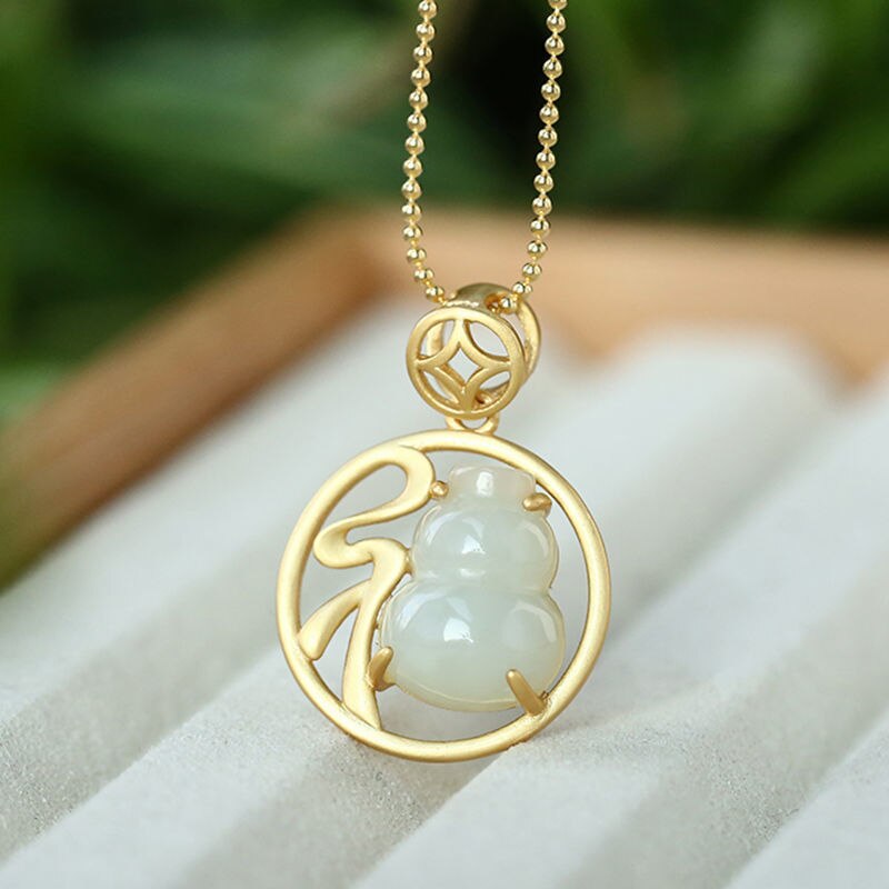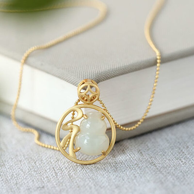 Pendants-Natural Hetian jade "Fu" gourd Pendant Necklace Chinese style retro unique ancient gold craft women's Charm Silver Jewelry
