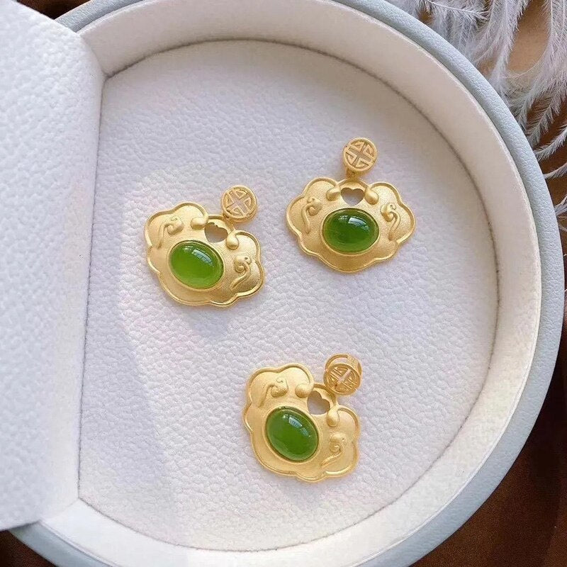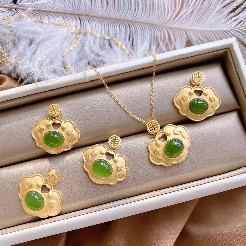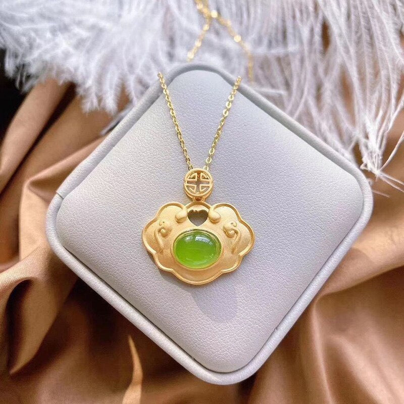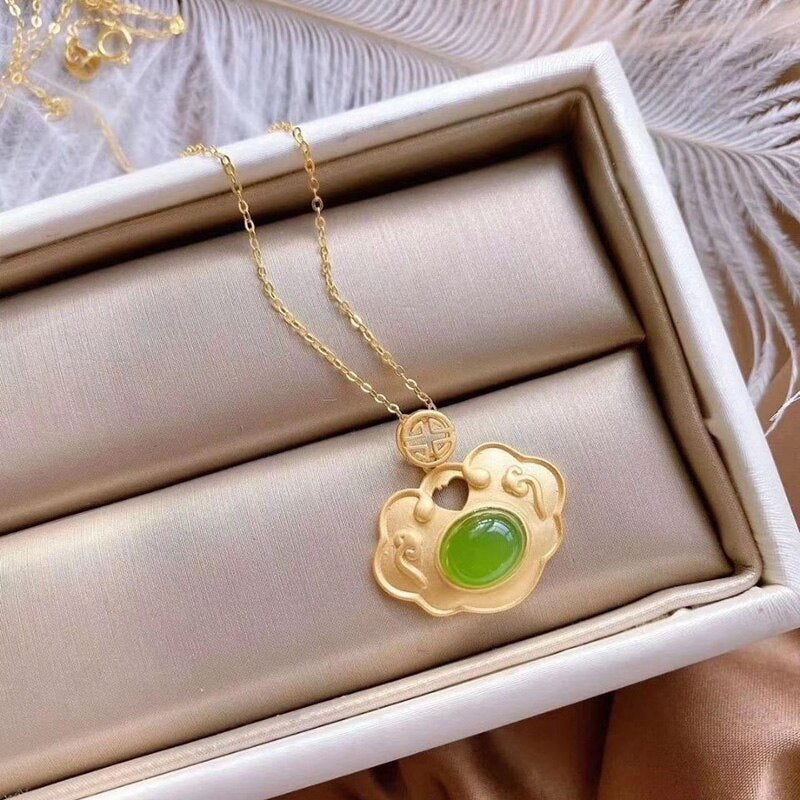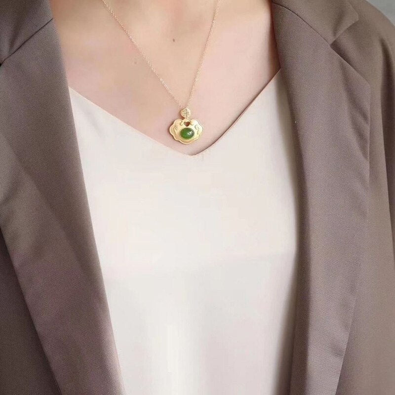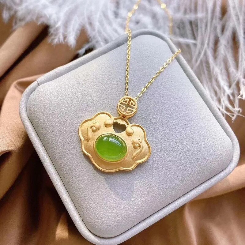 Pendants-Natural Hetian jade Xiangyun Pendant Necklace Chinese style retro unique ancient gold craft light luxury women's silver jewelry
