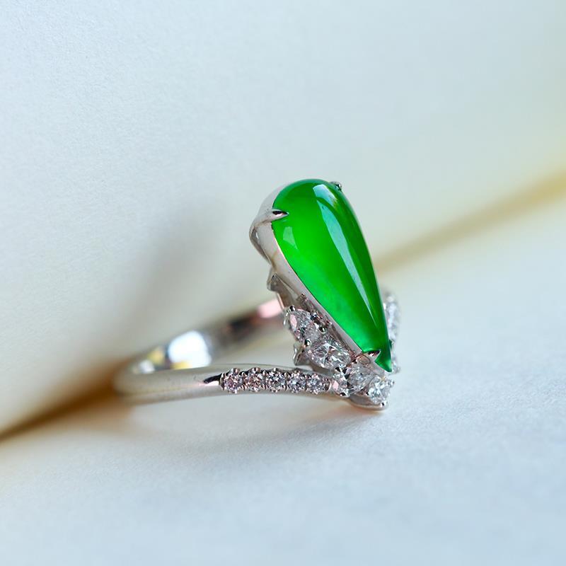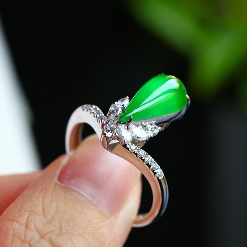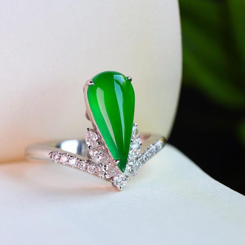 Natural Hetian jasper green drop-shaped diamond opening adjustable women ring