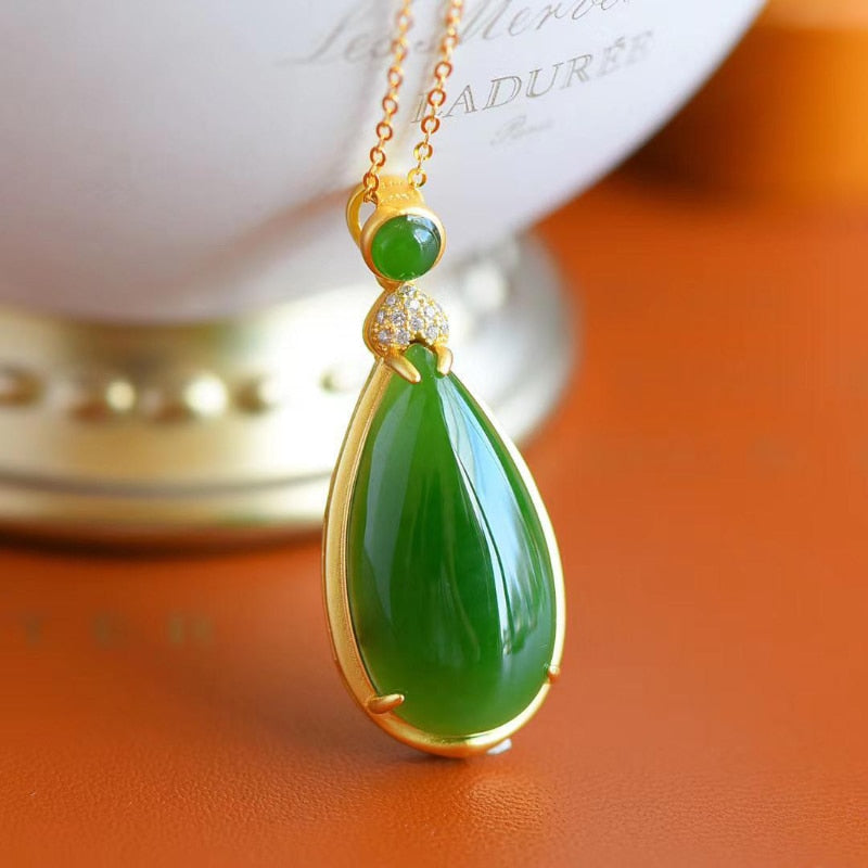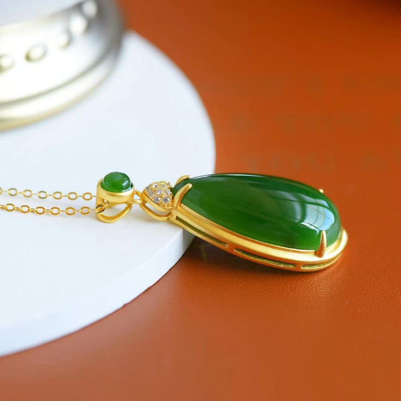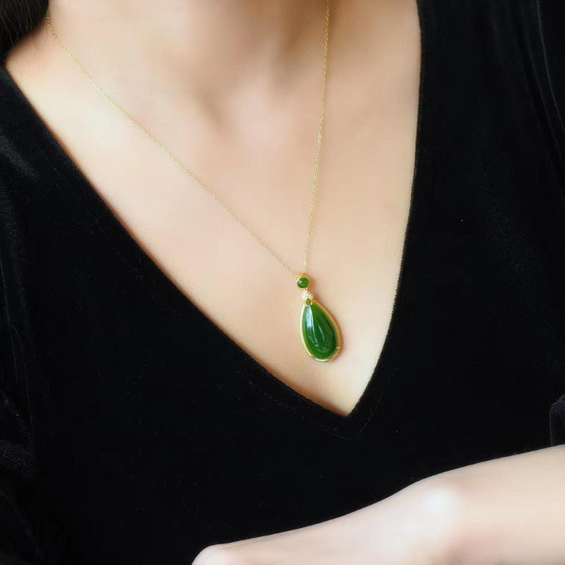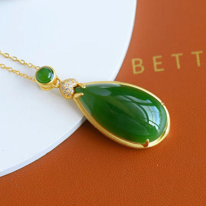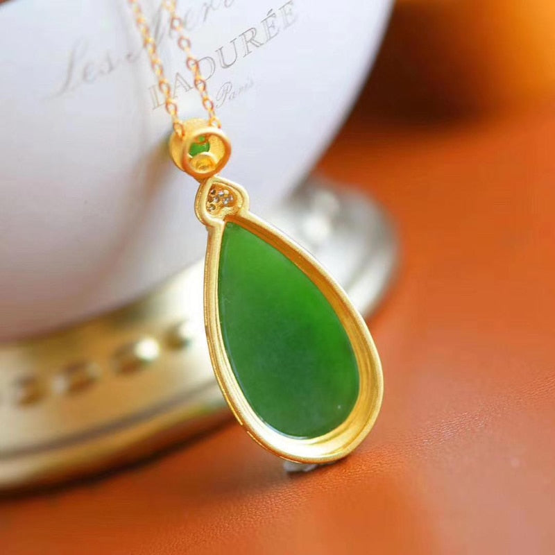 Chains Necklaces-Natural Hetian jasper water drop pendant necklaces ancient gold craftsmanship classic silver jewelry for girlfriend gift