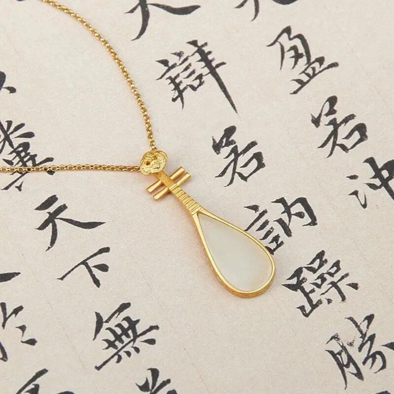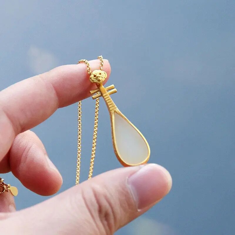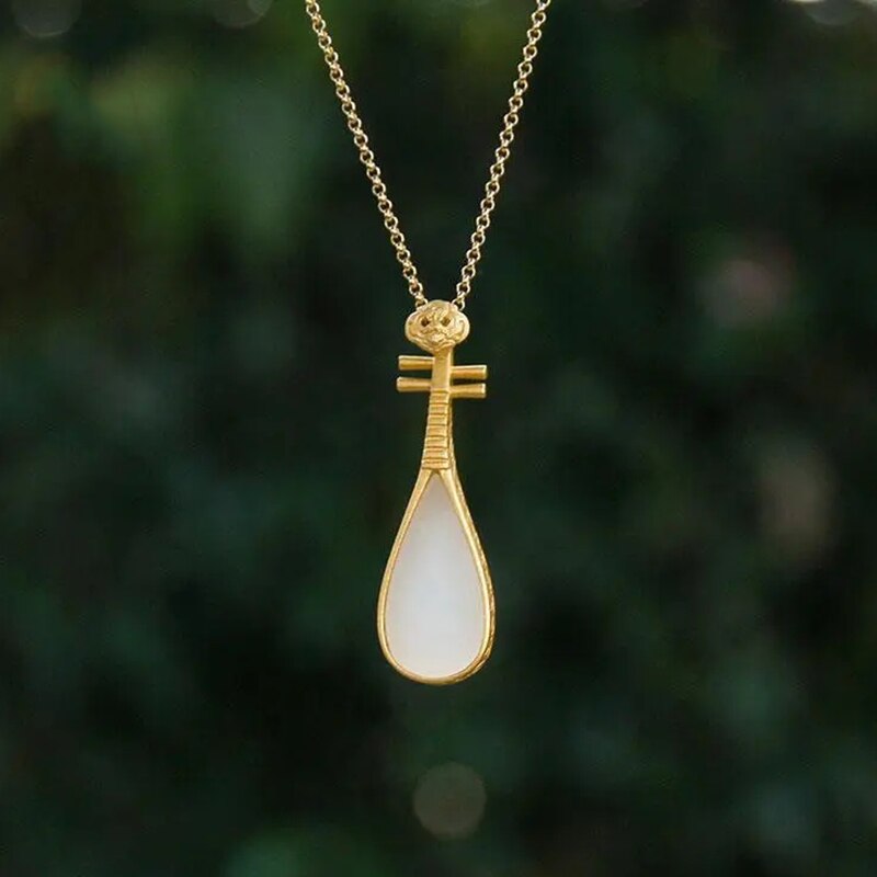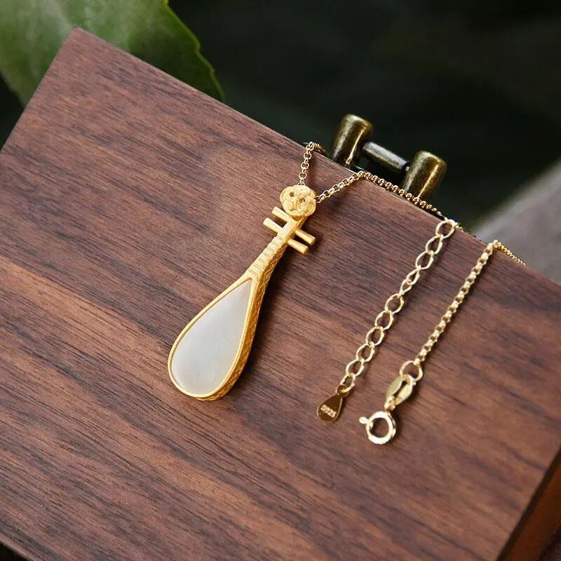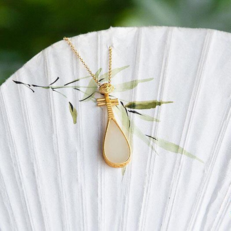 Pendants-Natural Hetian White Jade Drop-shaped Pipa Necklace Pendant Classical Creative Exquisite Elegant Ladies Silver Jewelry