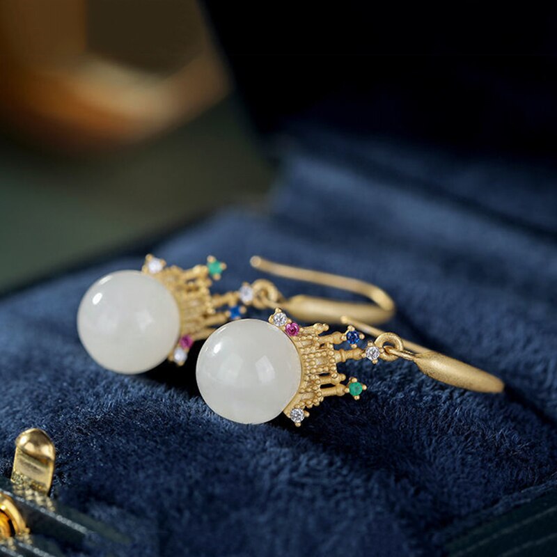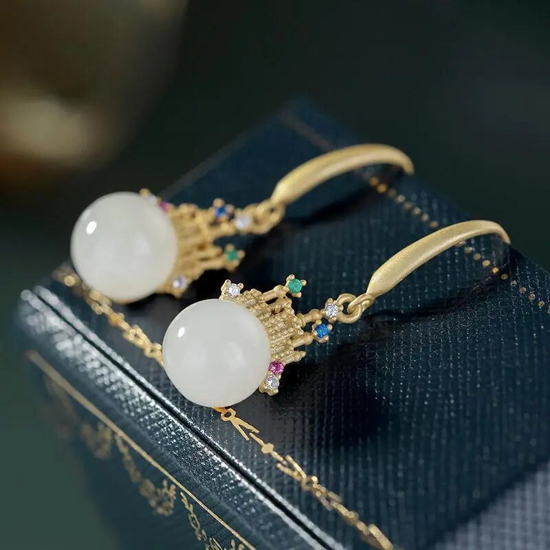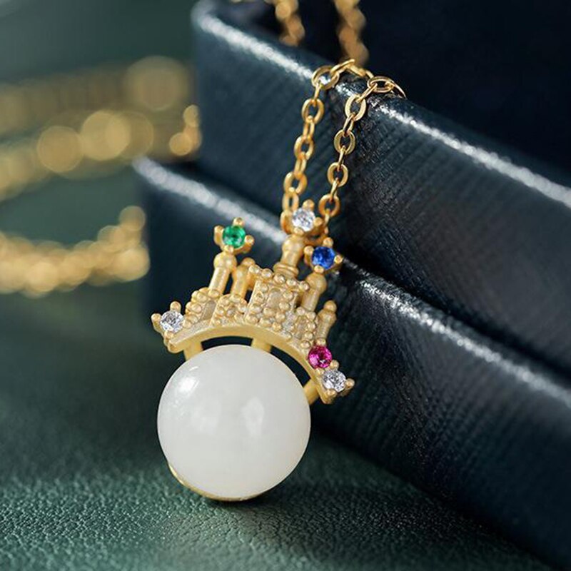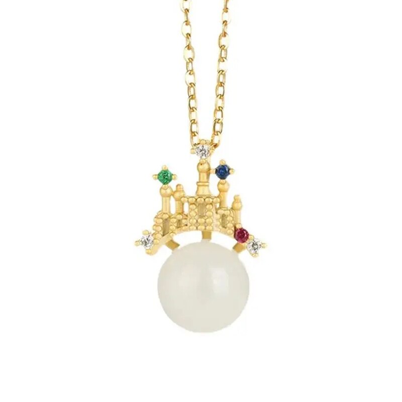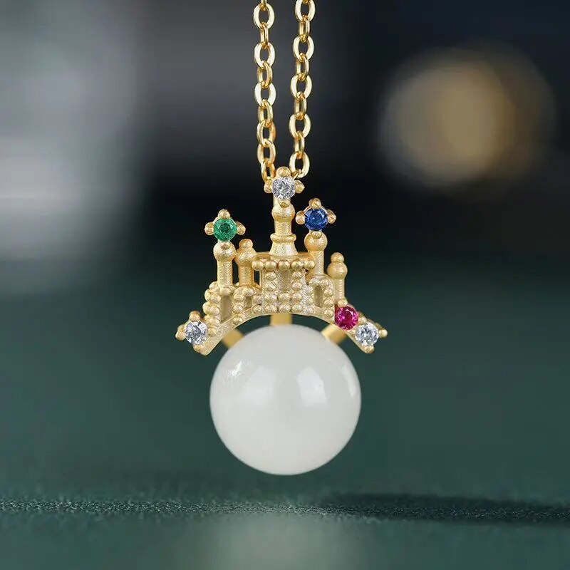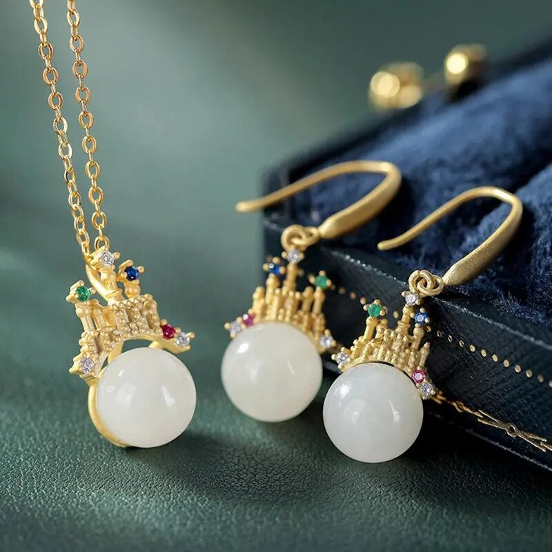 Necklace/Earrings-Natural Hetian White Jade Round Beads Colorful Castle Shaped Earrings Necklace Pendant Chinese Classic Charm Ladies Set