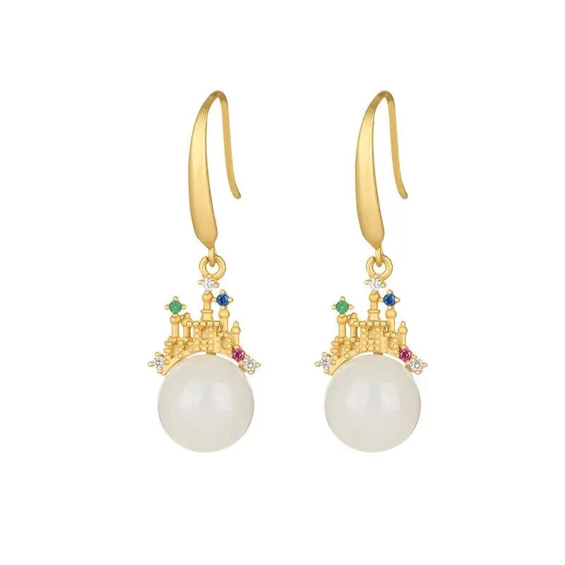 Natural Hetian White Jade Round Beads Colorful Castle Shaped Earrings Necklace Pendant