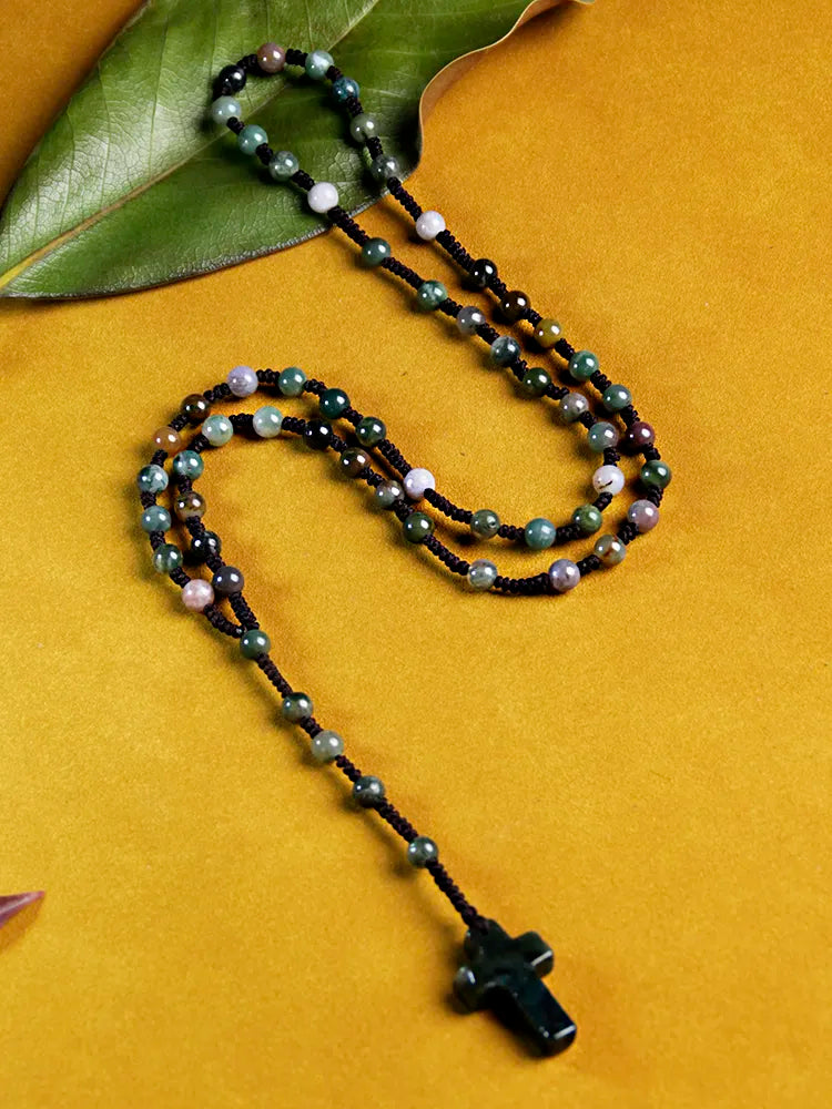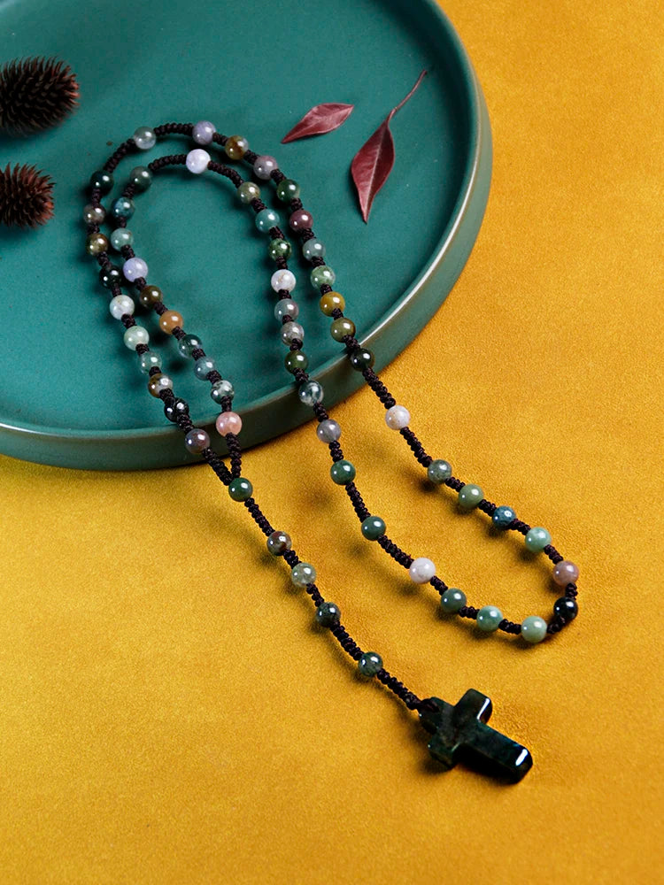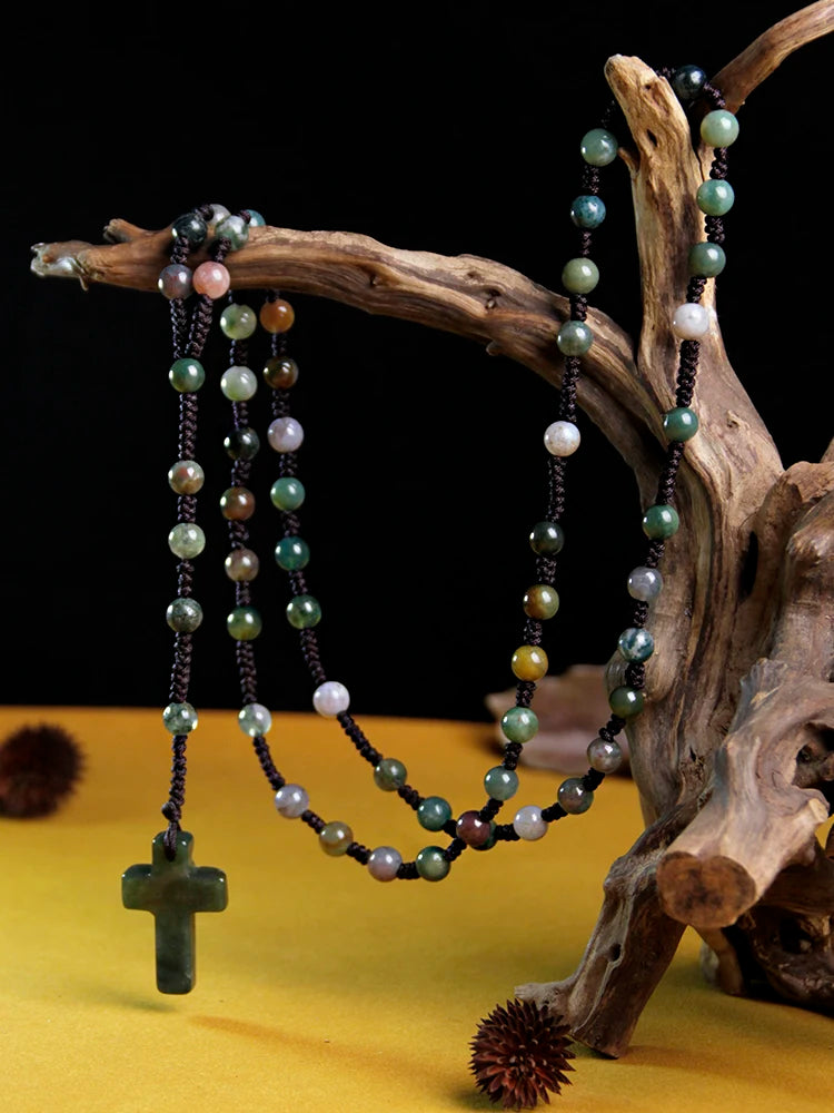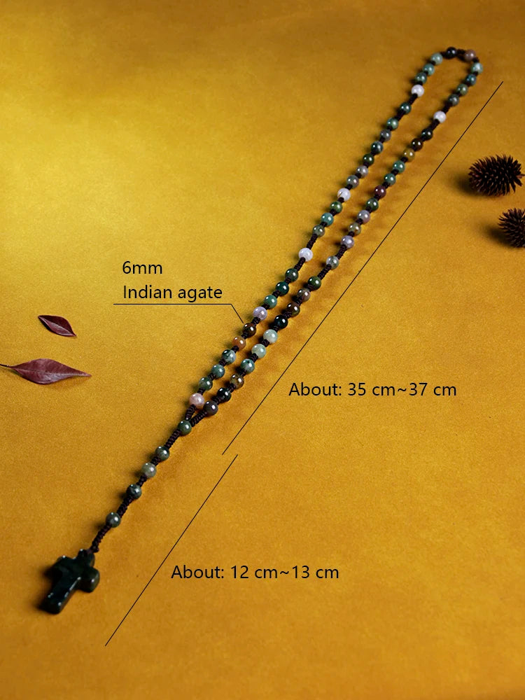 Natural Stone Indian agate Catholic Christ Rosary Necklaces Cross Pendant,Male and female Hand-woven Knot Necklace Meditation
