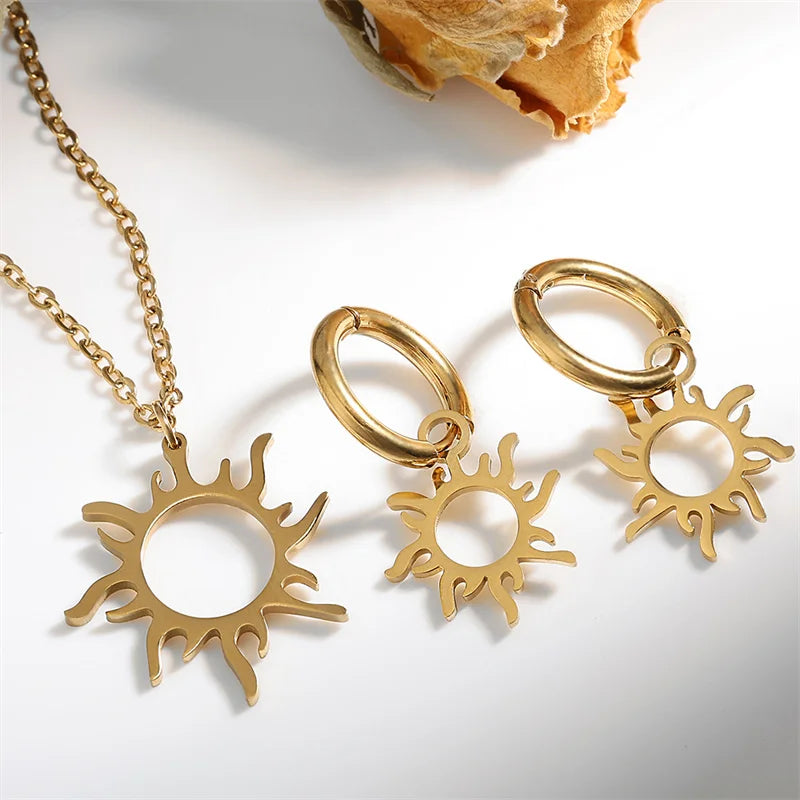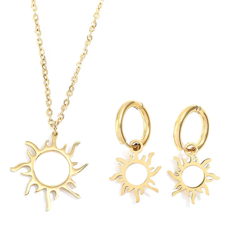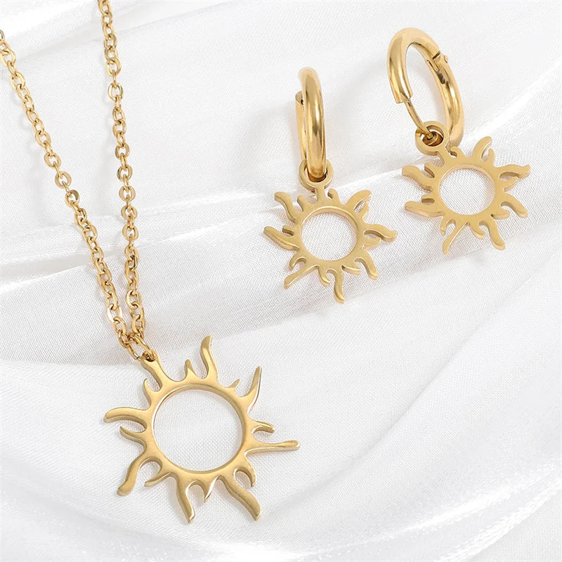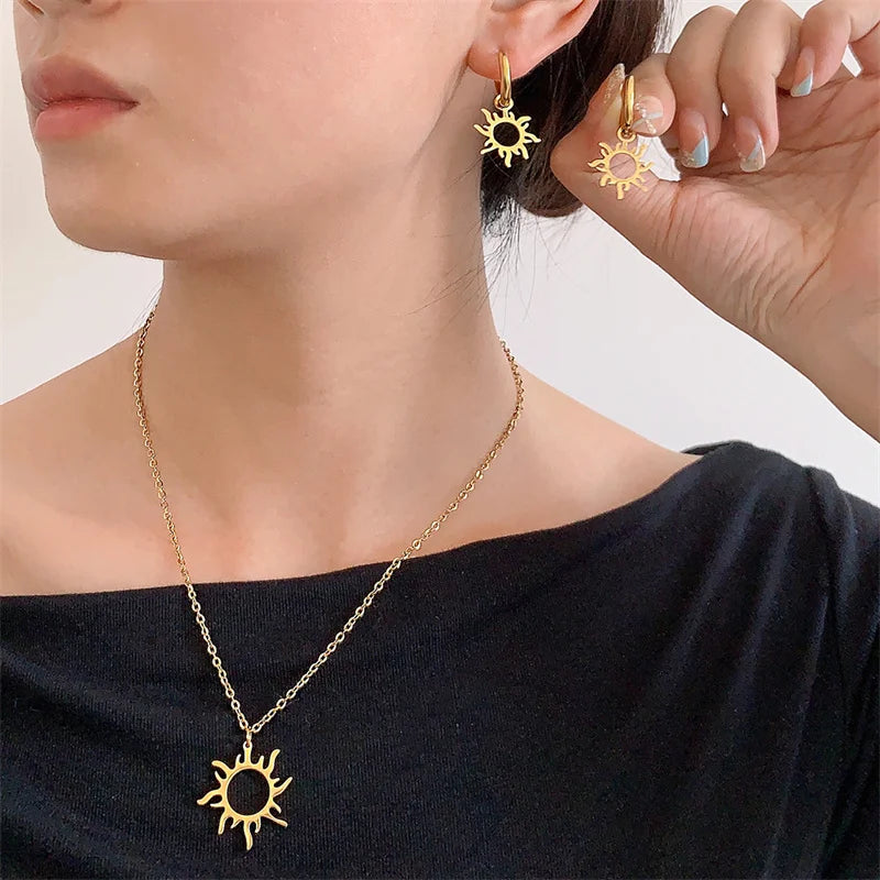 Nature Stainless Steel Sun-Shape Pendant Necklace and Earrings For Women Trend Charm Birthday Party Best Gifts