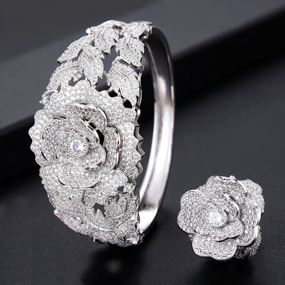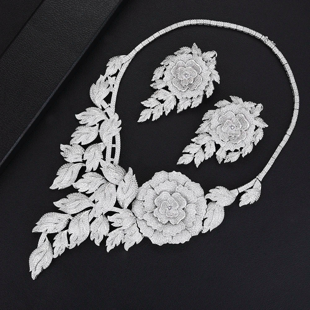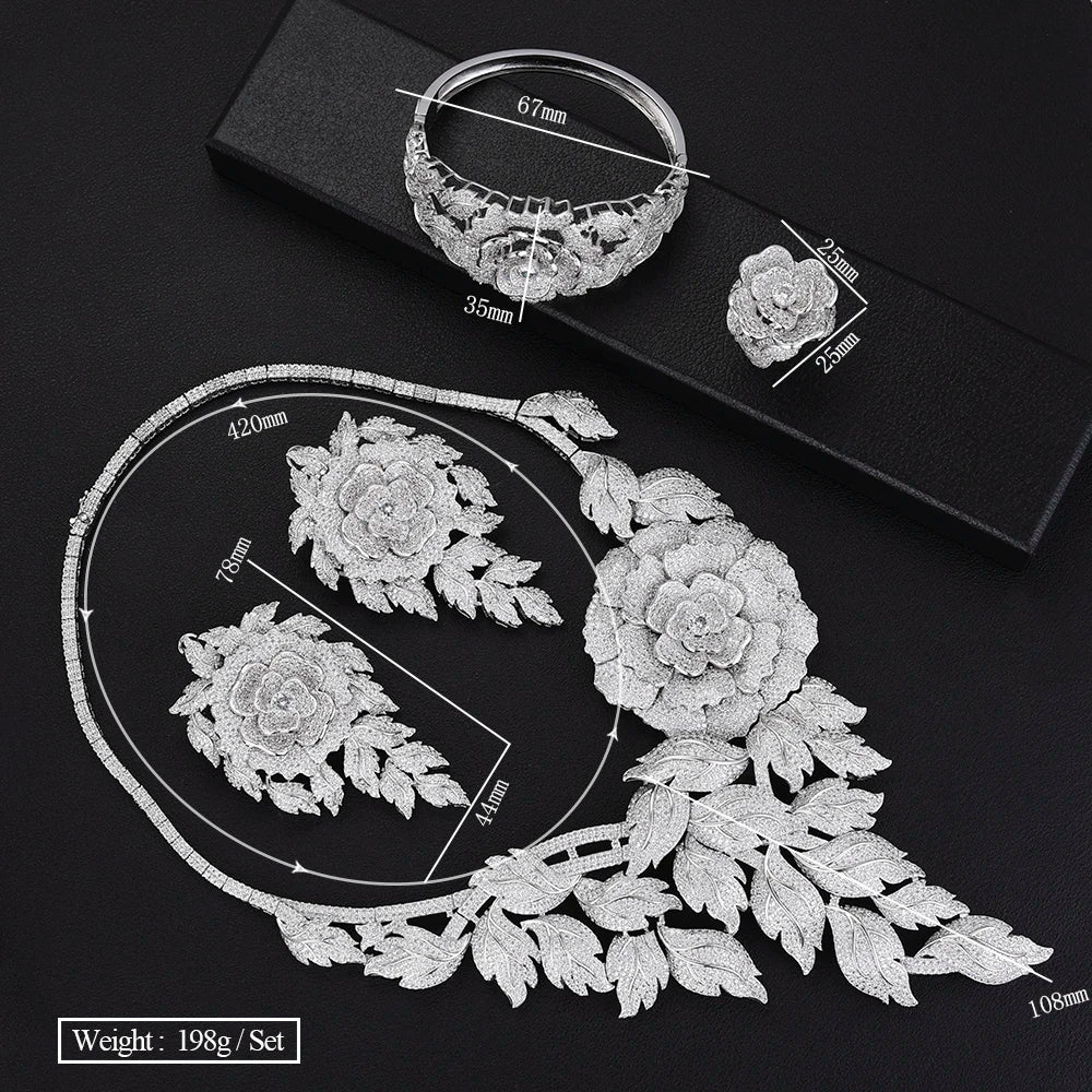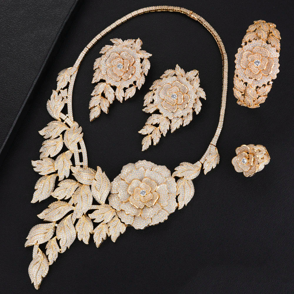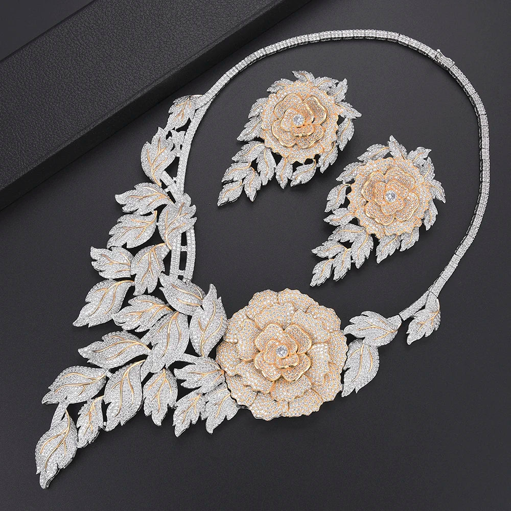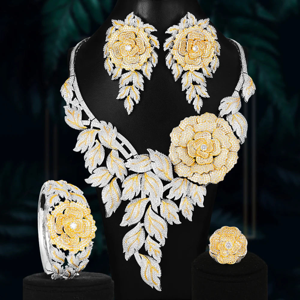 New 4PCS BIG Luxury Bicolor Peony Flowers Statement Jewelry Set For Women Wedding African Cubic Zircon CZ Dubai Bridal Jewelry