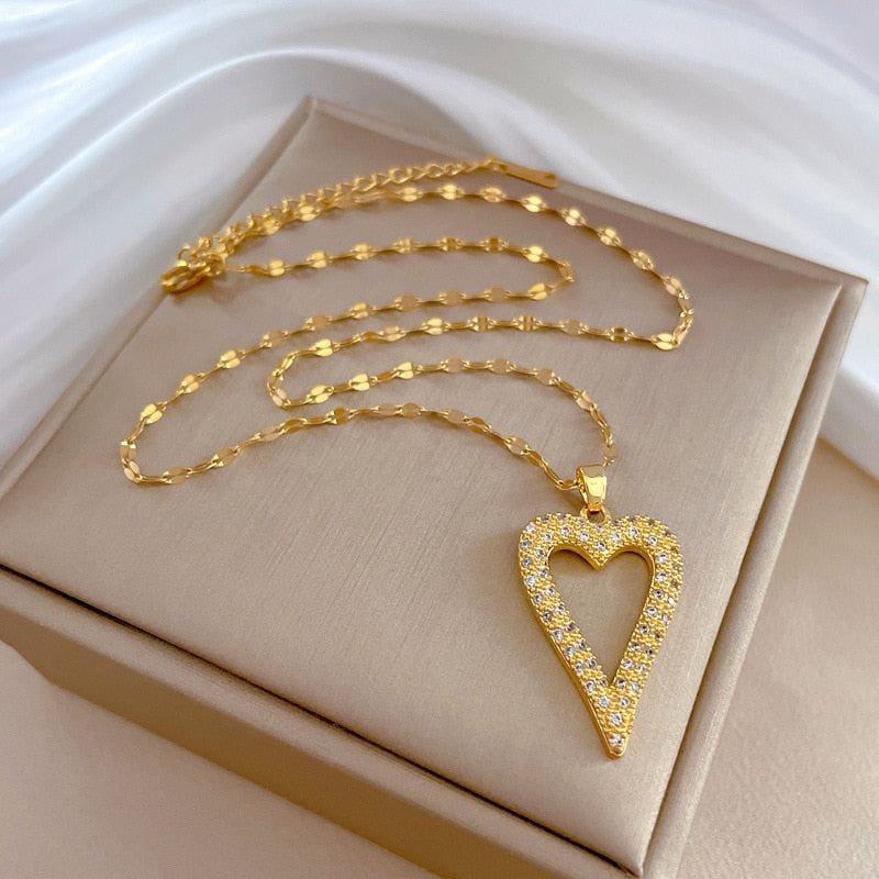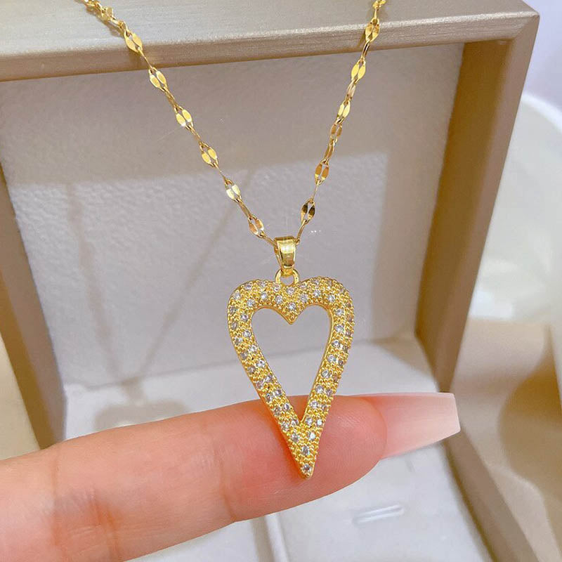 585 Gold Jewelry-Titanium Steel New Arrivals Hollow Big Heart Zircon Pendant Necklace For Women Winter Sweater Necklace Girls New Year Gifts