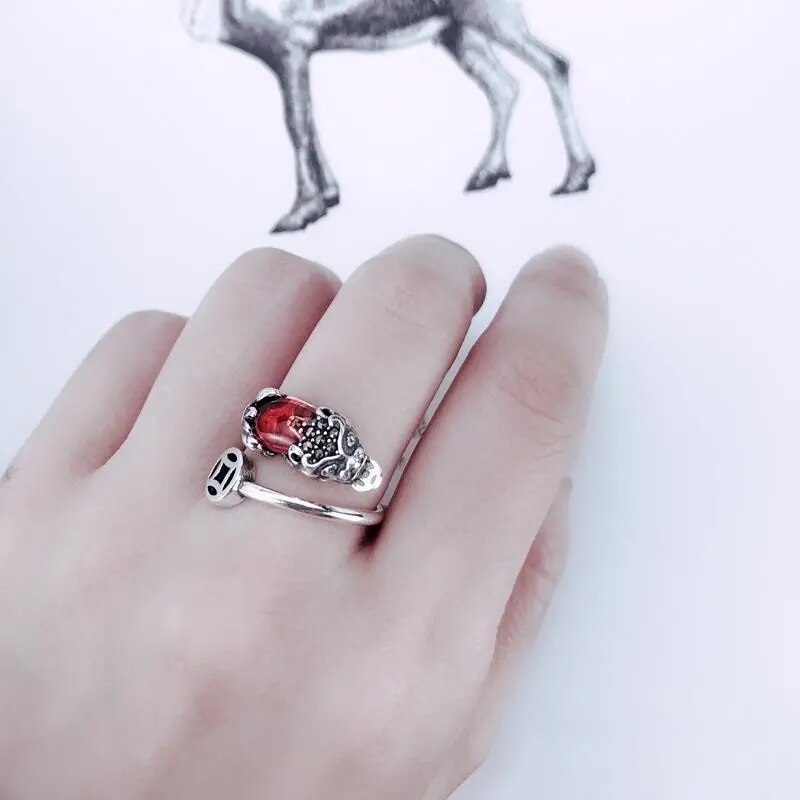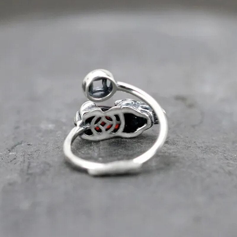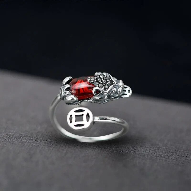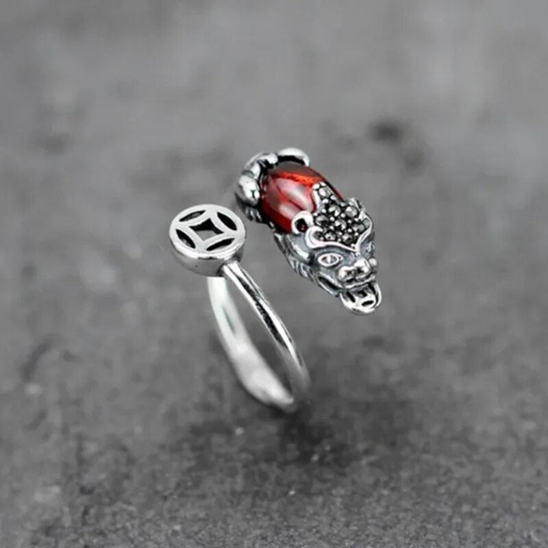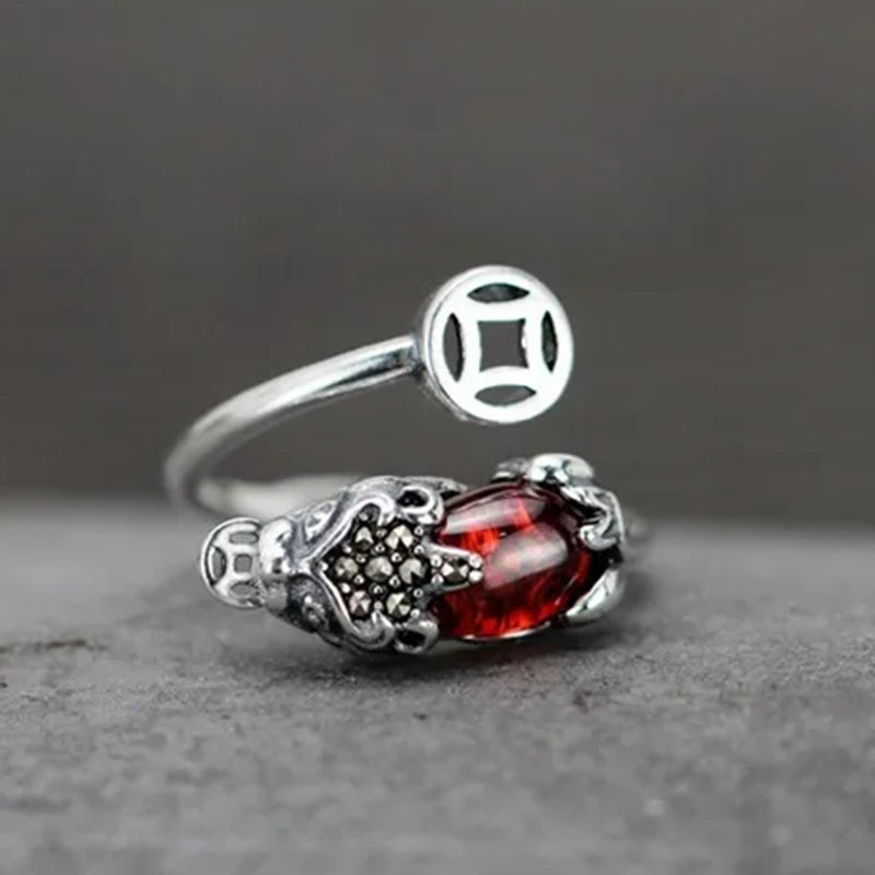 Cocktail Ring-New design inlaid pomegranate chalcedony brave opening ring Chinese retro silver domineering pendant men's and women's jewelry
