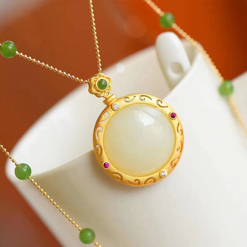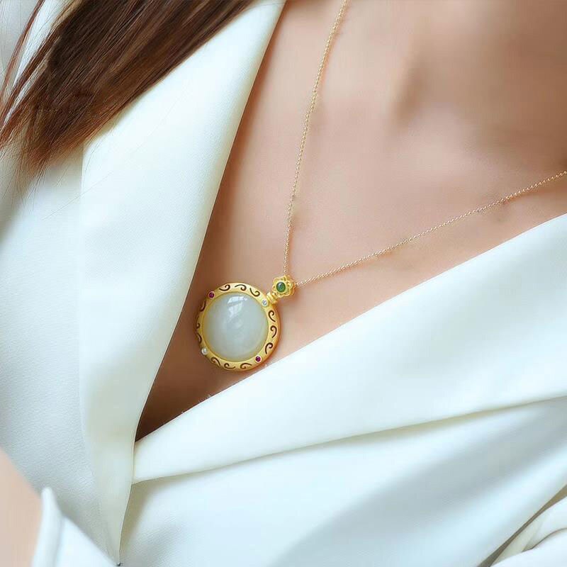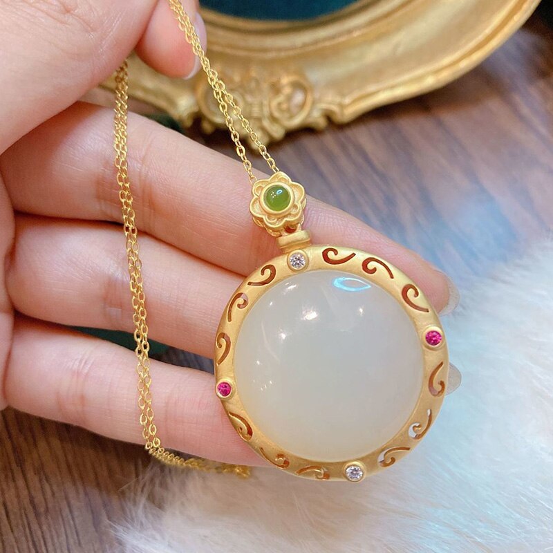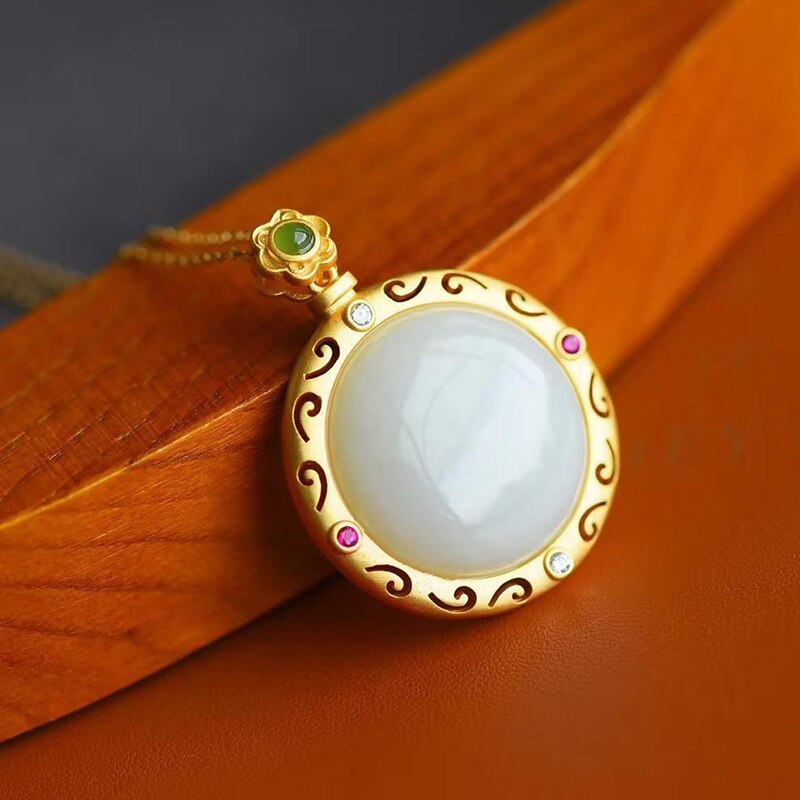 Pendants-New Design Natural Hetian Jade Round Hollow Pendant Necklace Chinese Style Retro Charm Ladies Silver Jewelry