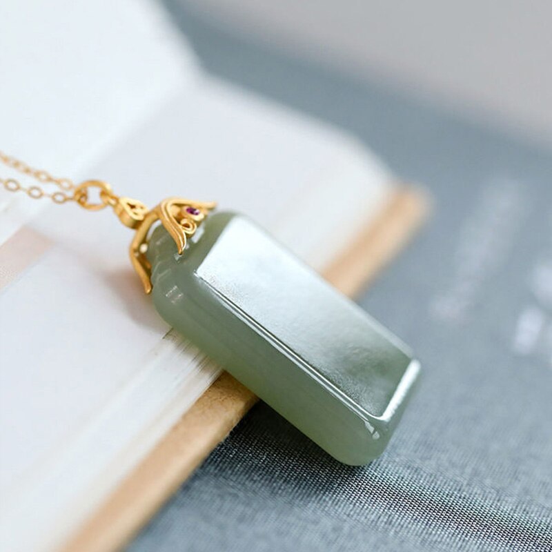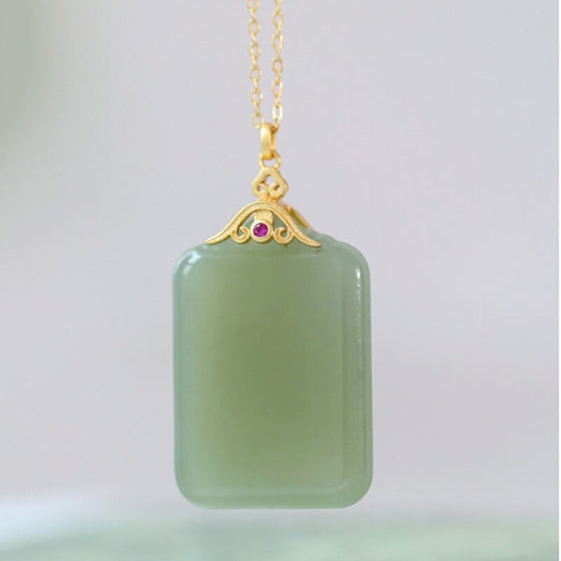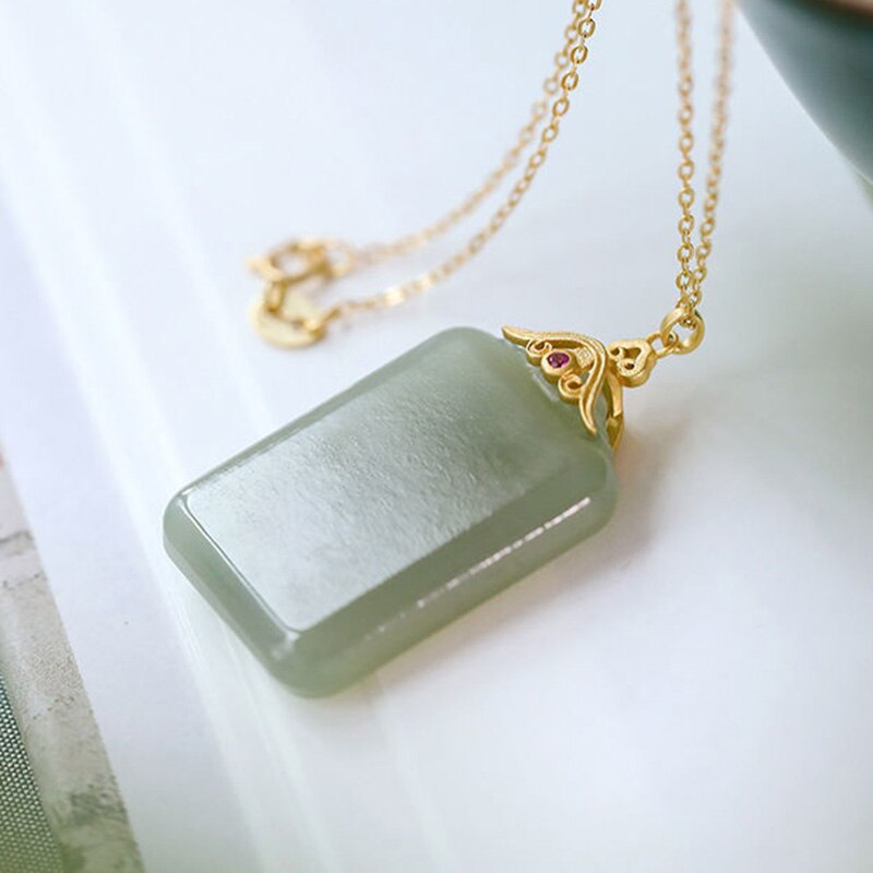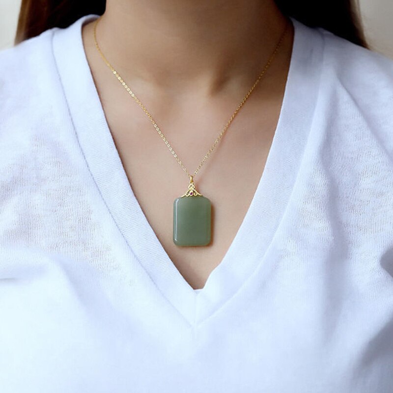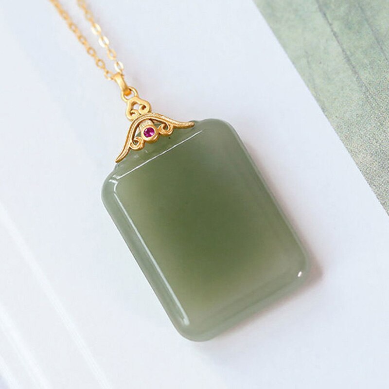 Pendants-New diamond-encrusted natural Hetian jade rectangular necklace pendant simple temperament men's and women's silver jewelry