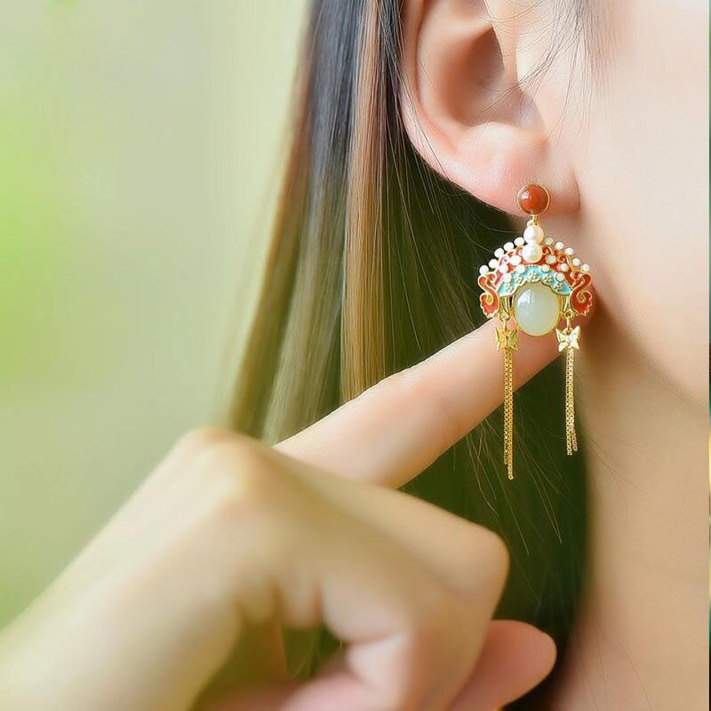 Drop Earrings-New gilt inlaid oval natural Hetian Yunan red tourmaline pearl earrings exquisite luxury girls silver jewelry