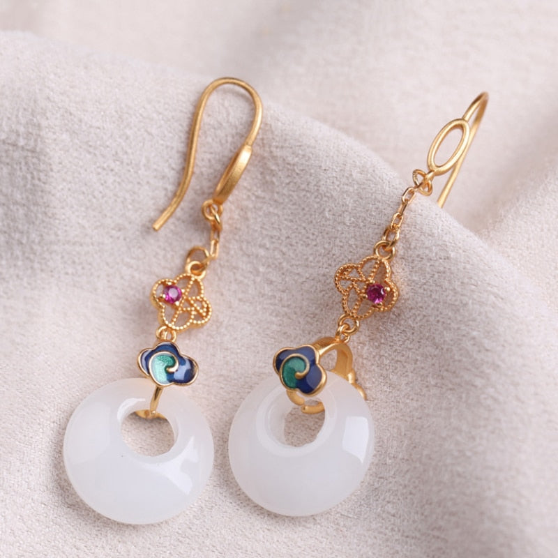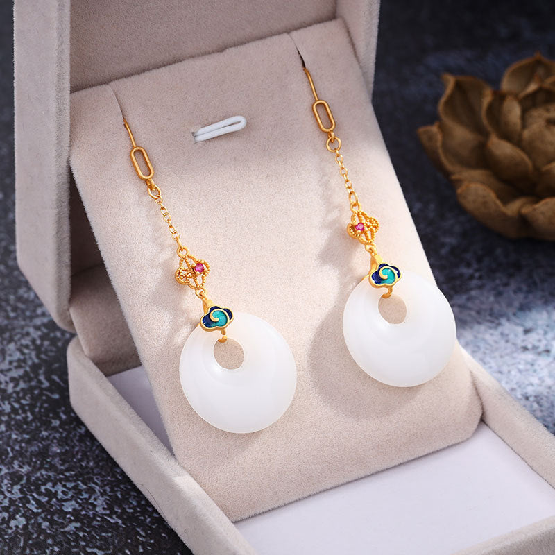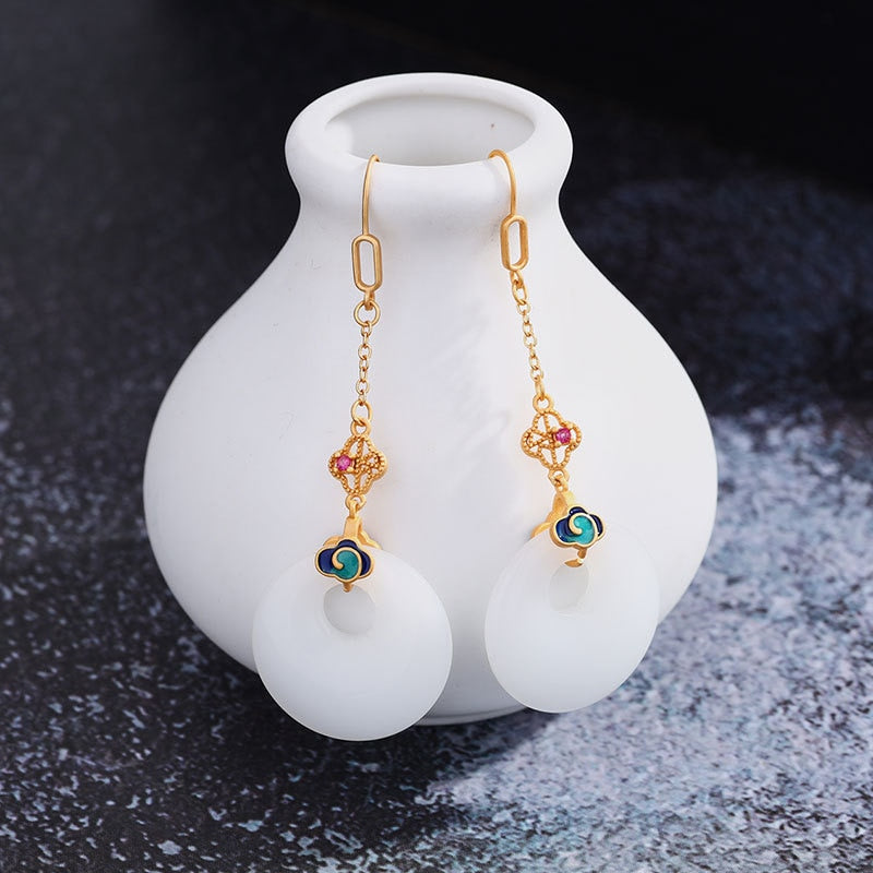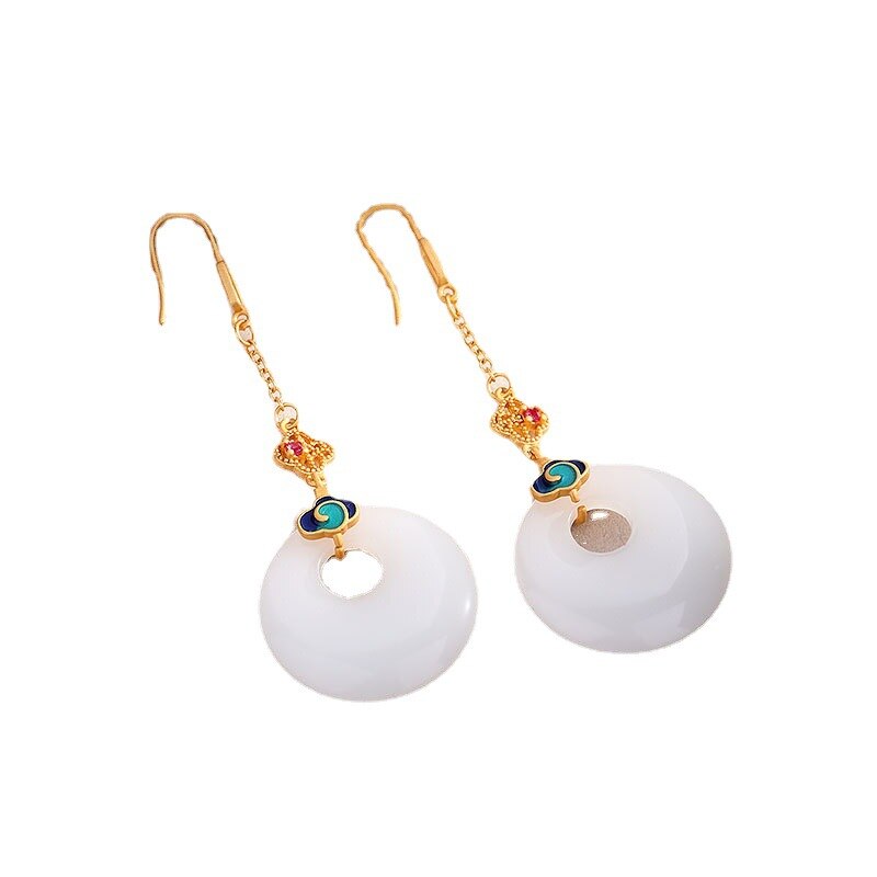 Drop Earrings-New in Natural Hotan White Jade round tassel earrings for women court style auspicious clouds enamel exquisite chain jewelry