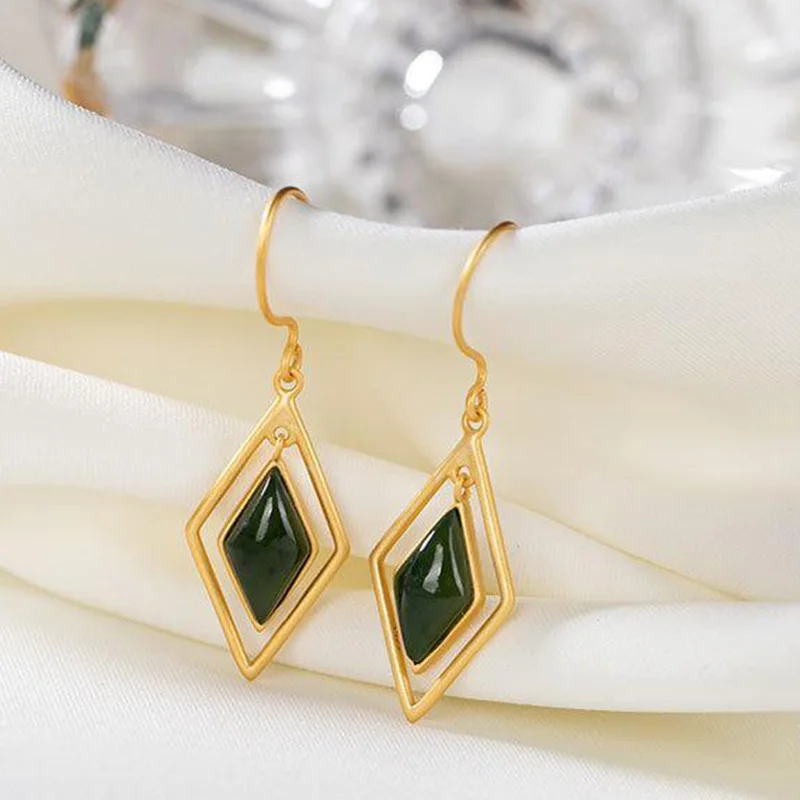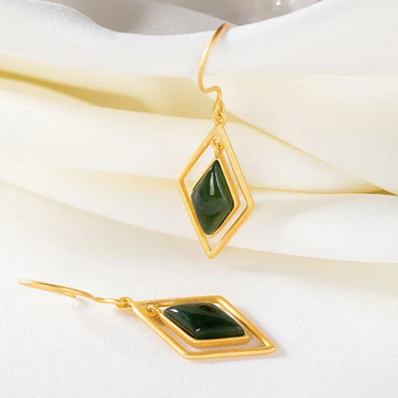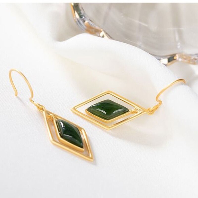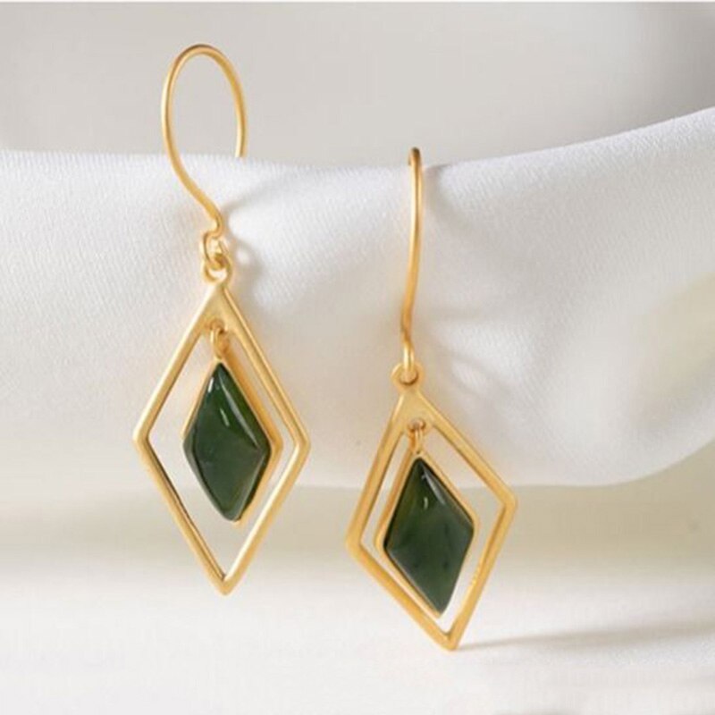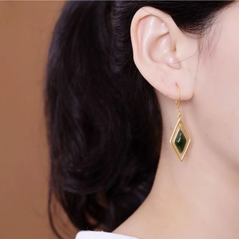 Drop Earrings-New Silver Gold Inlaid Natural Hetian Chalcedony Palace High Sense Earrings Personality Geometric Diamond Women's Brand Jewelry