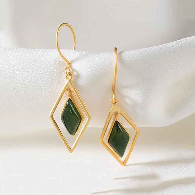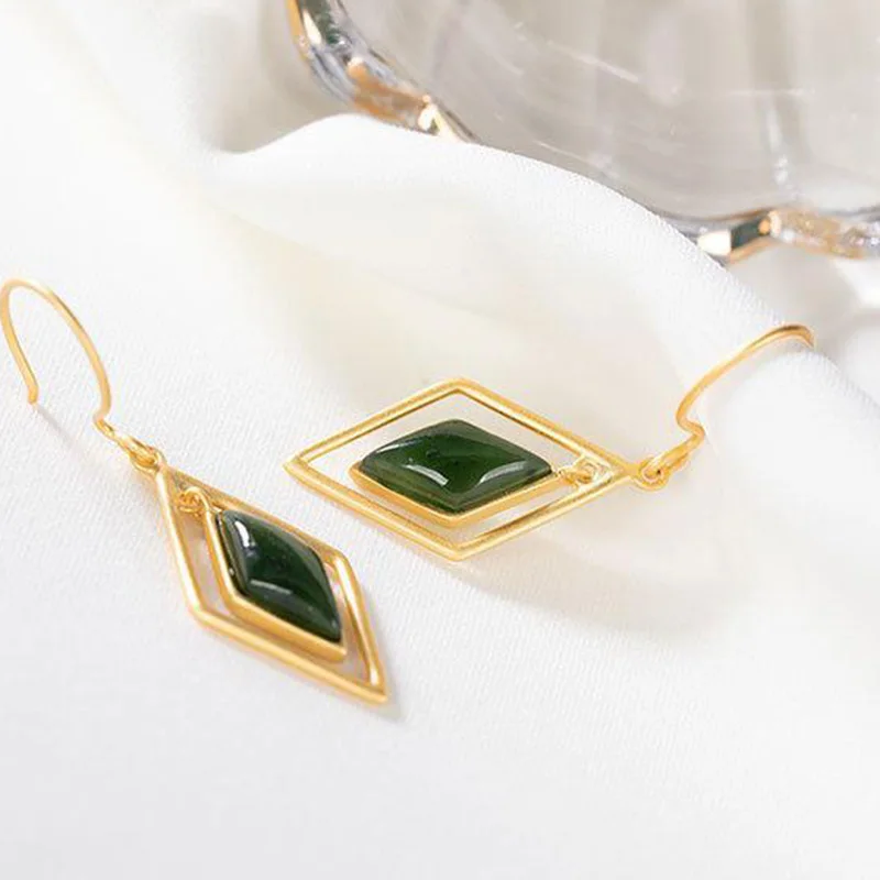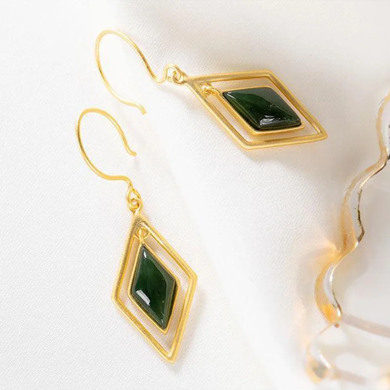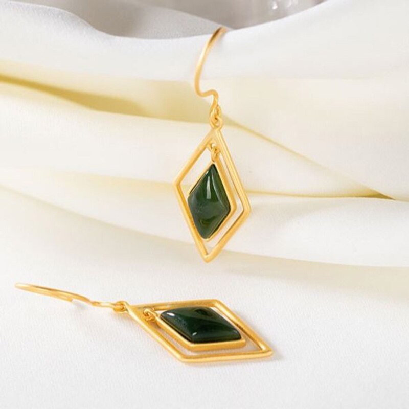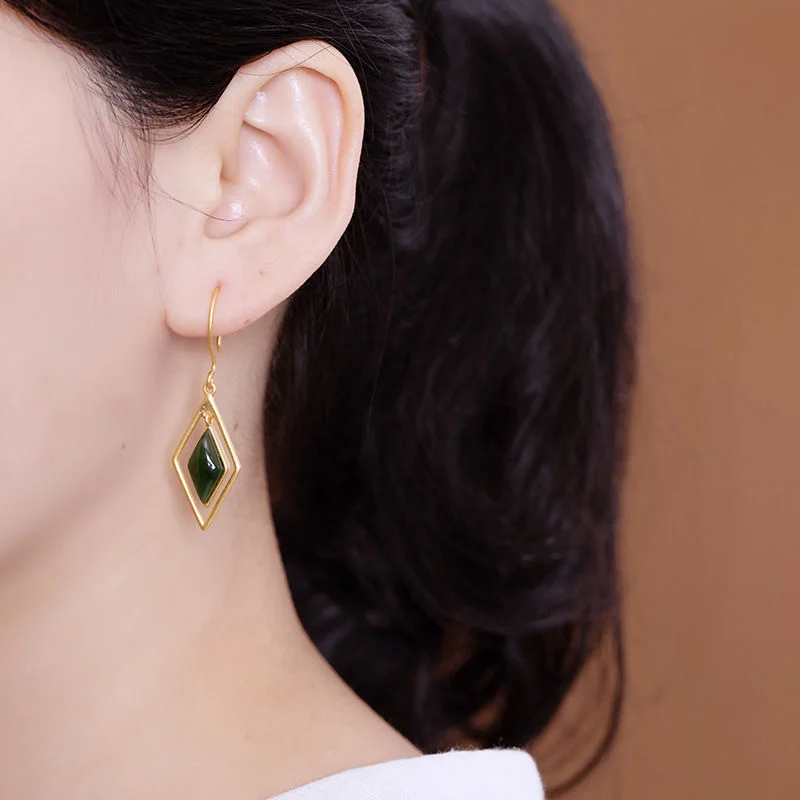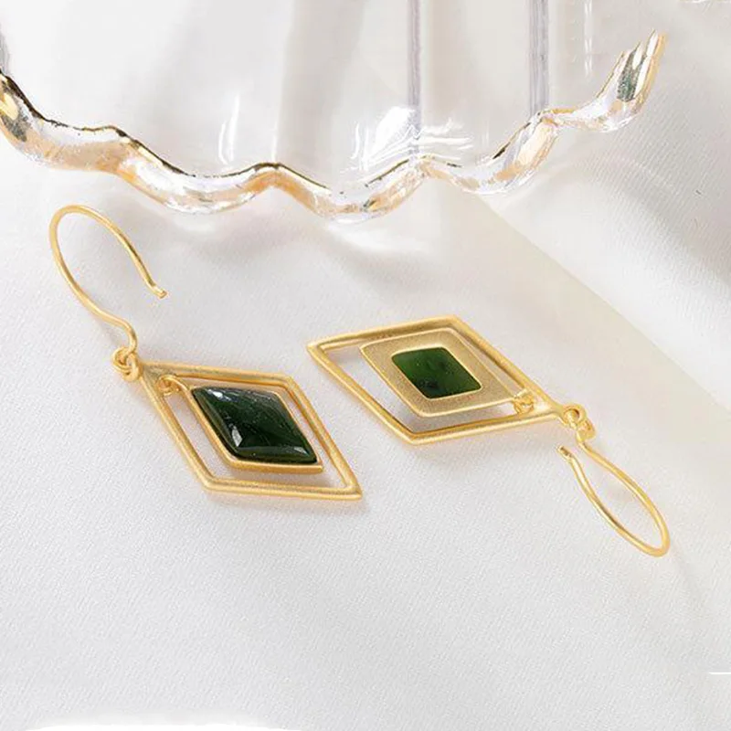 Drop Earrings-New Silver Gold Inlaid Natural Hetian Chalcedony Palace High Sense Earrings Personality Geometric Diamond Women's Brand Jewelry