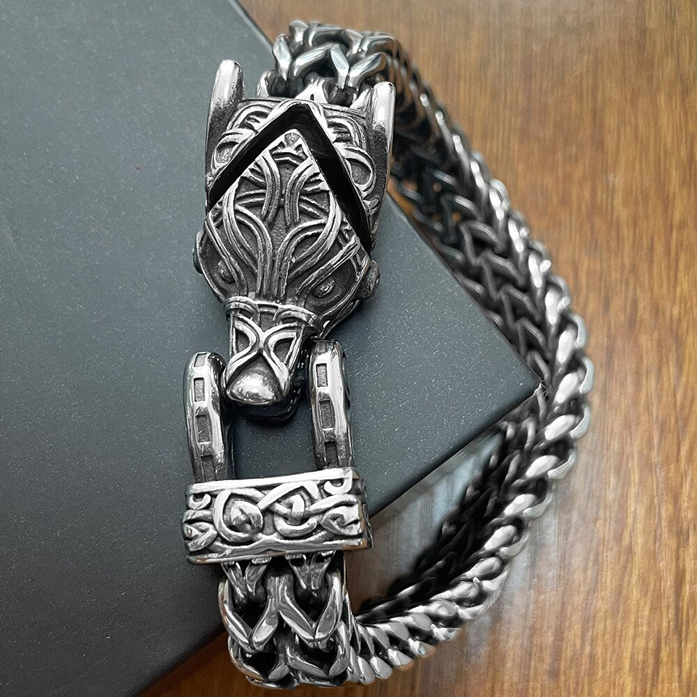 Nordic Viking Bracelet for Men Vintage Wolf Head Scandinavian Bracelet Men's 12MM Width S.Steel Square Franco Link Curb Chain