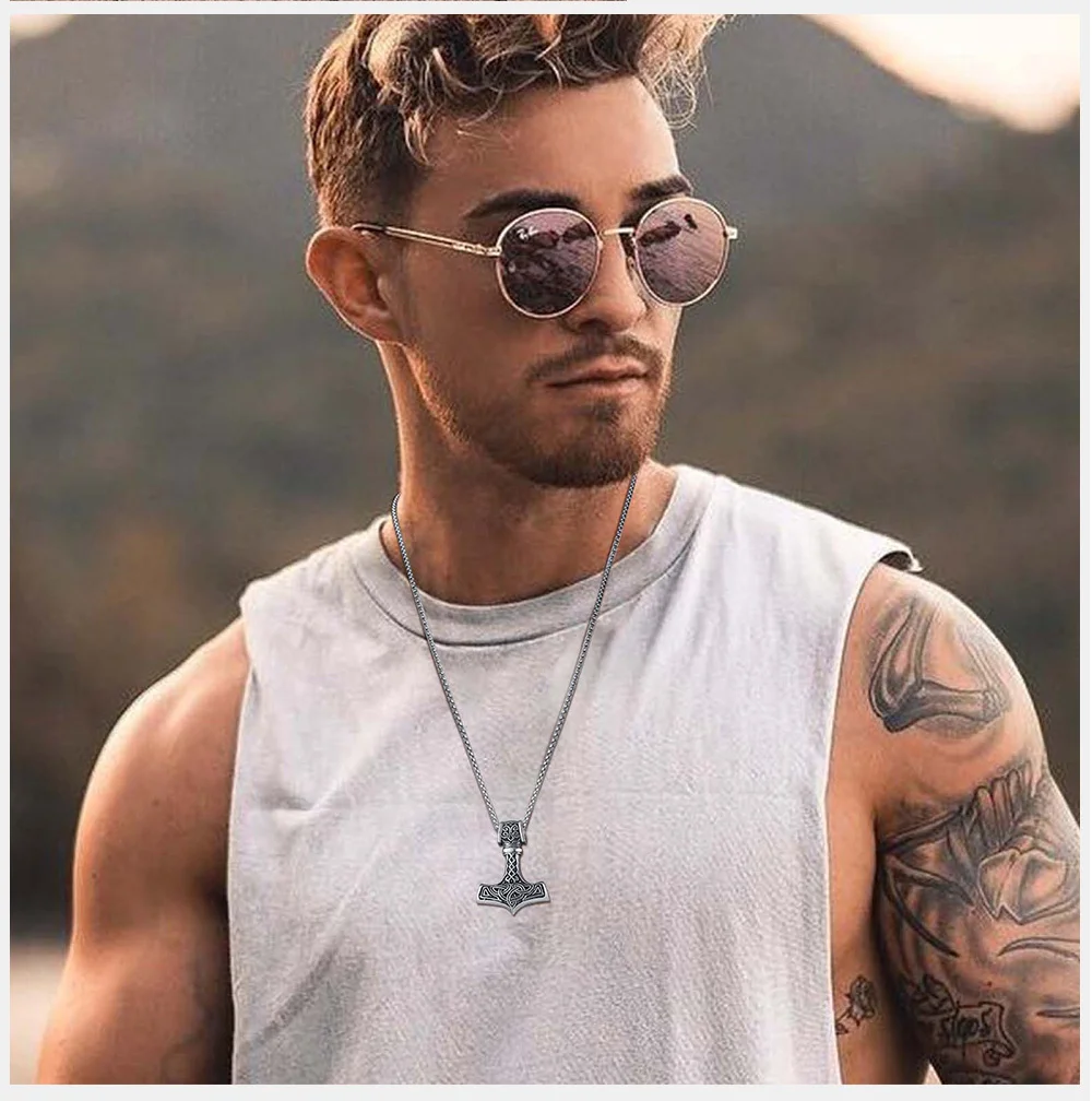 Norse Viking Thor's Hammer Talisman Necklace,Steel Alloy War Axe Odin's Wolves Men Jewelry,Nordic Amulet Rune Compass Fenrir