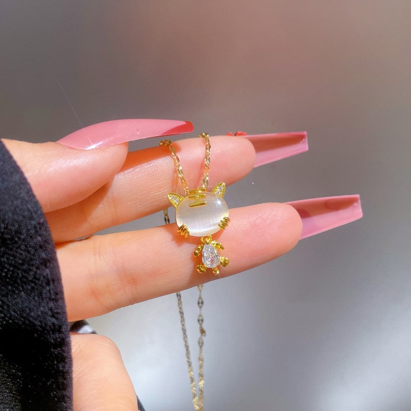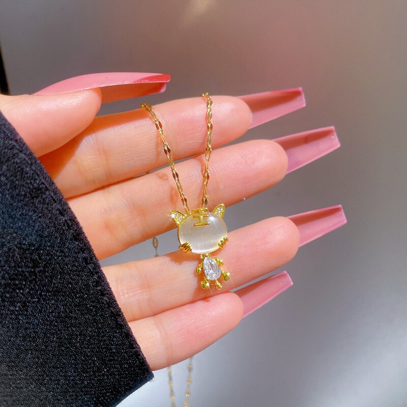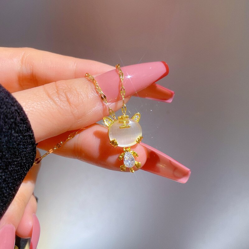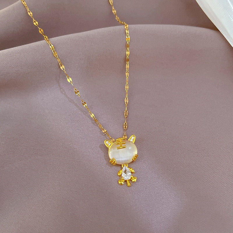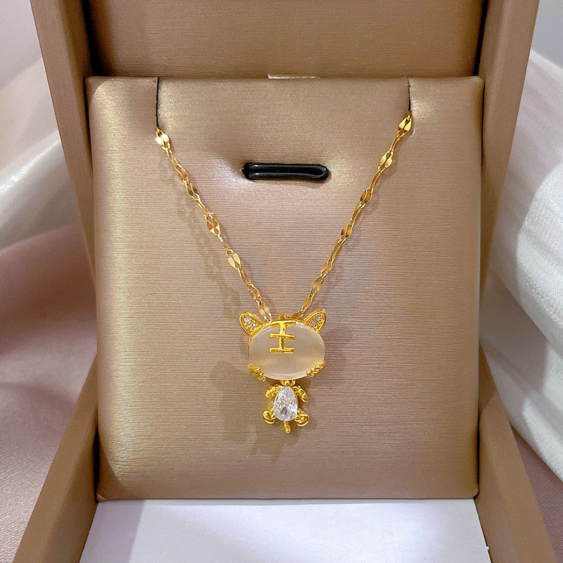 585 Gold Jewelry-Stainless Steel Opal Little Tiger Necklaces For Women Zircon Cute Animal Pendant Chain Choker Necklace Jewelry Gift