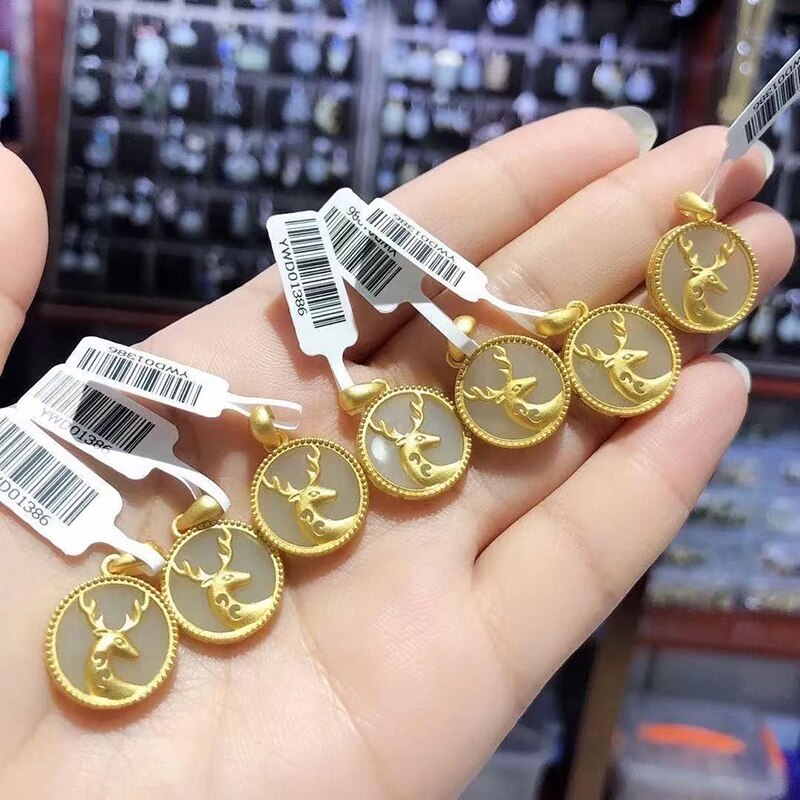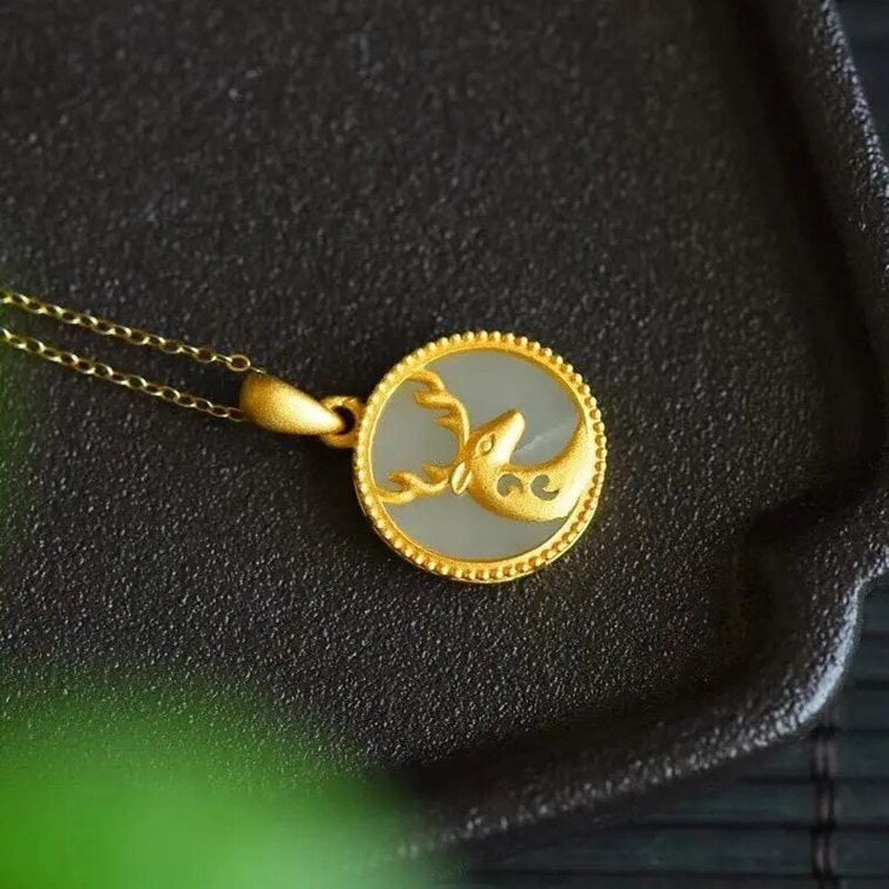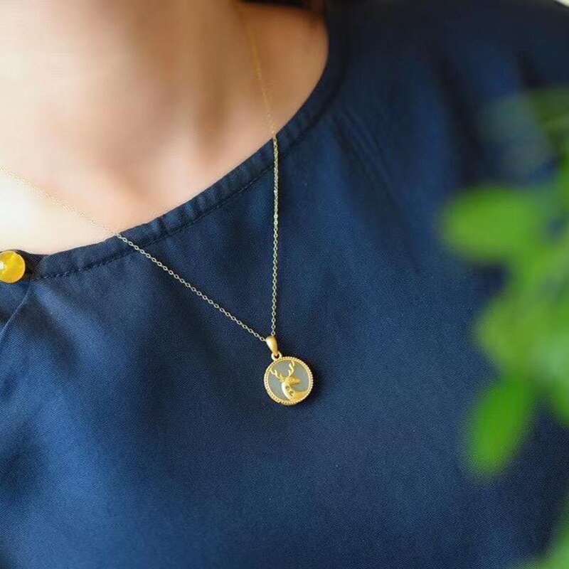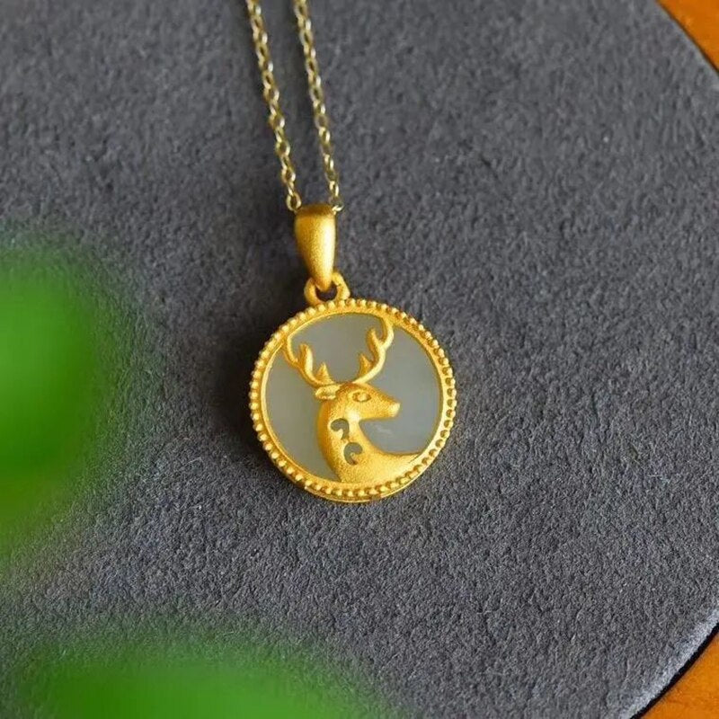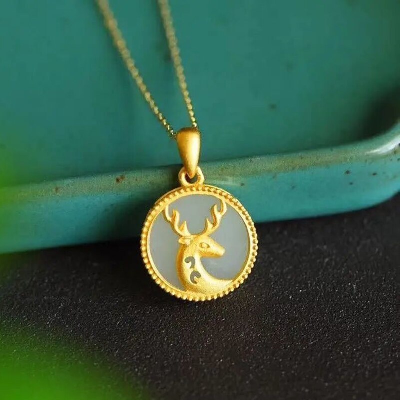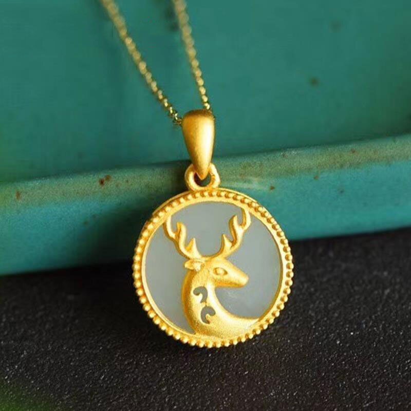 Original Ancient Gold Craft Natural Hetian Jade Round Fawn Necklace for Women