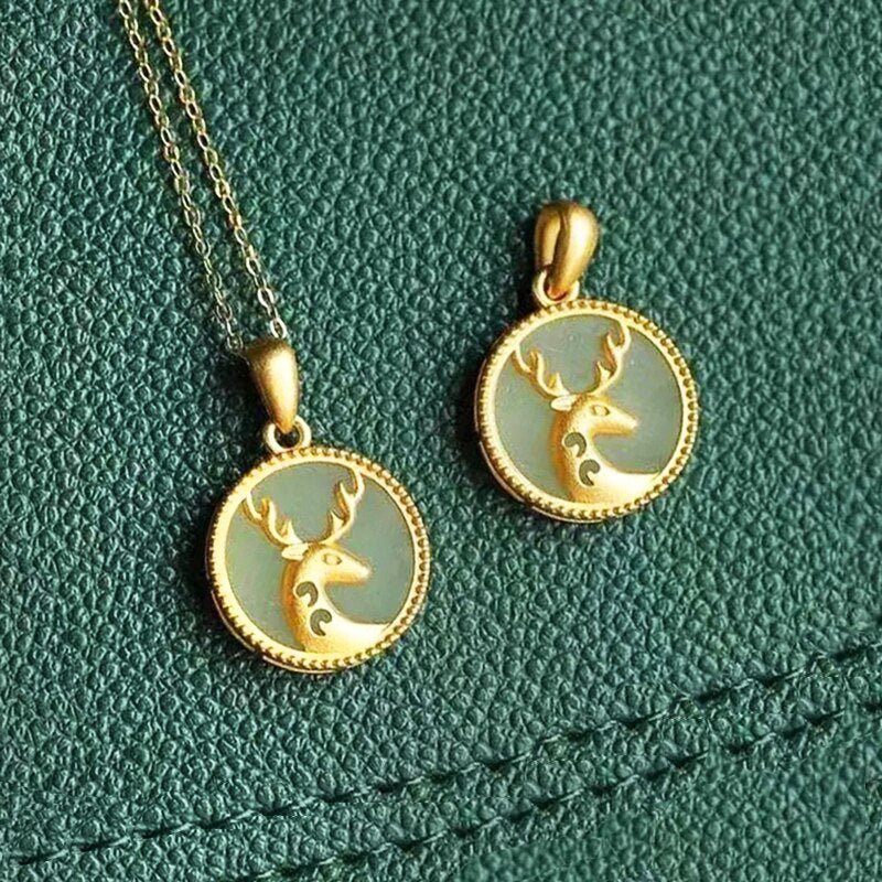 Pendants-Original Ancient Gold Craft Natural Hetian Jade Round Fawn Necklace for Women's Exquisite and Elegant Charm Jewelry