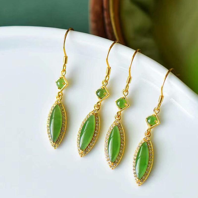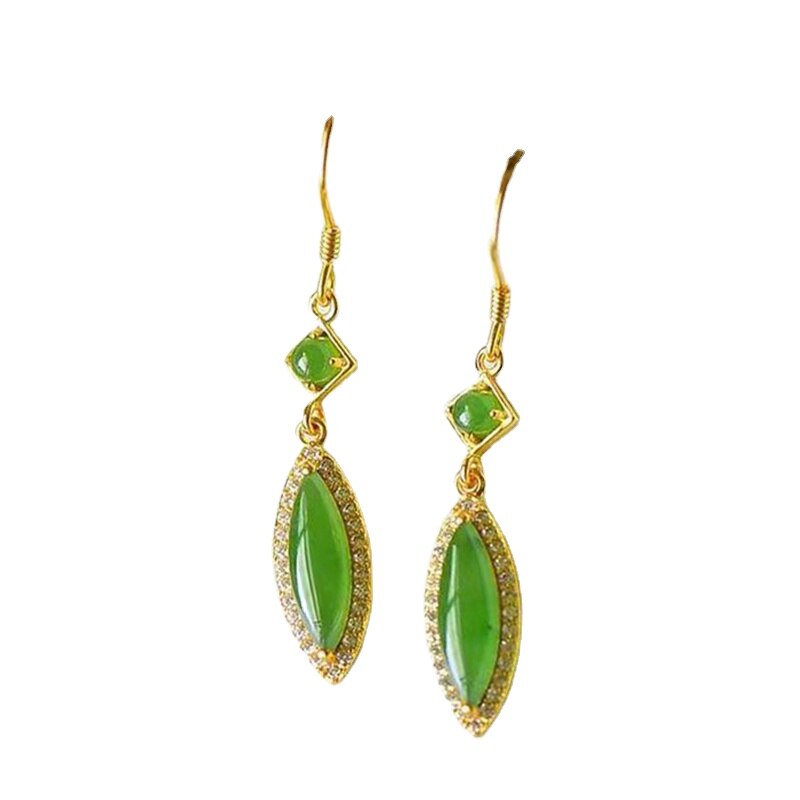Drop Earrings-Original Design Diamond Natural Hetian Jade Sun Green Leaf Long Earrings Exquisite Fresh Chinese Style Jewelry Ladies