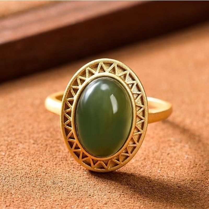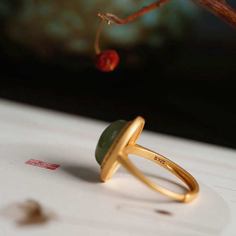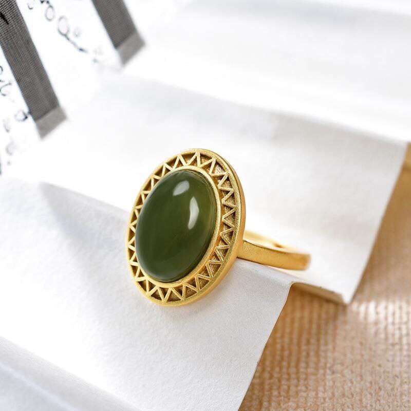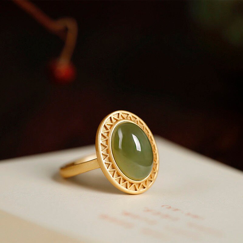 Cocktail Ring-Original design inlaid natural Hetian green jade oval opening adjustable ring Chinese charm and fresh women's jewelry