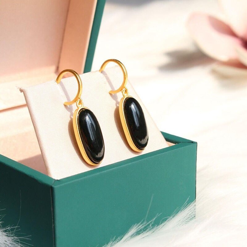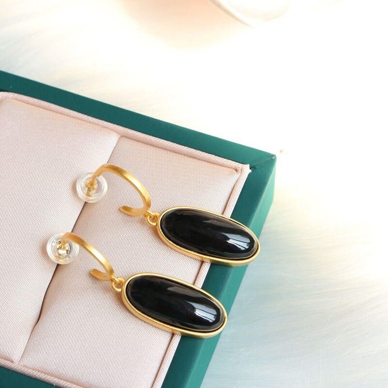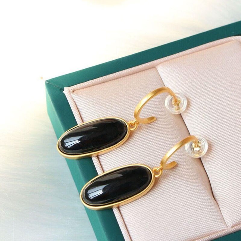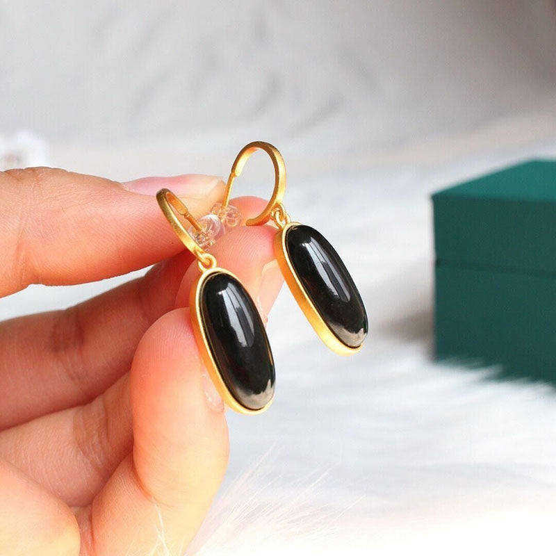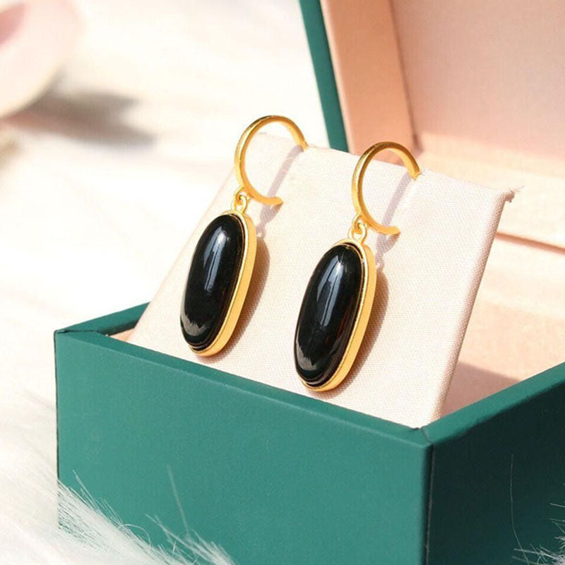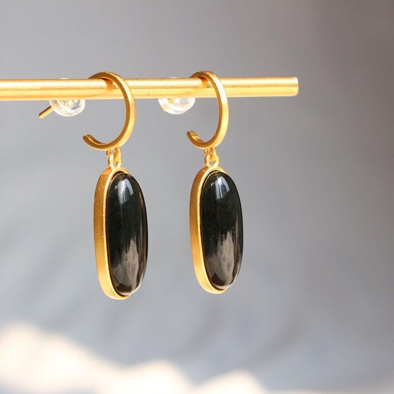 Drop Earrings-Original inlaid natural Hetian dark jade oval geometric earrings Chinese style classical gold-plated light luxury female jewelry