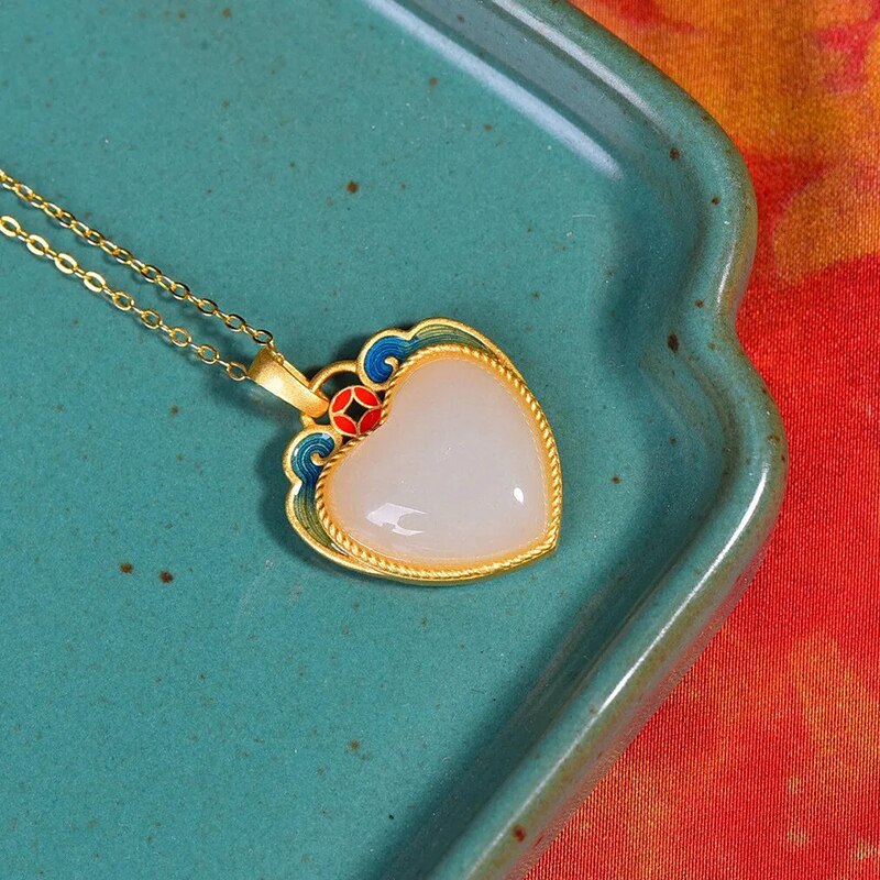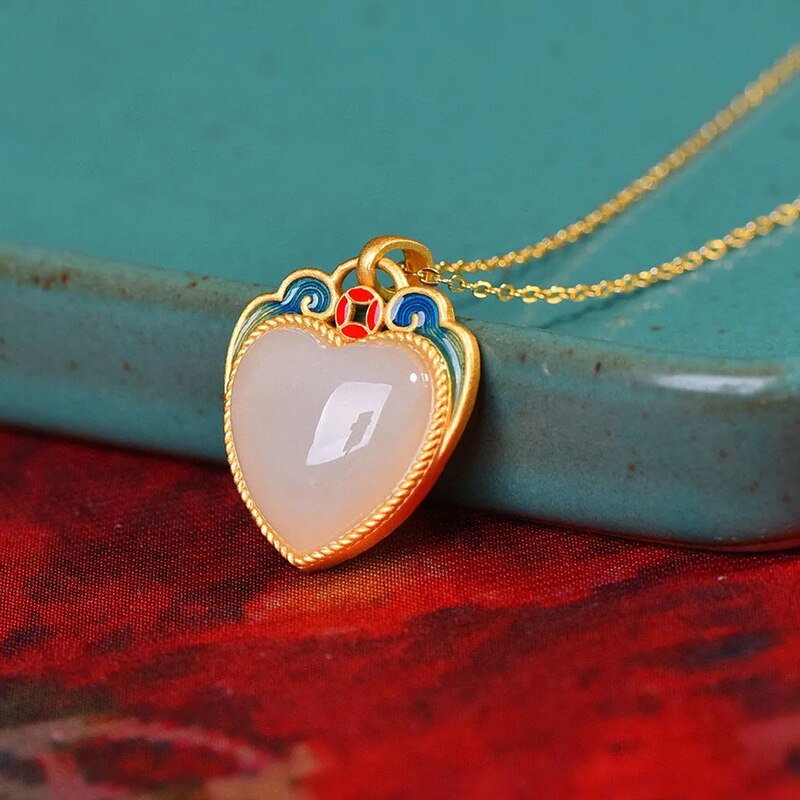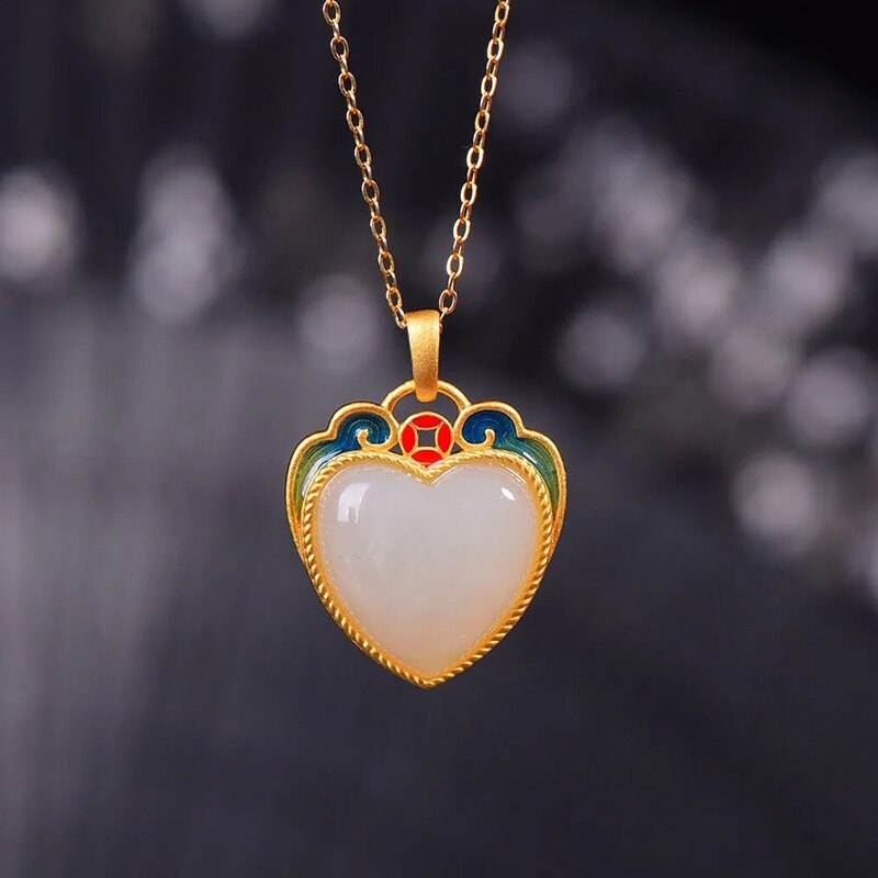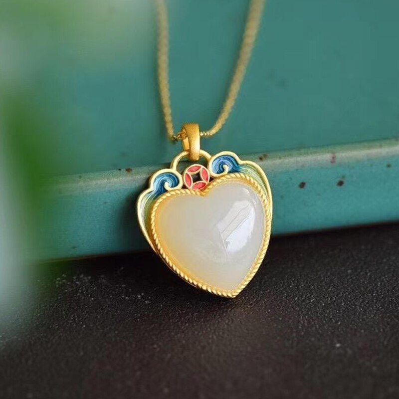 Pendants-Original Natural Hetian Jade Love Necklace Pendant Classical Enamel Porcelain Chinese Ancient Gold Craft Ladies Jewelry