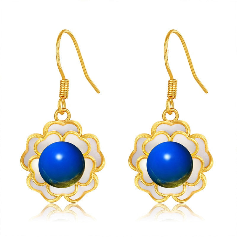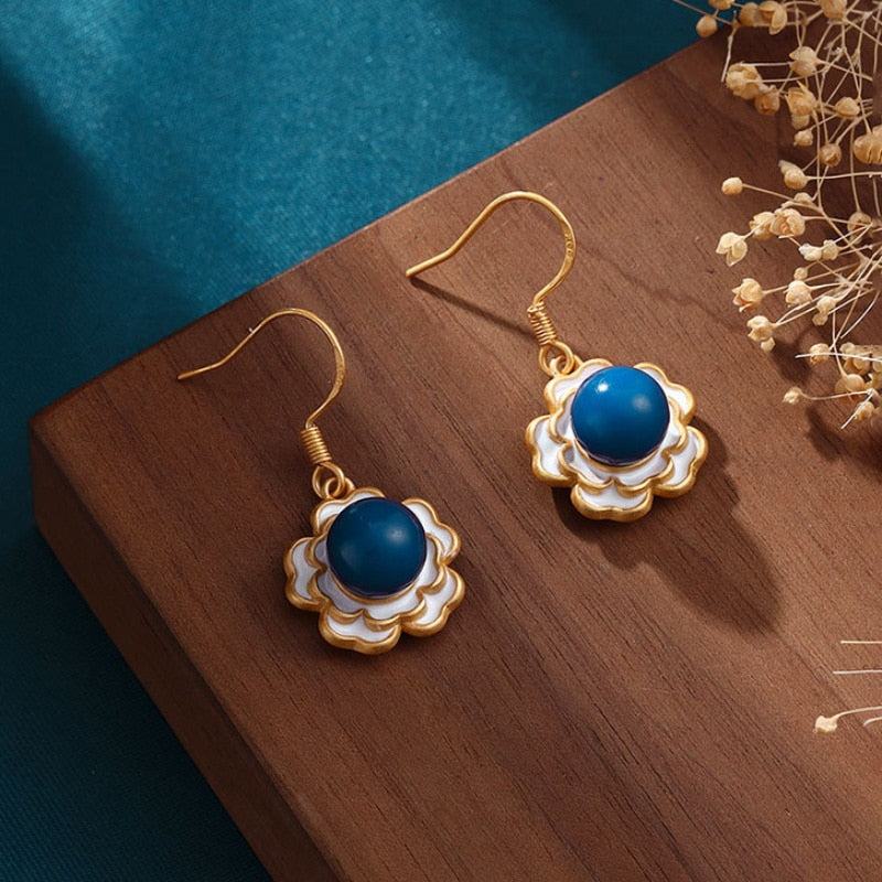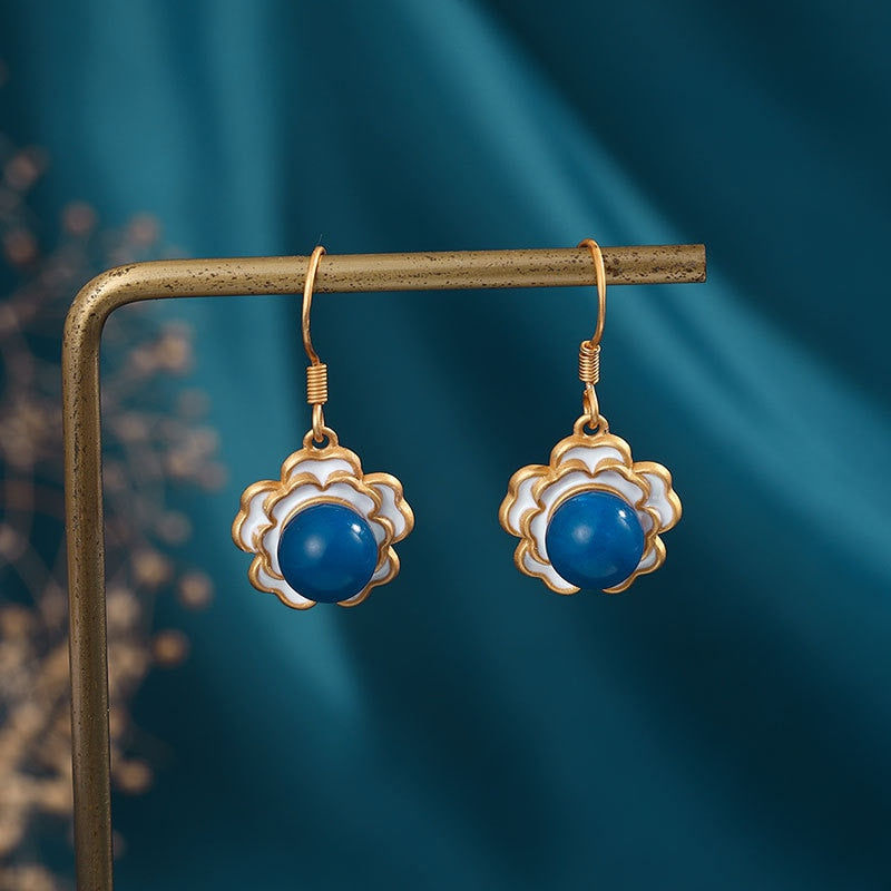 jade jewelry-Original vintage Chinese style enamel flowers inlaid lapis lazuli camellia earings for women Exquisite blue Eardrop jewelry