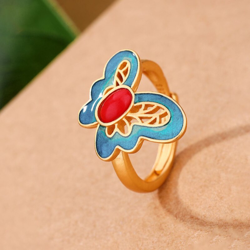 Cocktail Ring-Palace style design enamel craft inlaid southern red tourmaline butterfly rings for women retro Chinese style party jewelry