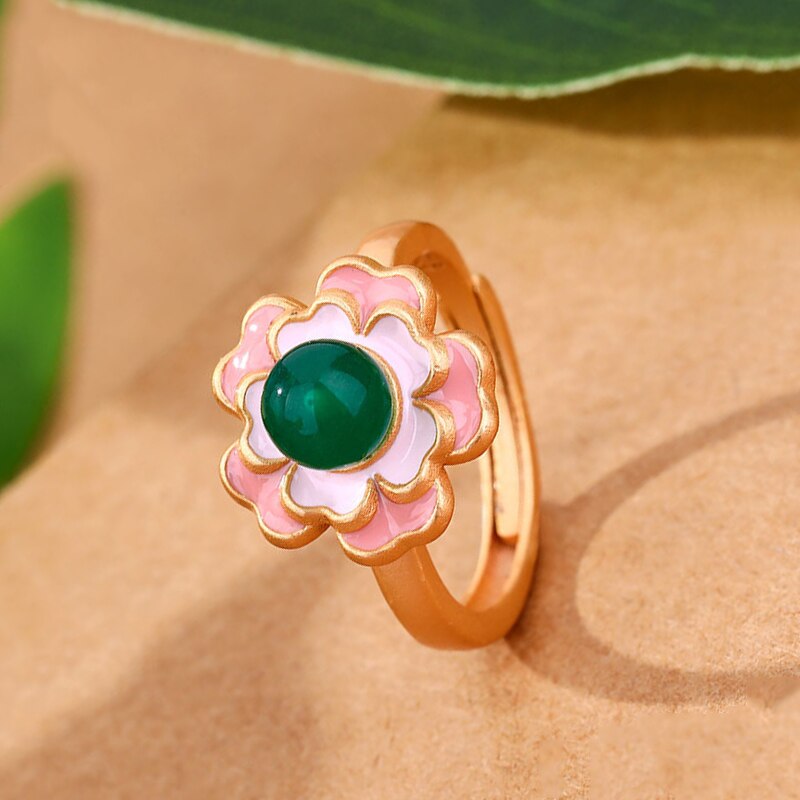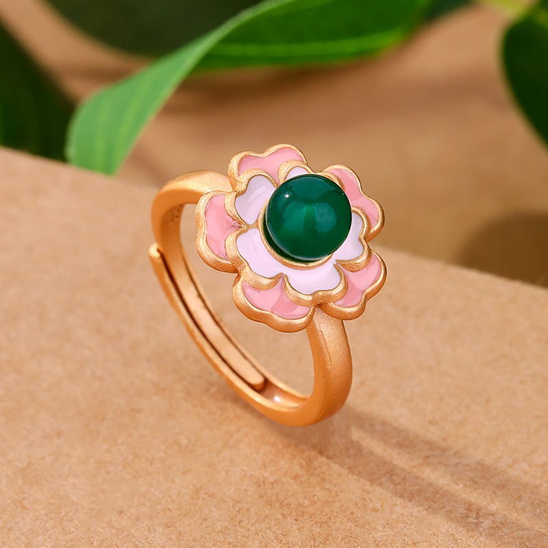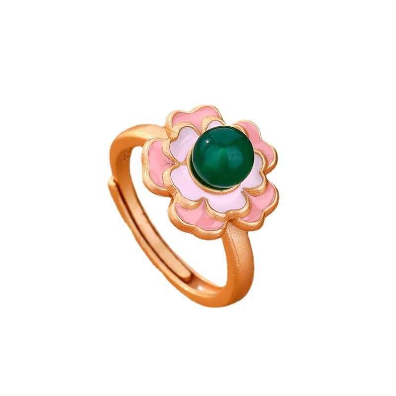 Palace style enamel pink flowers classic natural Hotan jasper beads rings for women
