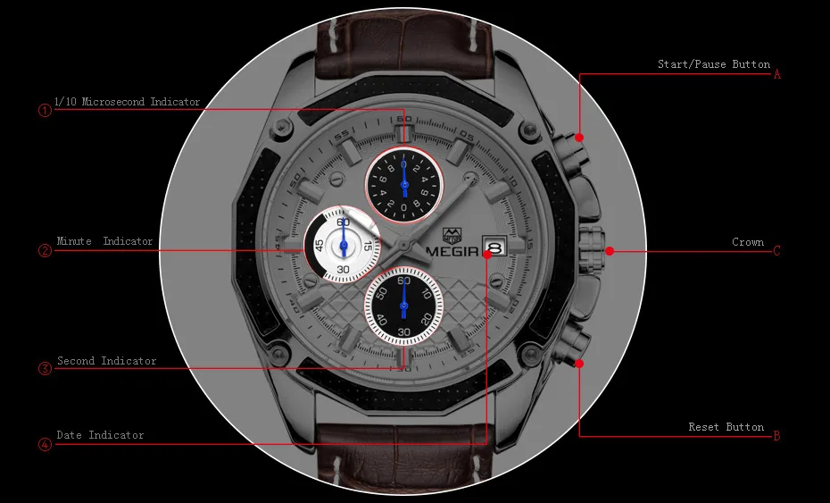Chronograph Indicator: three time keeping indicator: 1/10 microsecond, second, minute