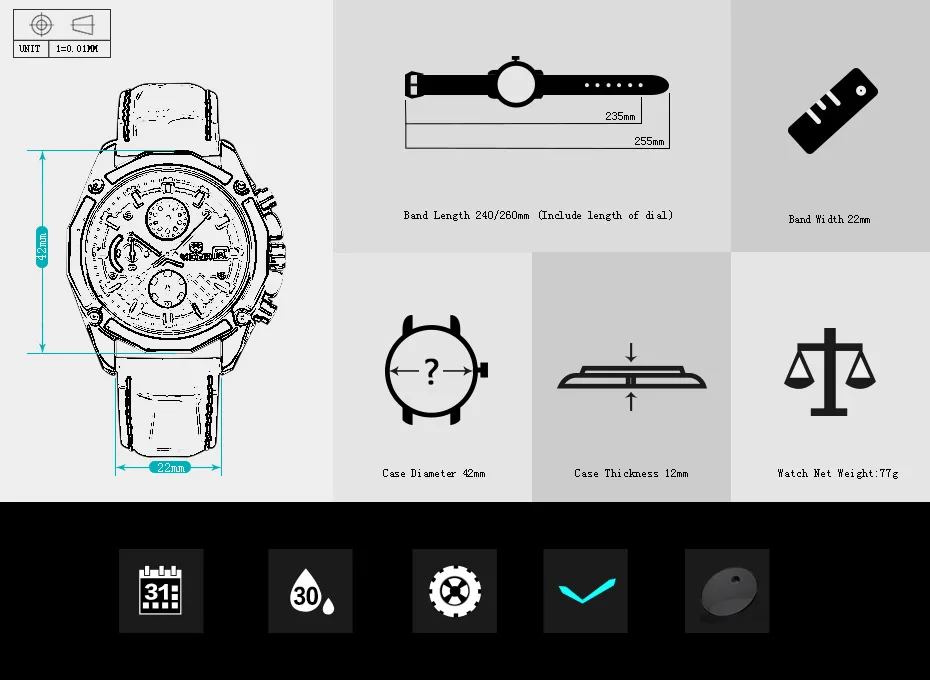 Water Resistant 3ATM , Luminous Hands, Multifunctional timer, Calendar
