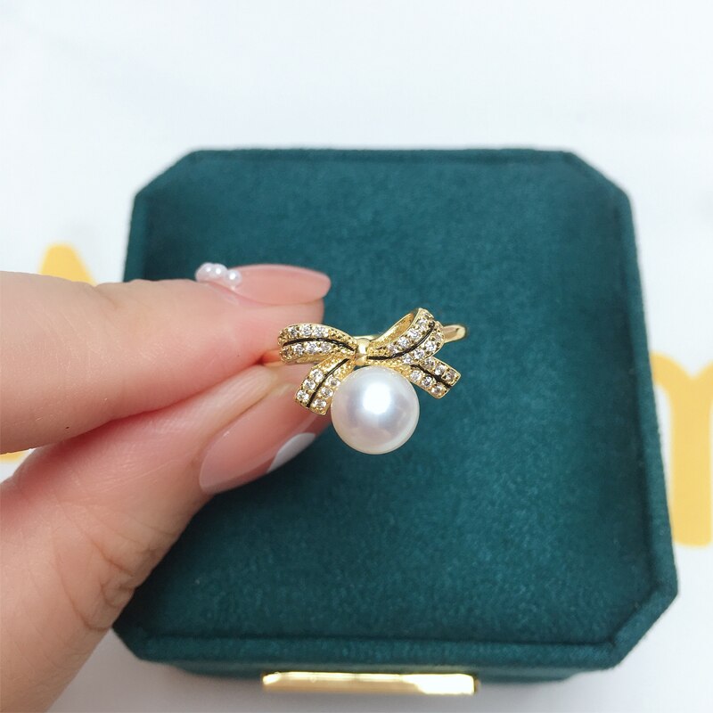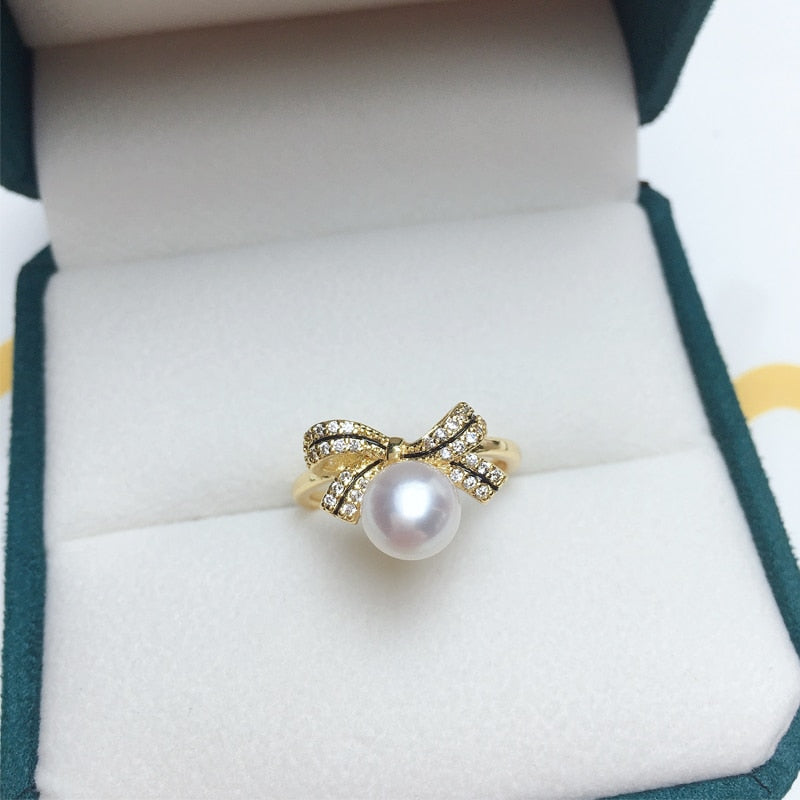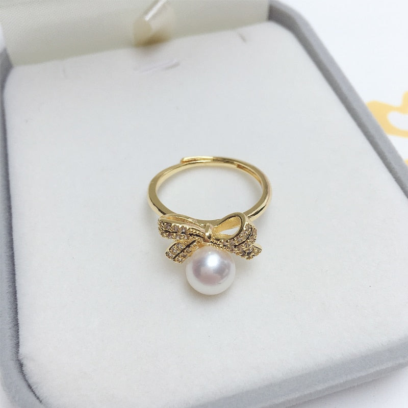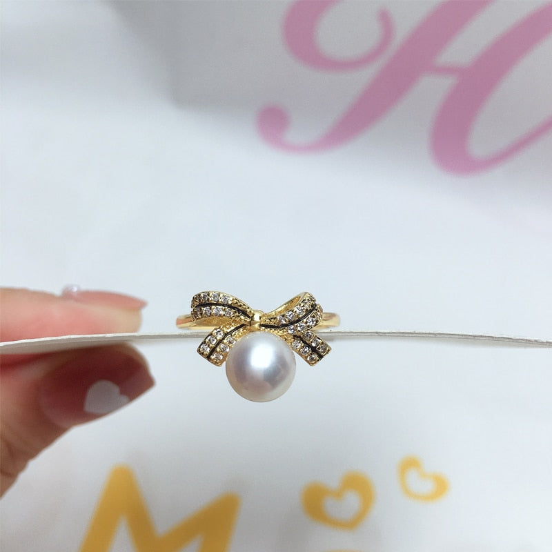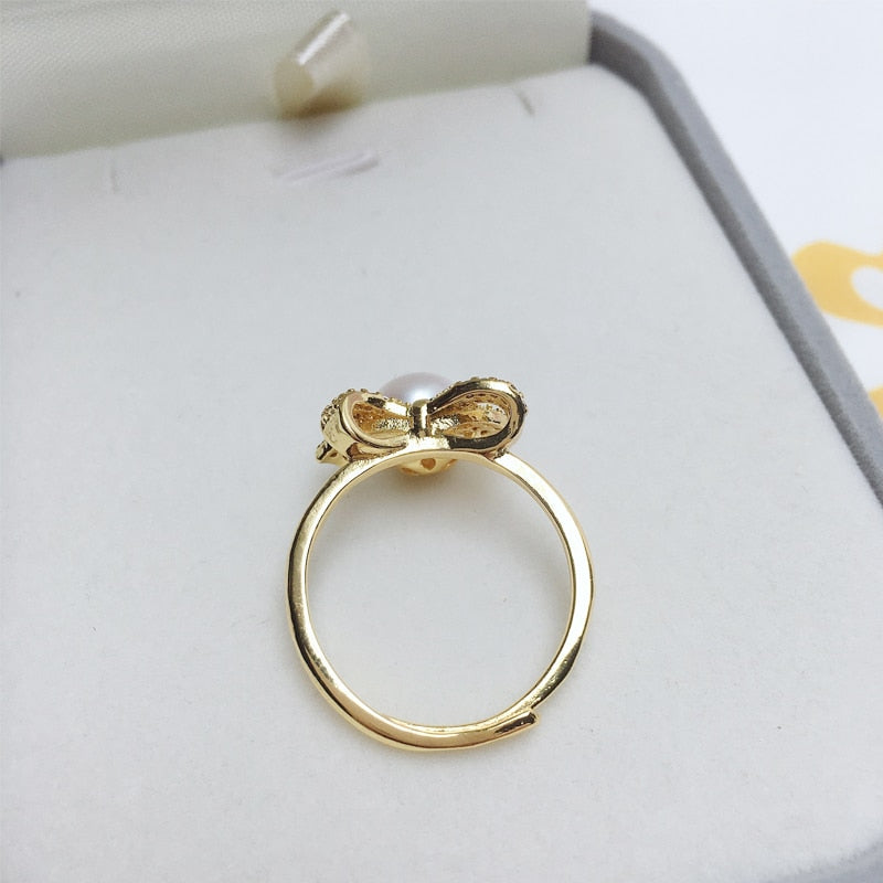 Real Natural Pearl Ring New Ins Personality Exquisite Bow 14K Gold Gild Design Female Girl Ring