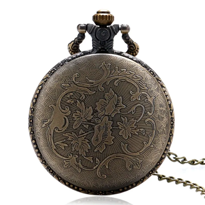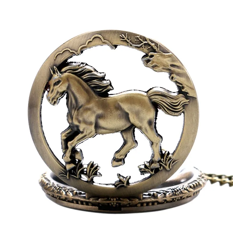 Pocket & Fob Watches-Retro Bronze Hollow Horse Case Design Quartz Pocket Watch With Necklace Chain Pendant Jewelry Gift For Birtday Christmas