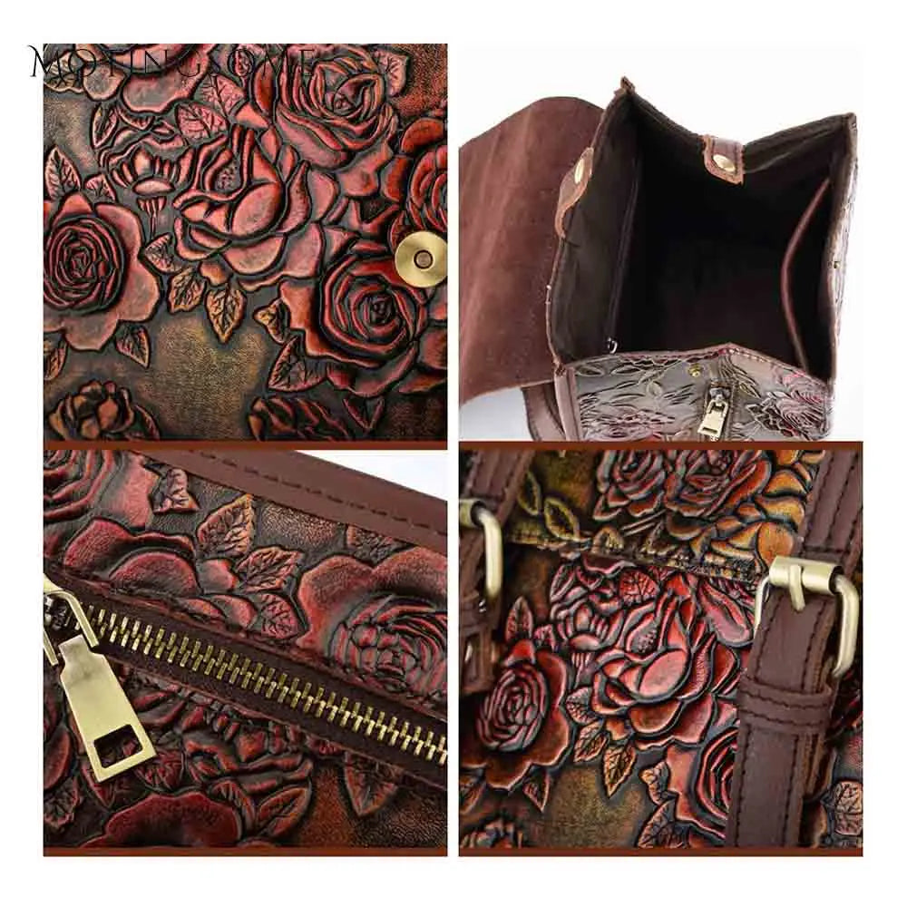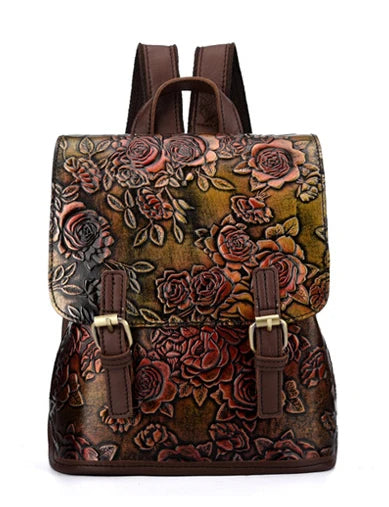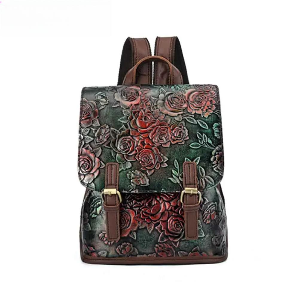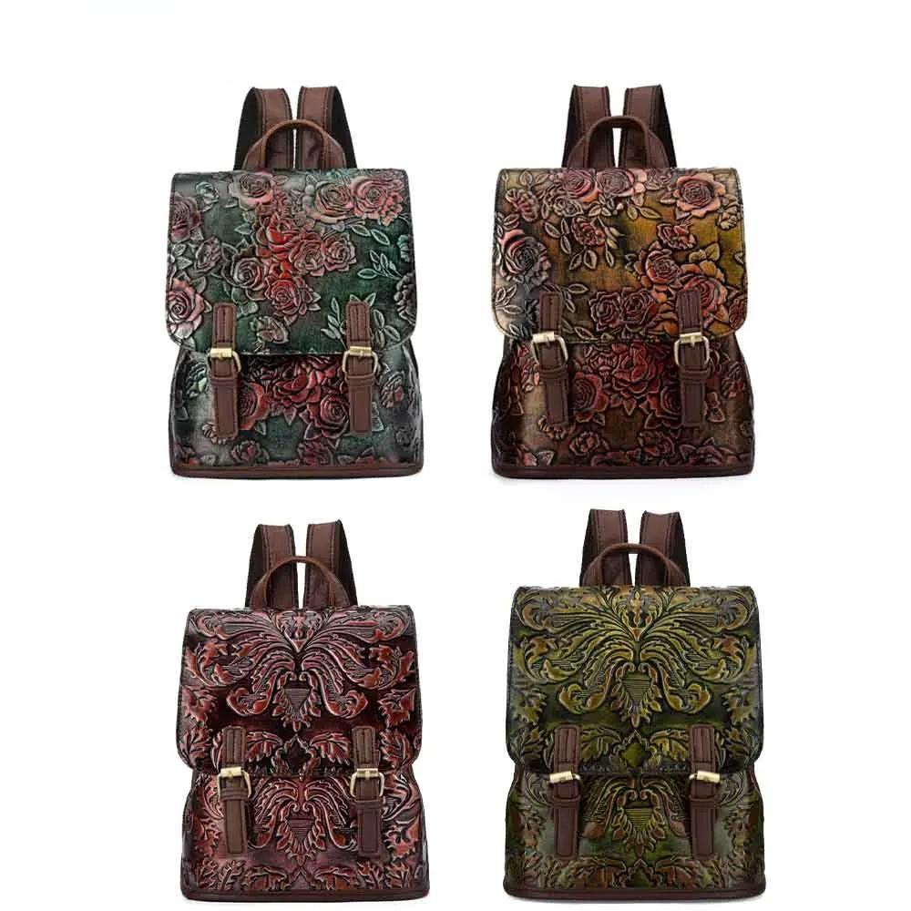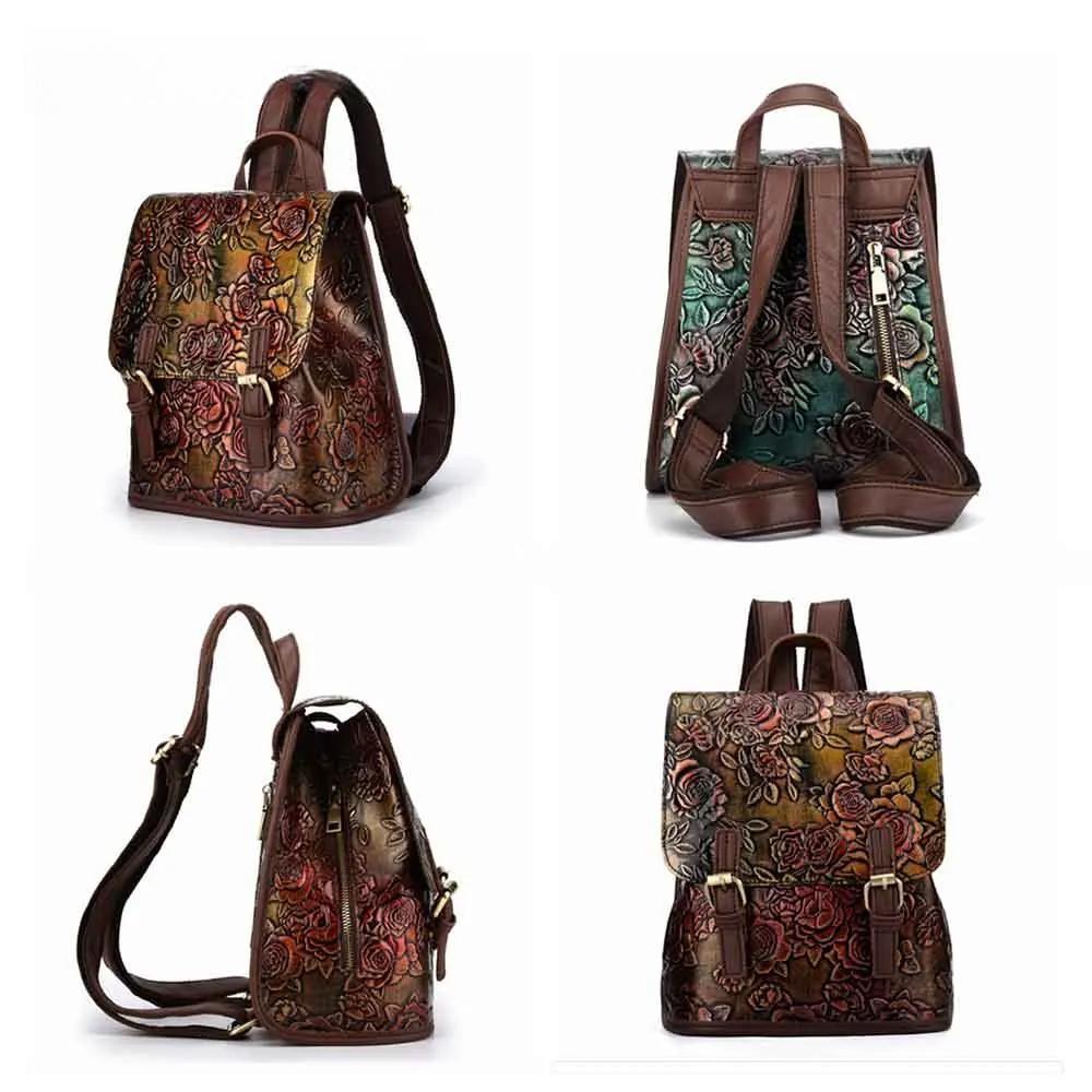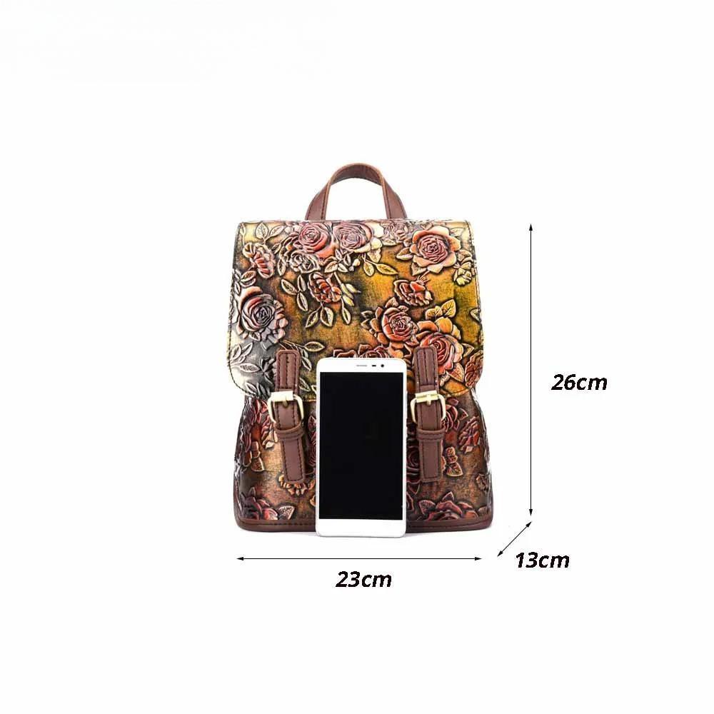 Retro Style Genuine Leather Women Backpack Embossing Rose Flowers Pattern 100% Real Cowhide Luxury School Bag Mochila New