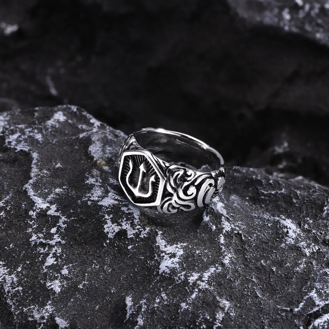 Retro Trident Signet Ring for Men Boys,Punk Stainless Steel Stamp Ring
