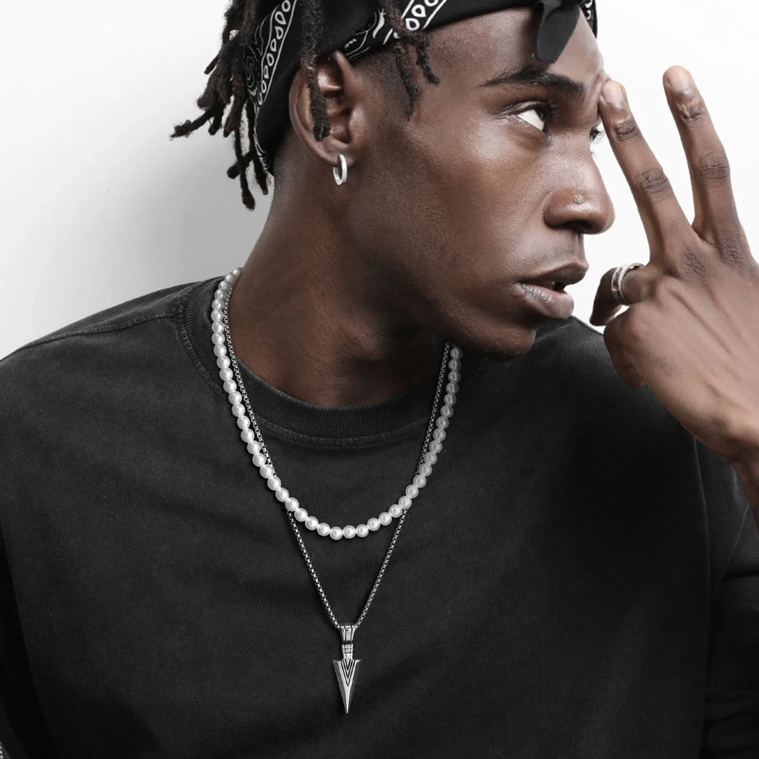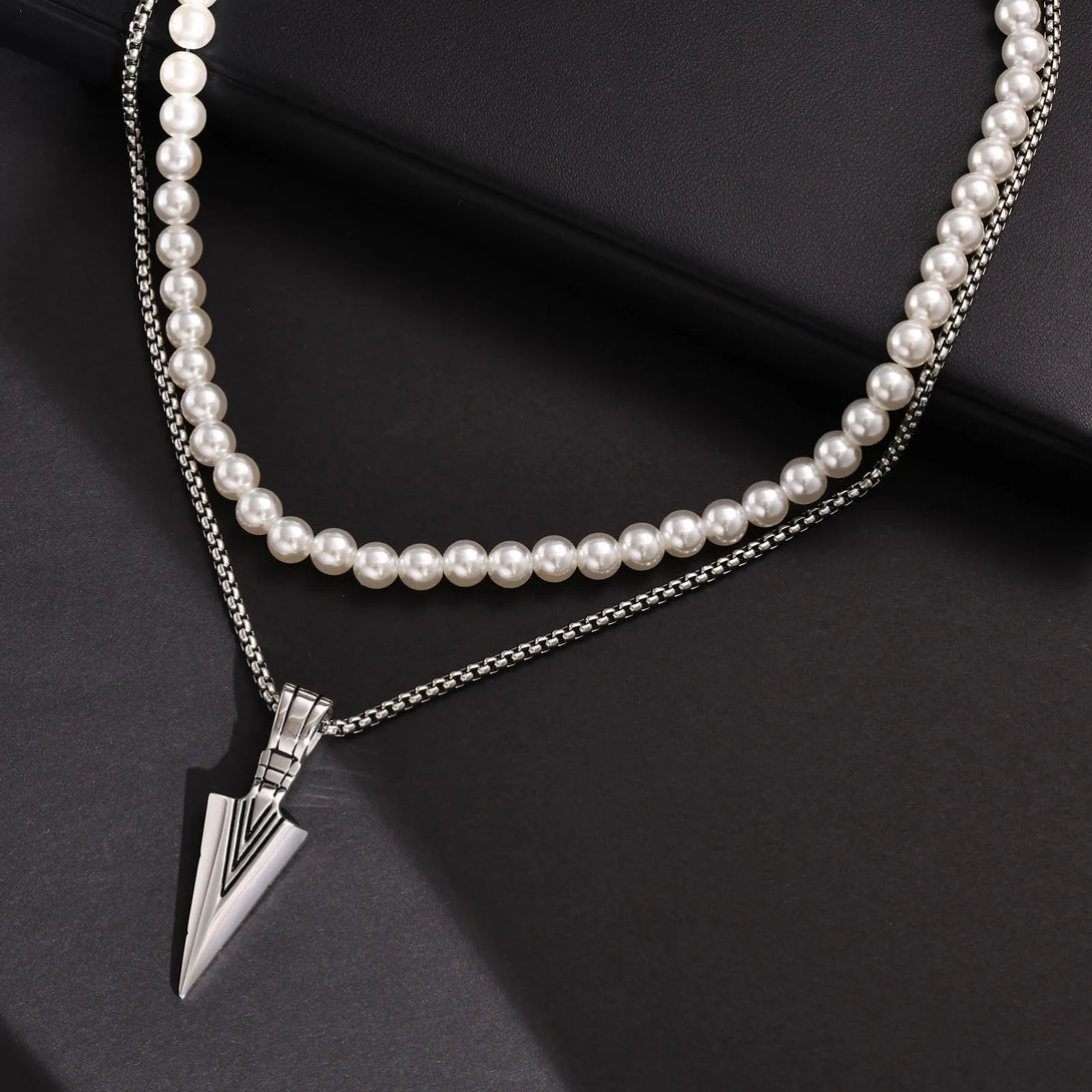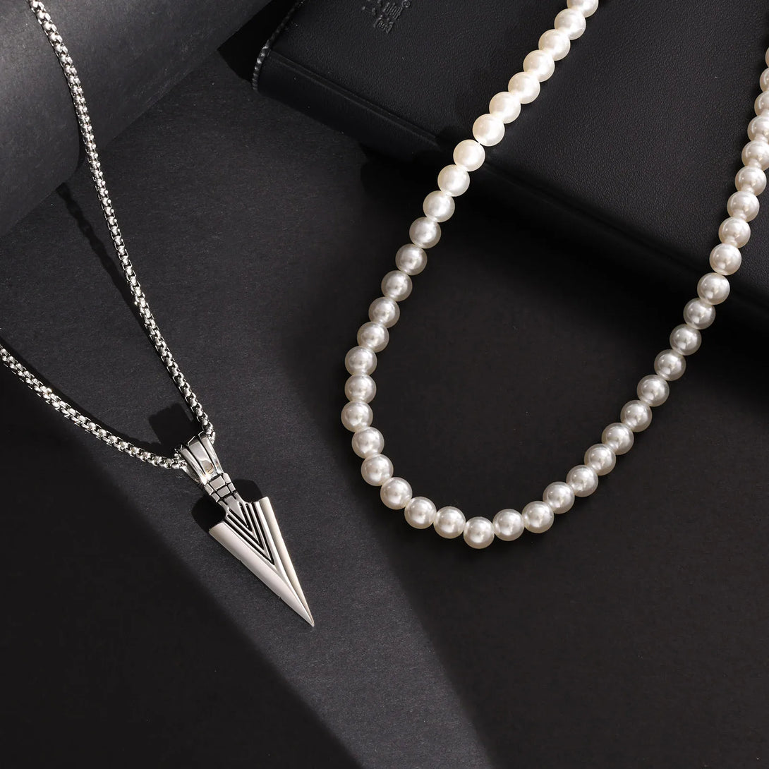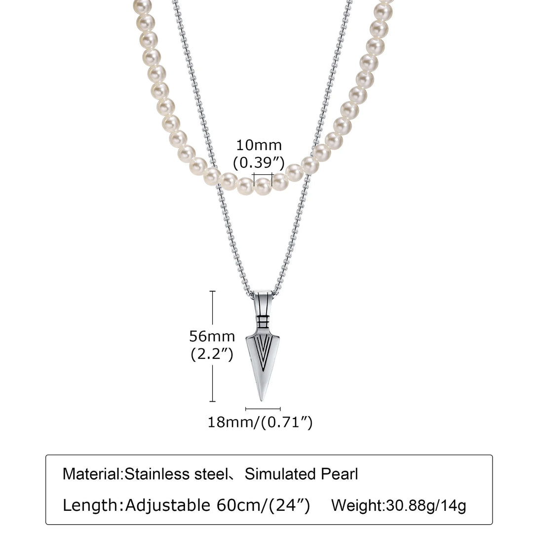 Rock Punk Stainless Steel Arrowhead Primal Necklaces for Men Tribal Spearhead Surf Jewelry with 8MM Simulated Pearl Chain Collar