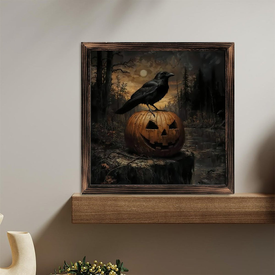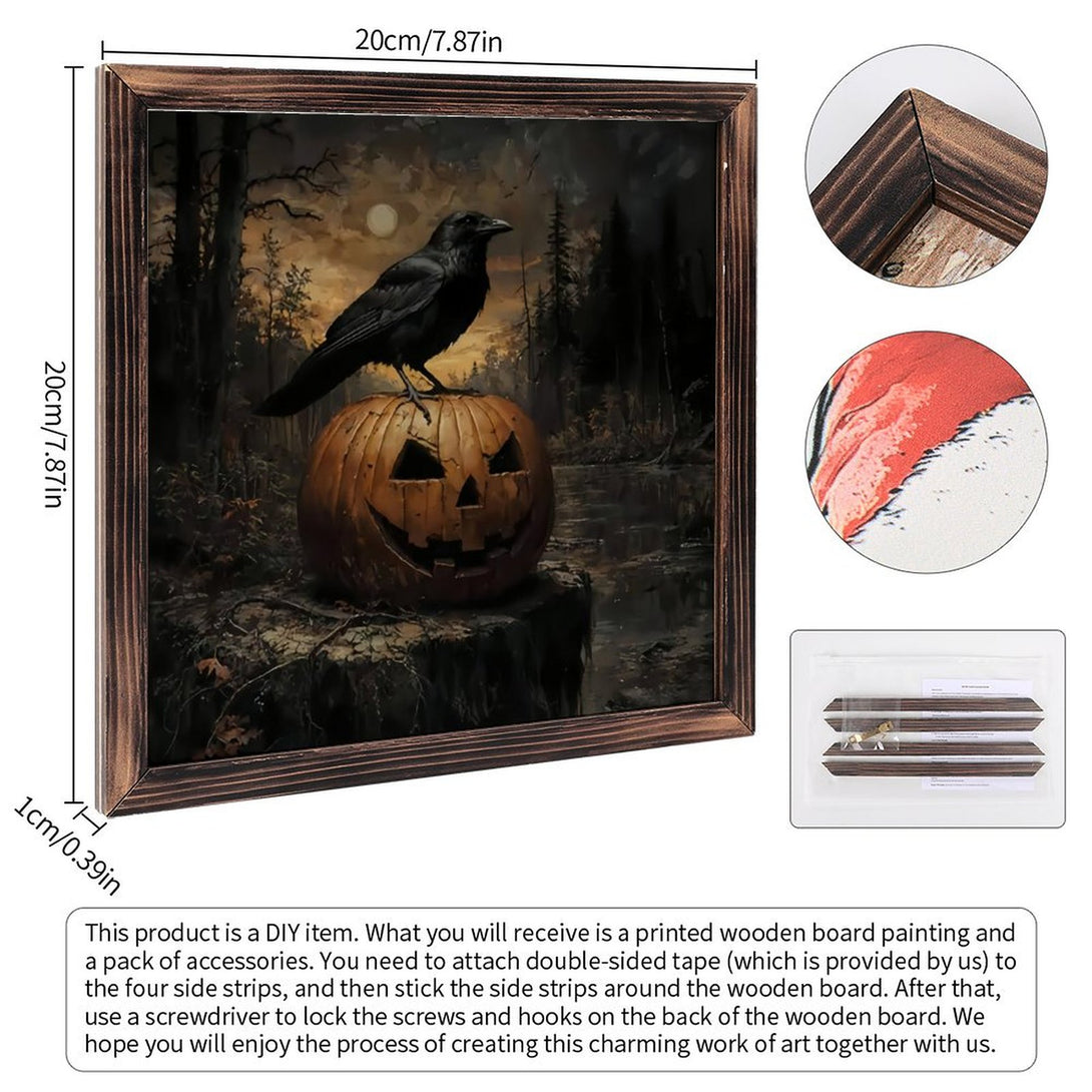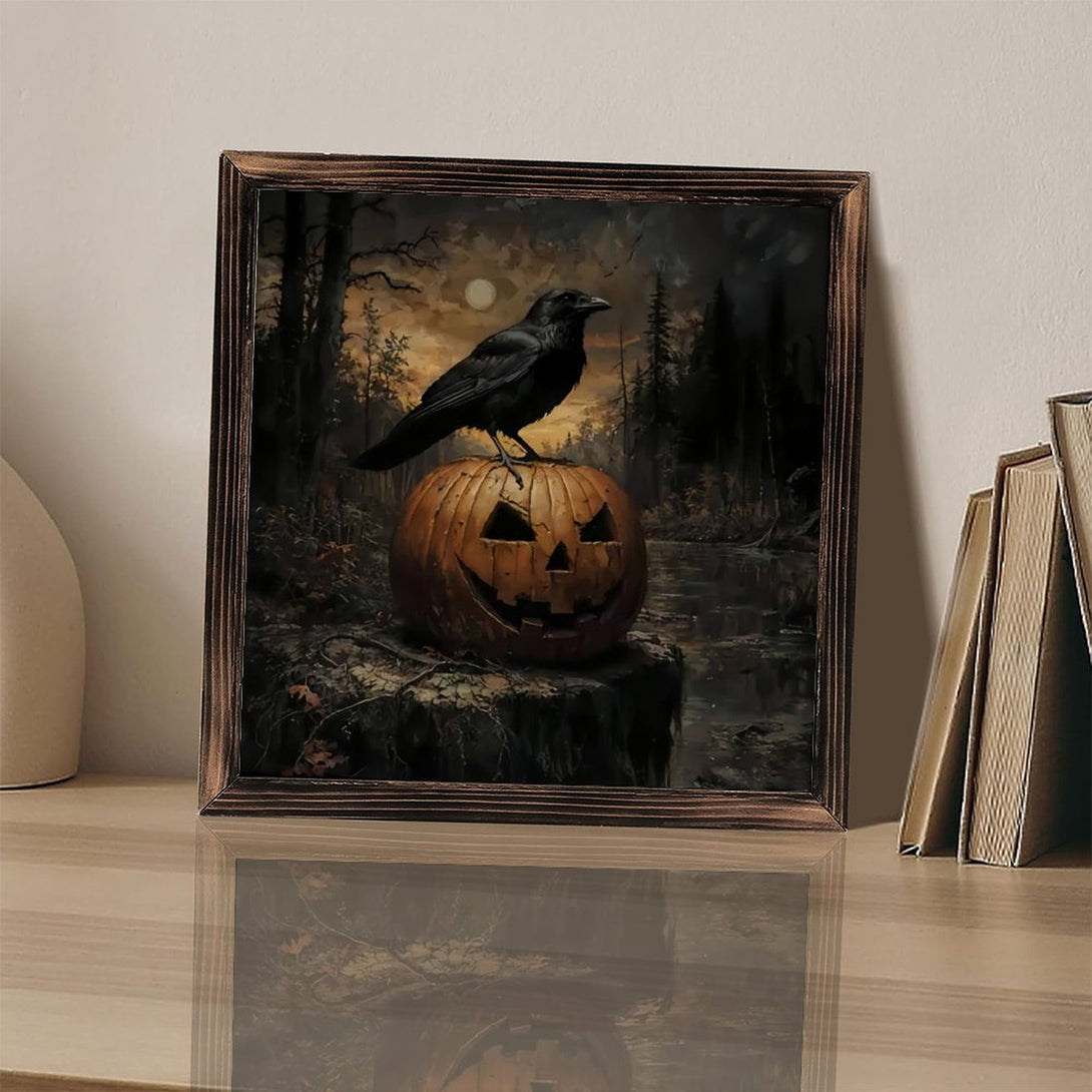 Room Decor Photo Frame Art Prints: Halloween- Night Scene Wood Wall Art Black Crow with Pumpkin Decor Spooky Forest Painting Print Haunted Gothic Poster Gift Ready to Hang.08×08inch