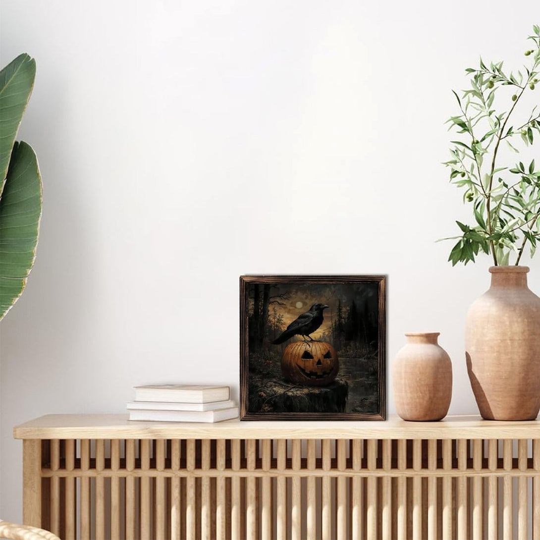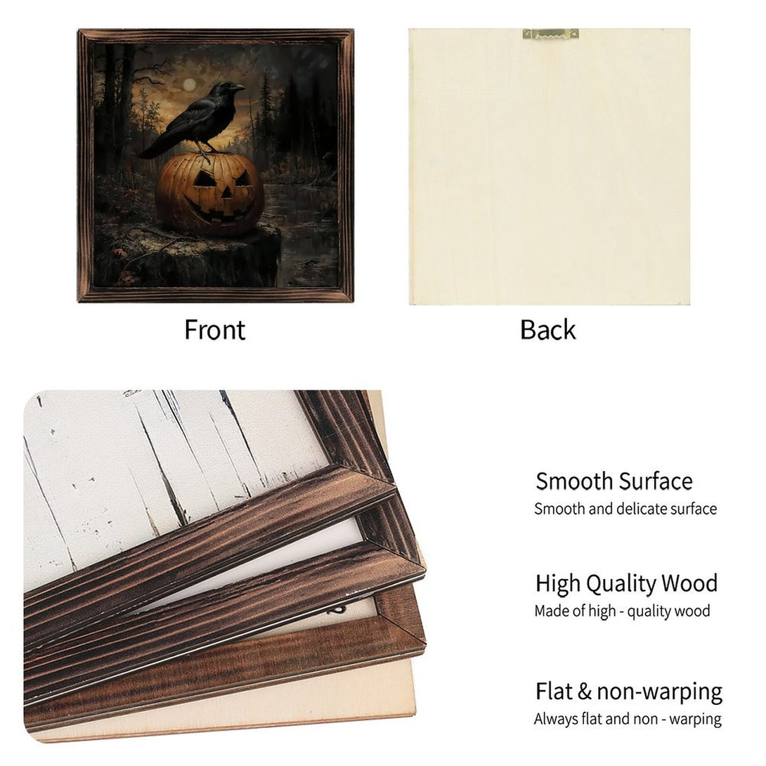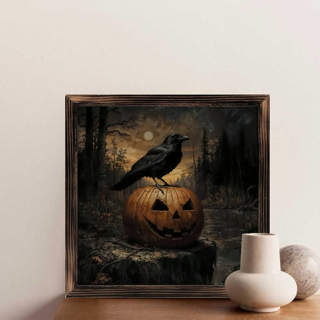 Room Decor Photo Frame Art Prints: Halloween- Night Scene Wood Wall Art Black Crow with Pumpkin Decor Spooky Forest Painting Print Haunted Gothic Poster Gift Ready to Hang.08×08inch